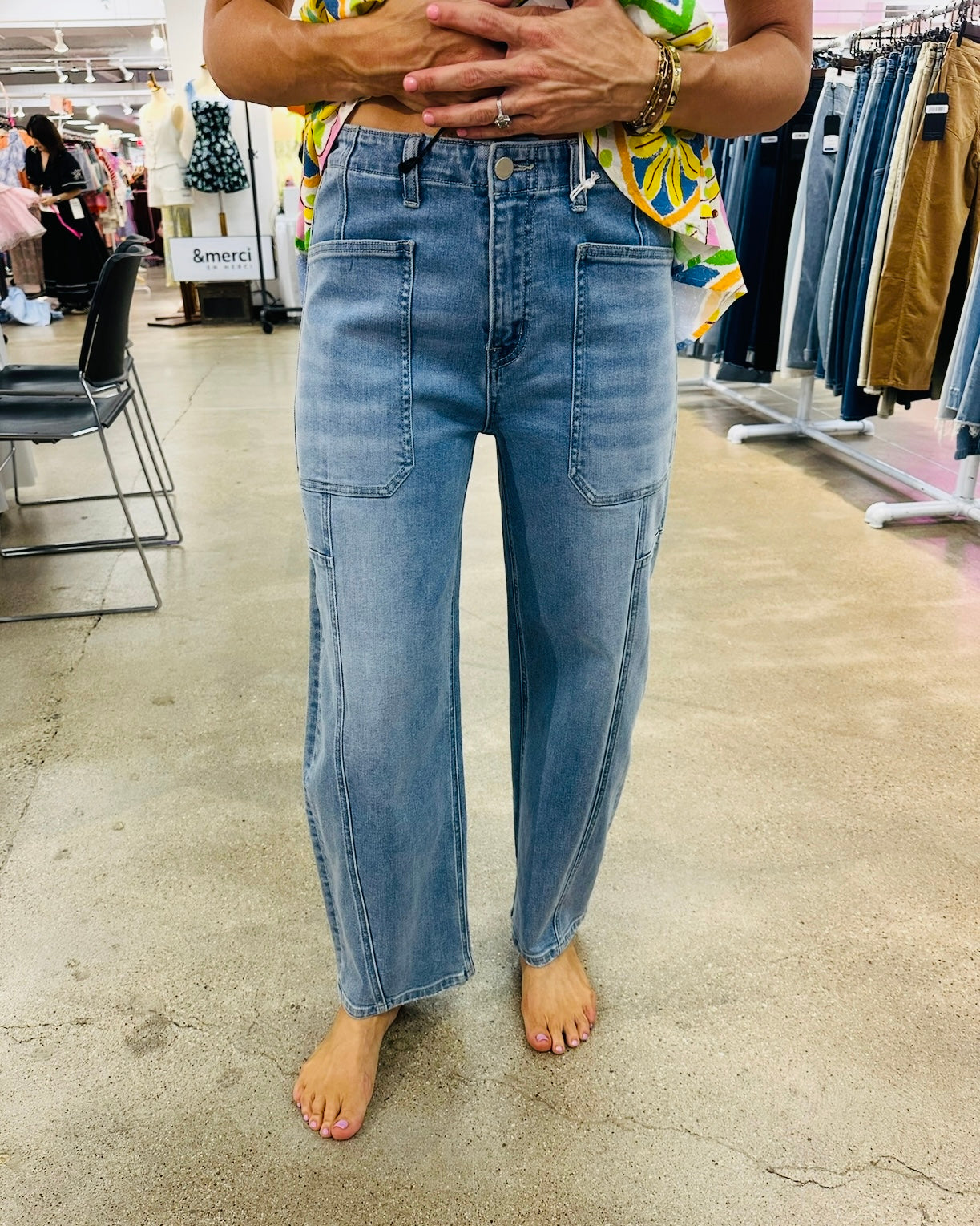 Strut your stuff in our Accomplishments HR Elastic Barrel Jeans! These blue beauties feature a high-rise waist with a comfy elastic band that hugs in all the right places. The cropped length and barrel silhouette add a playful twist to classic denim, while the stretch fabric ensures you can dance, lounge, or conquer your day without restriction. Finished hems give these jeans that perfect polished look!