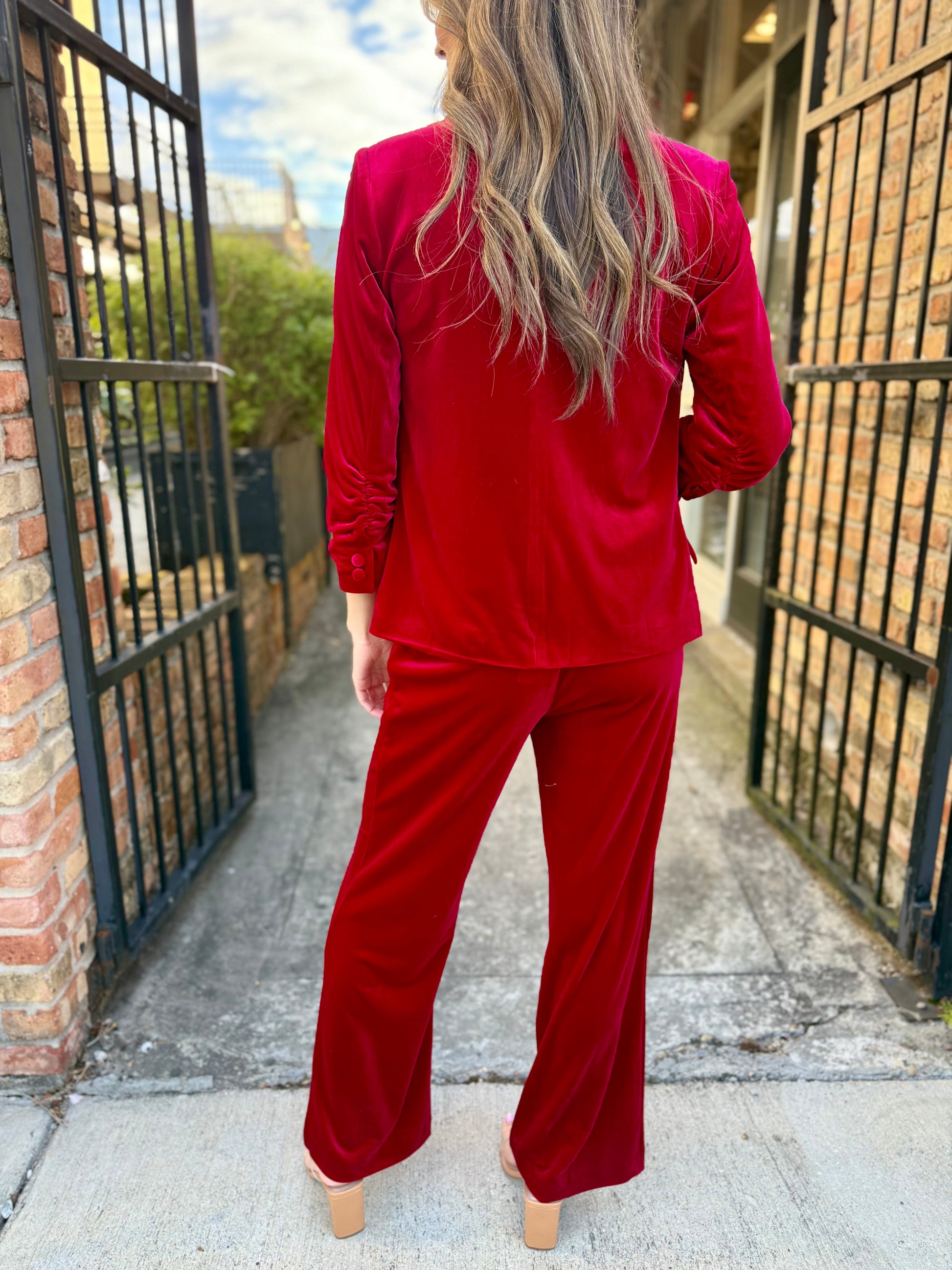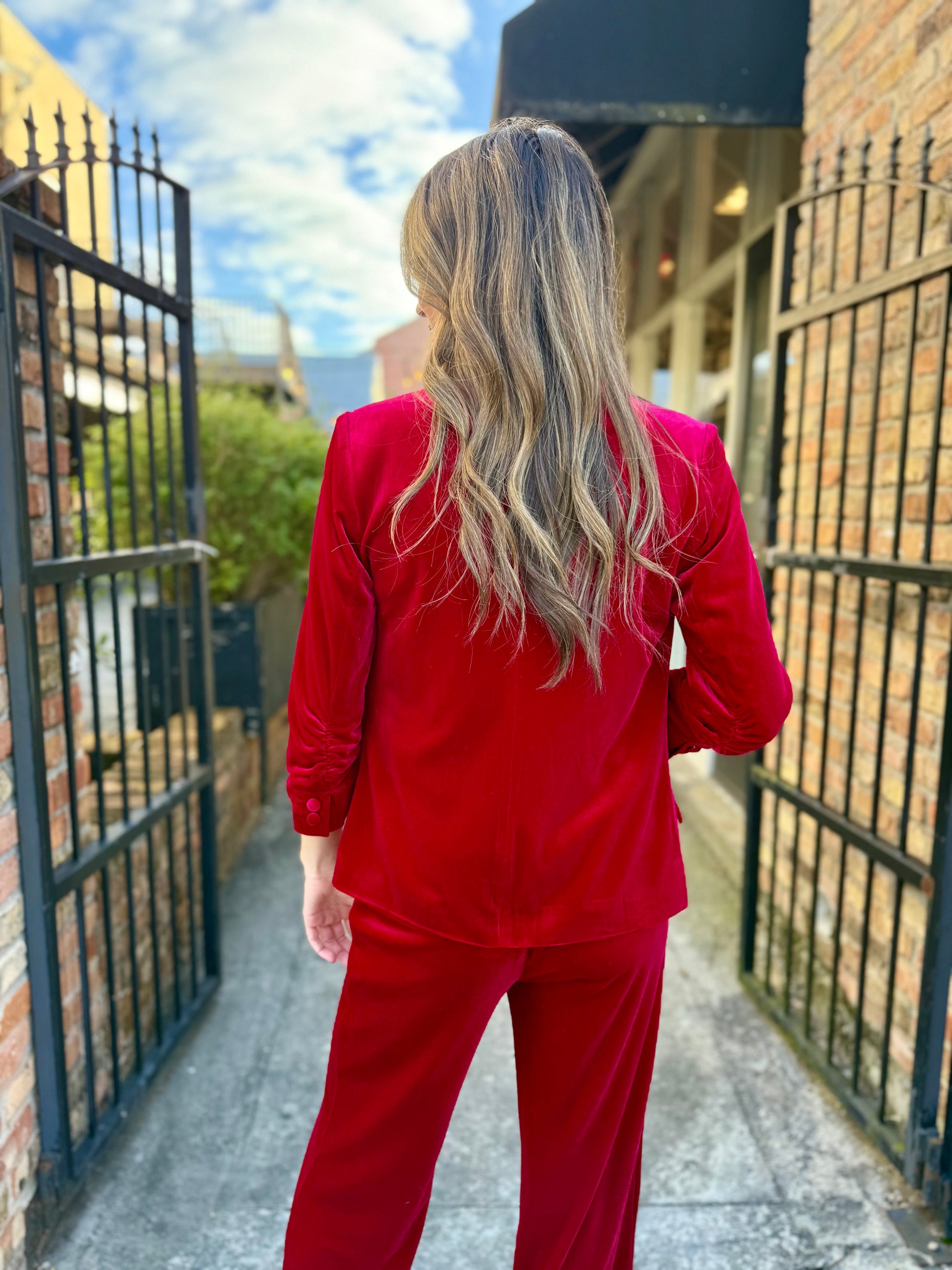 This Ashley Velvet Blazer is perfect for the holiday season. Cut from soft velvet fabric, this sophisticated blazer is a customer favorite for a reason. The Ashley Velvet Blazer is sure to make a lasting impression. Make it a fabulous set look with the Ashley Velvet Pants.