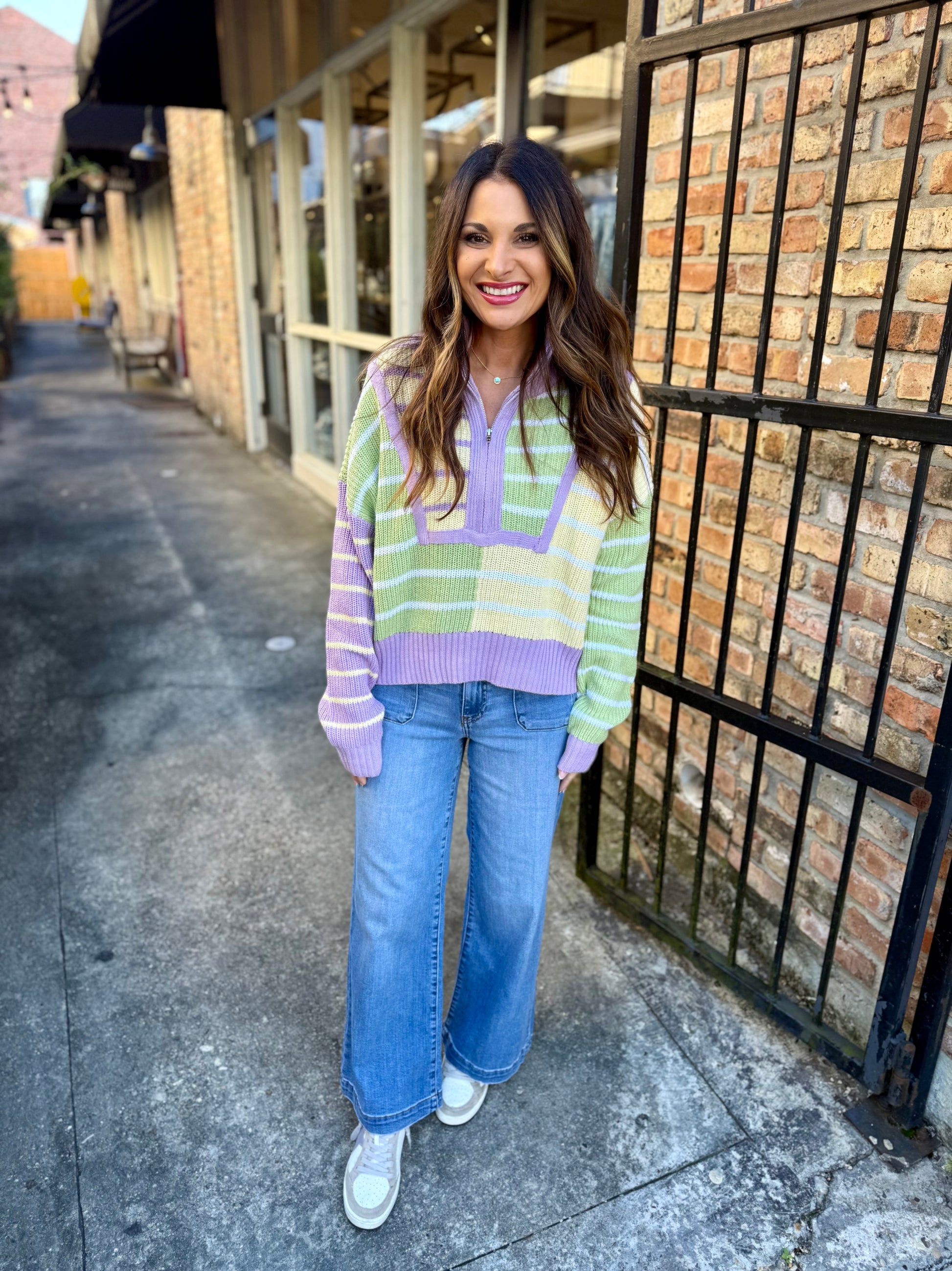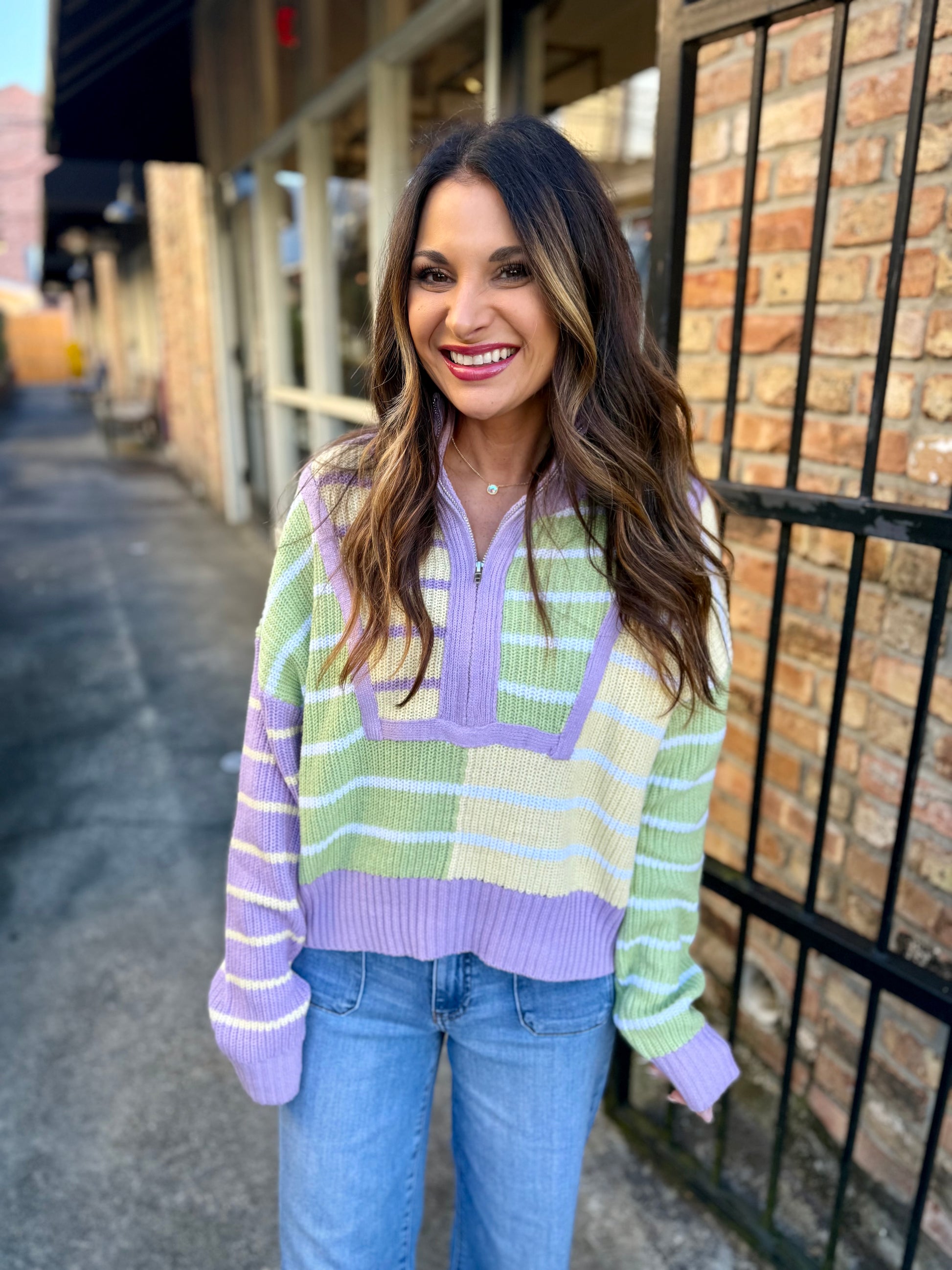 Bring festive flair to your Carnival rotation with the Benson Stripe 1/4 Zip Sweater. This playful pastel knit features cheerful Mardi Gras-inspired stripes that add personality to any outfit. The quarter-zip design offers easy layering and ventilation, while the soft, comfortable fabric keeps you cozy all day long.