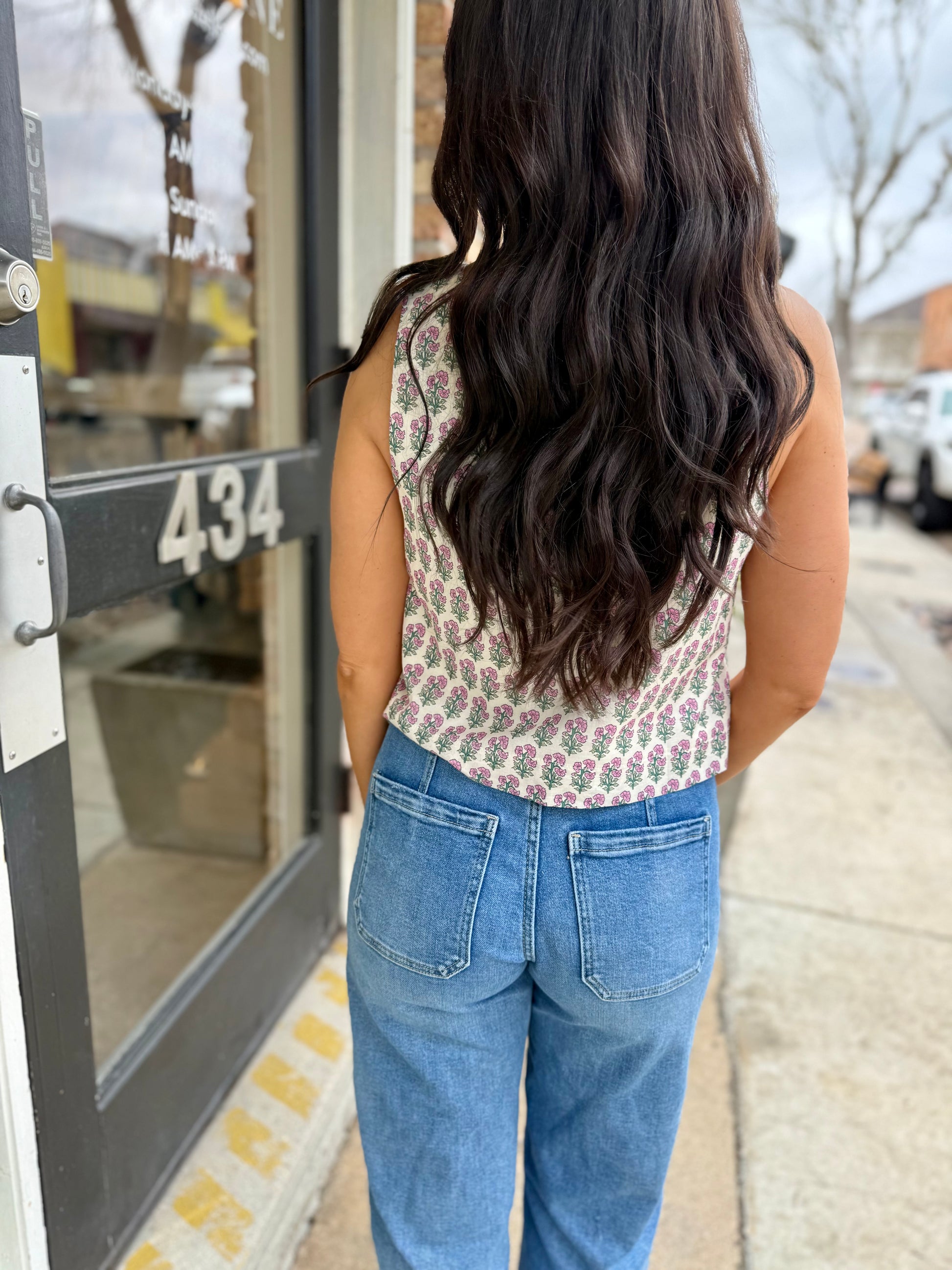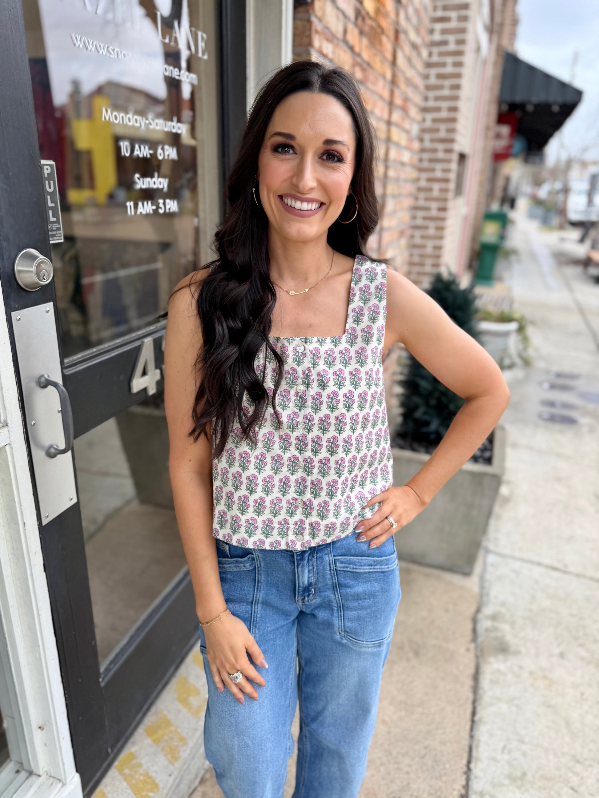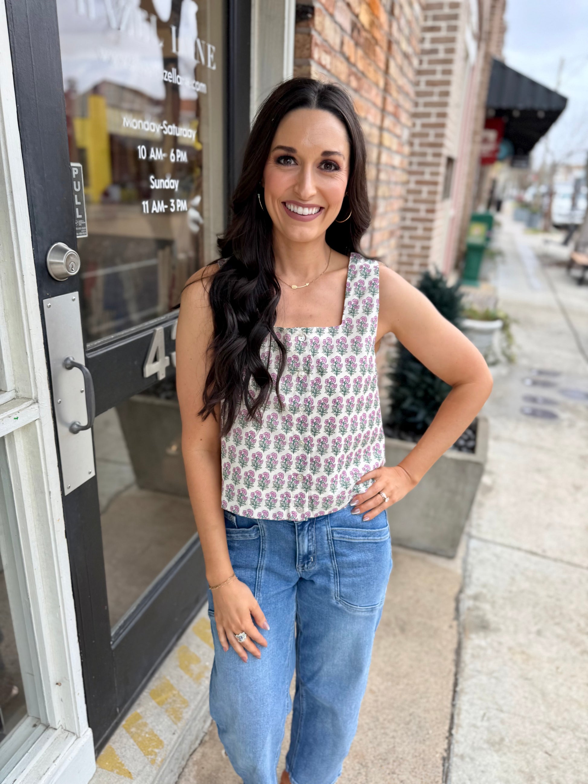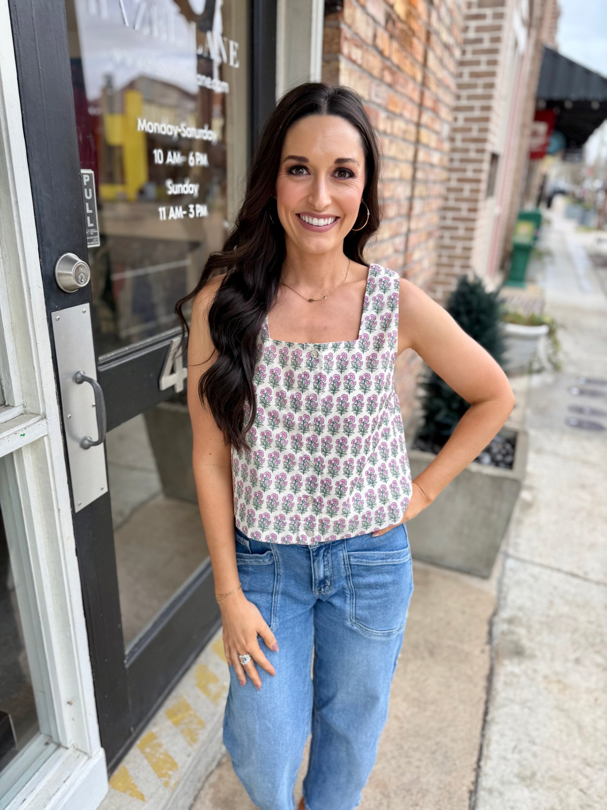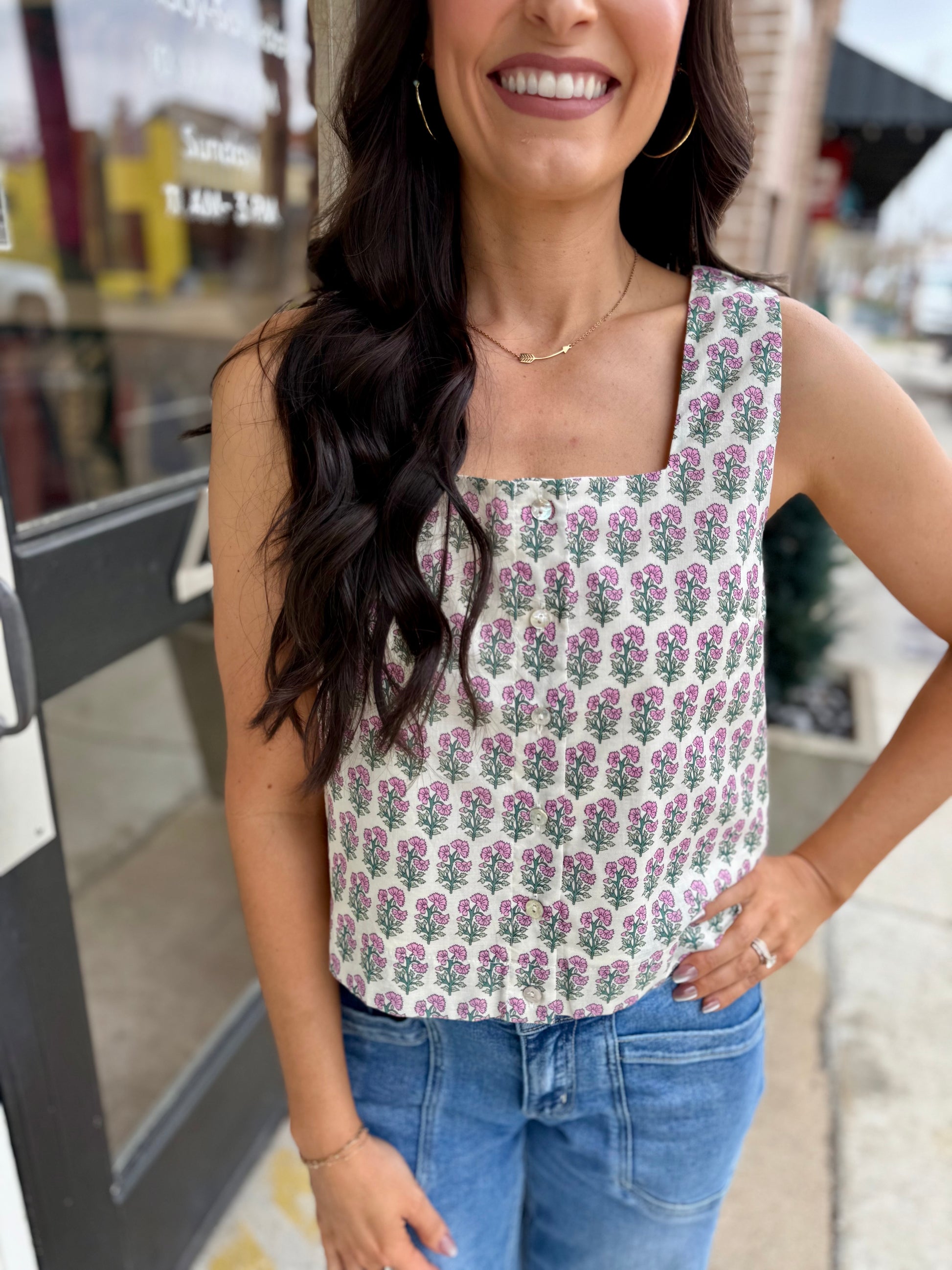 Embrace effortless elegance with this charming botanical print sleeveless top. The square neckline adds a modern touch, while the front button closure makes dressing a breeze. Crafted from lightweight woven fabric with a soft lining, this piece offers comfort without the see-through factor. Perfect for layering or wearing solo, it's your new go-to for casual sophistication with a hint of botanical flair.