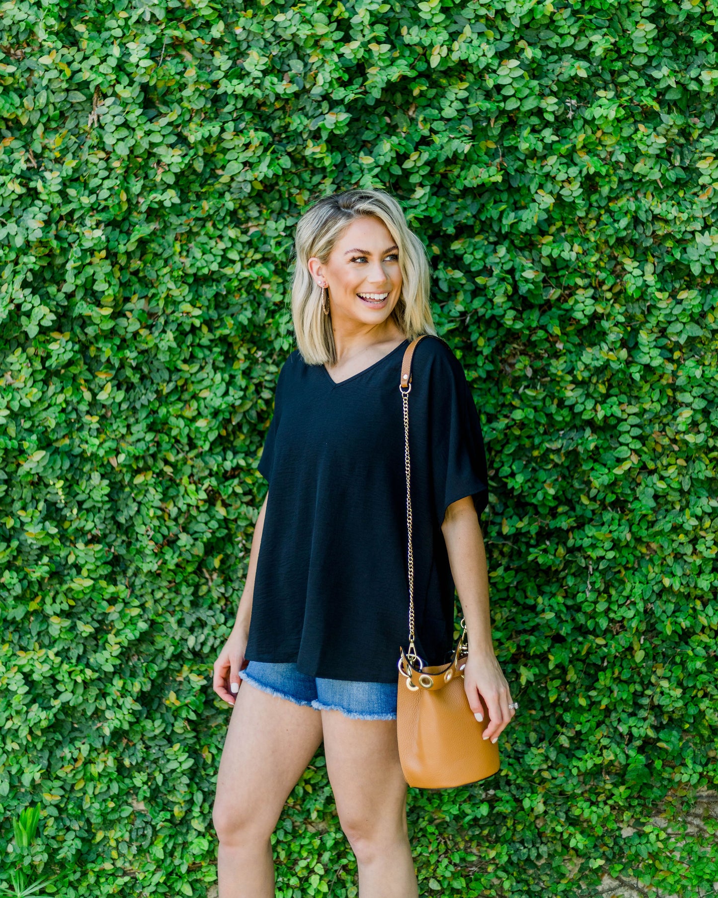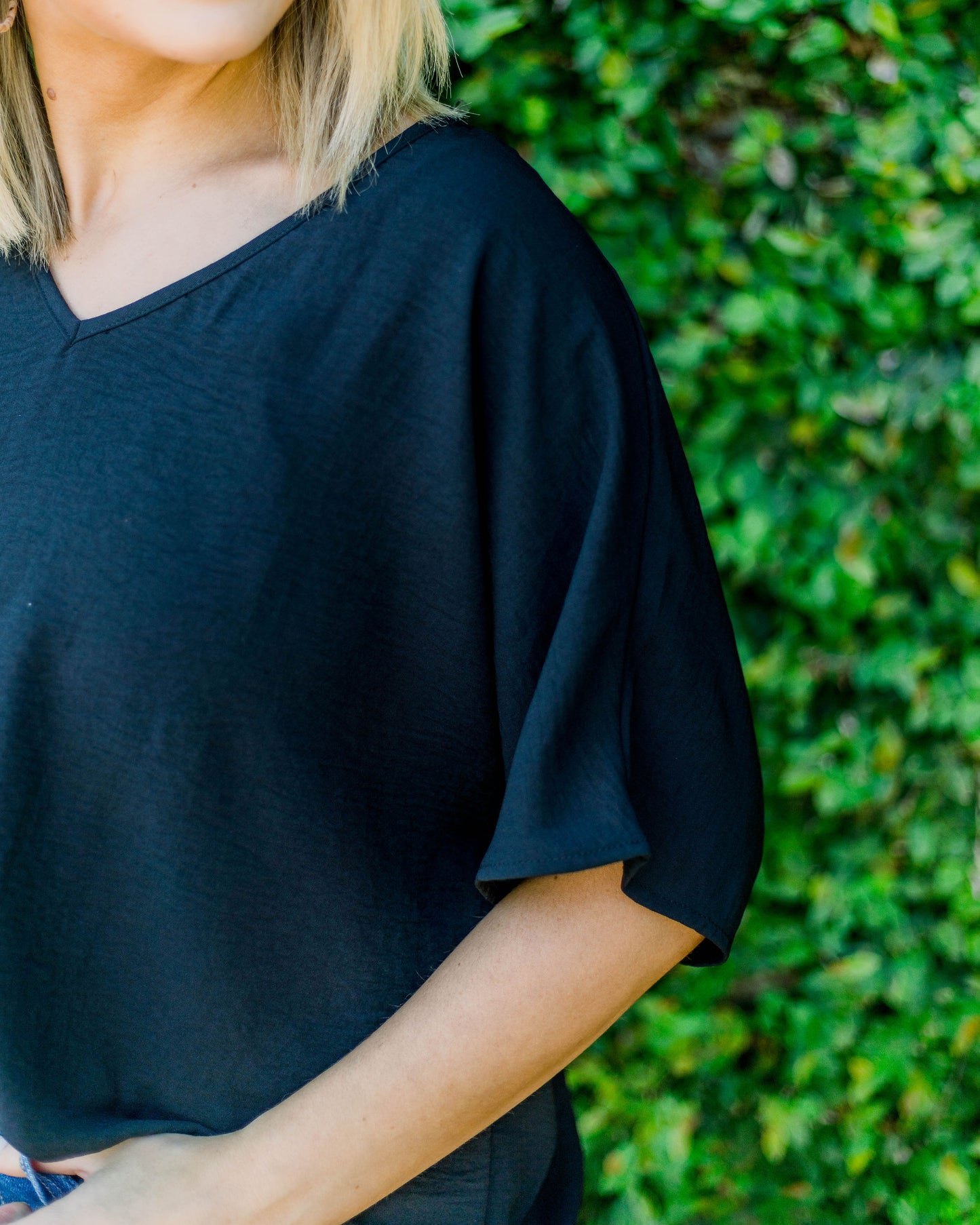 The Flowy V Blouse is a solid v-neck top featuring a rounded hem detail. The fabric is woven and super lightweight! This top can be taken from the office to the weekend. Style this one front tucked knotted, or untucked and you are sure to be back for more colors. A definite BESTSELLER!