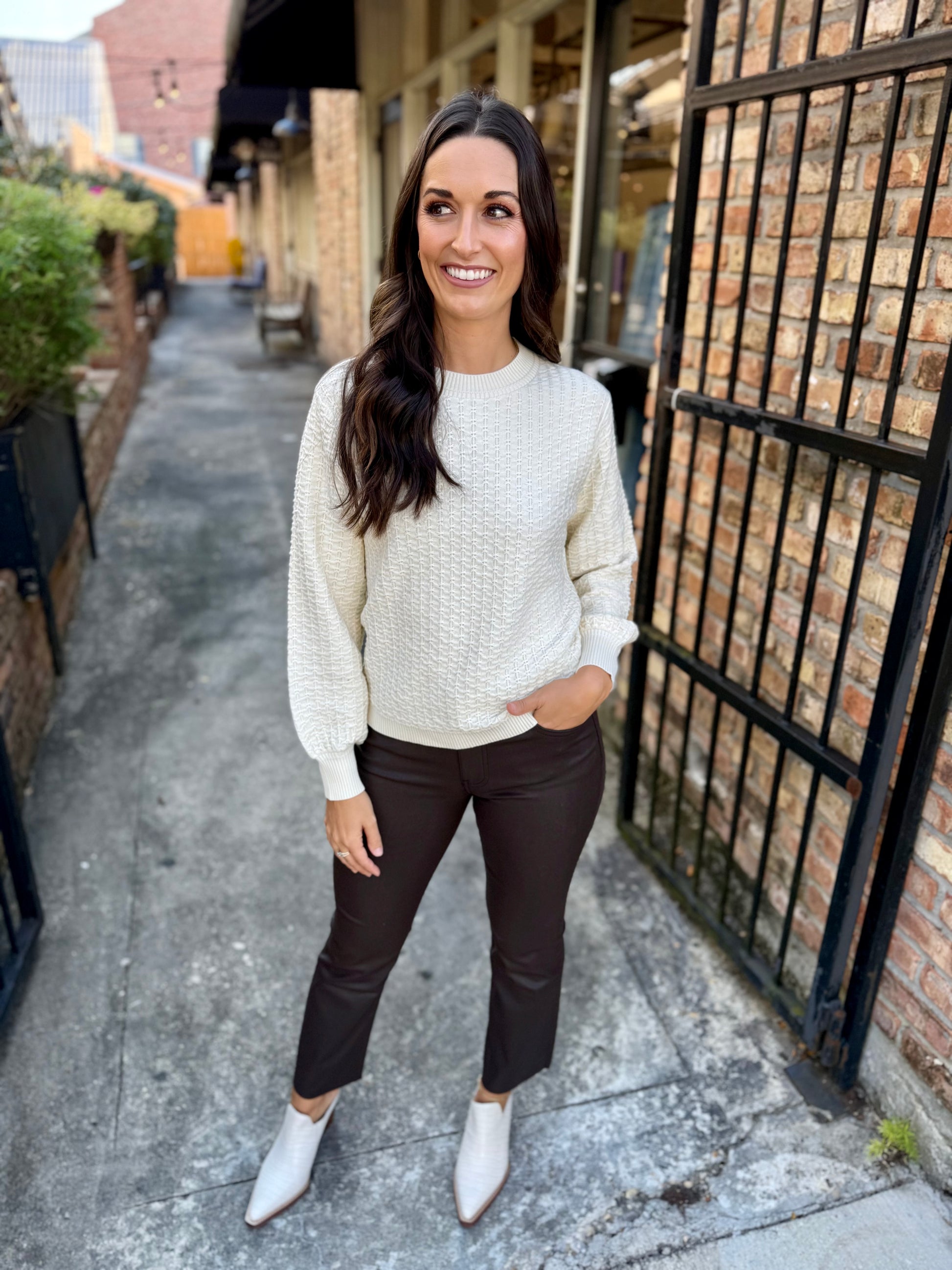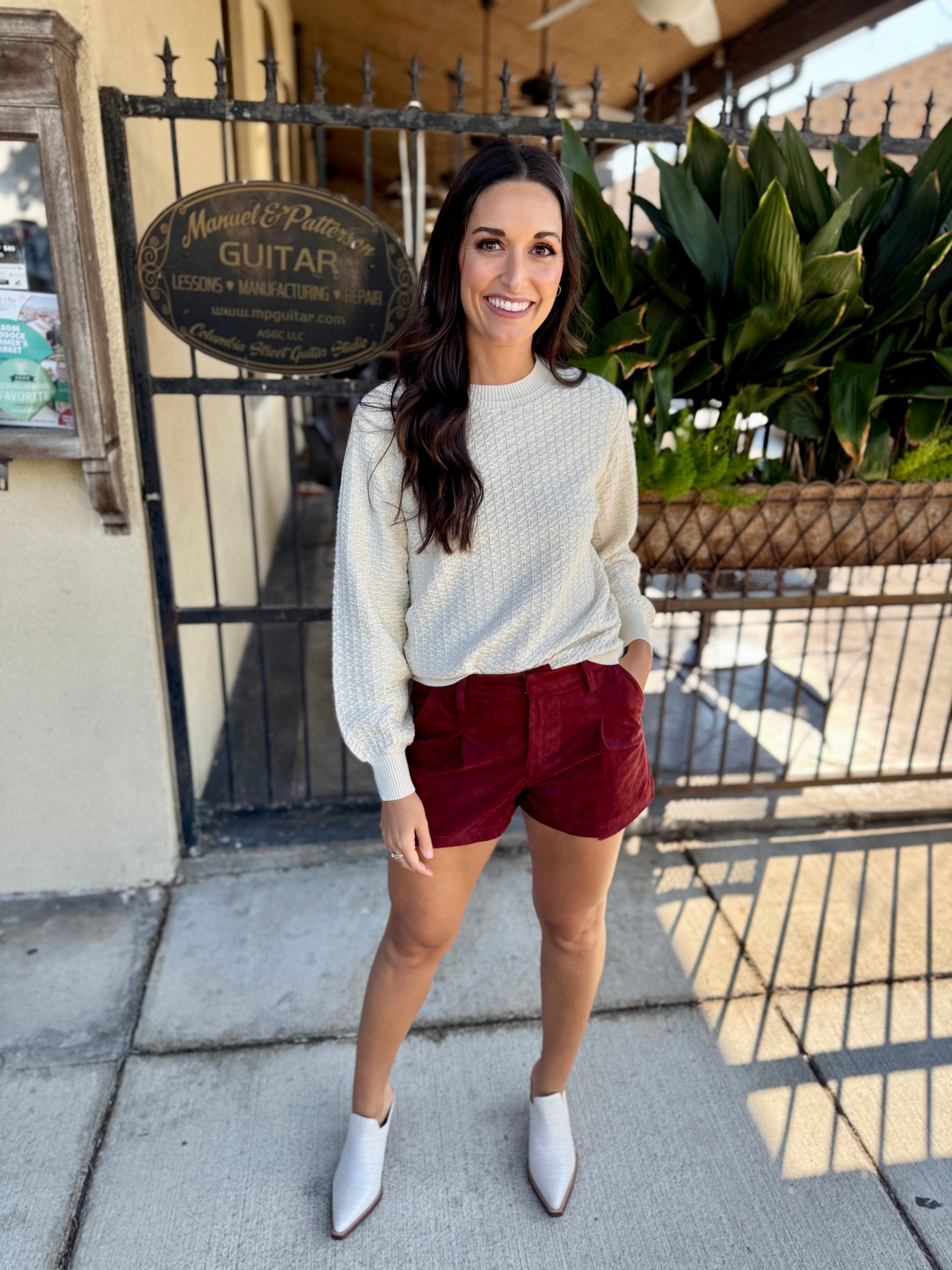 The Britney Textured Sweater is a charming addition to your fall wardrobe. This cream-colored sweater features a playful textured design that adds a sweet touch to any outfit. Stay cozy and cute with the Britney Textured Sweater!