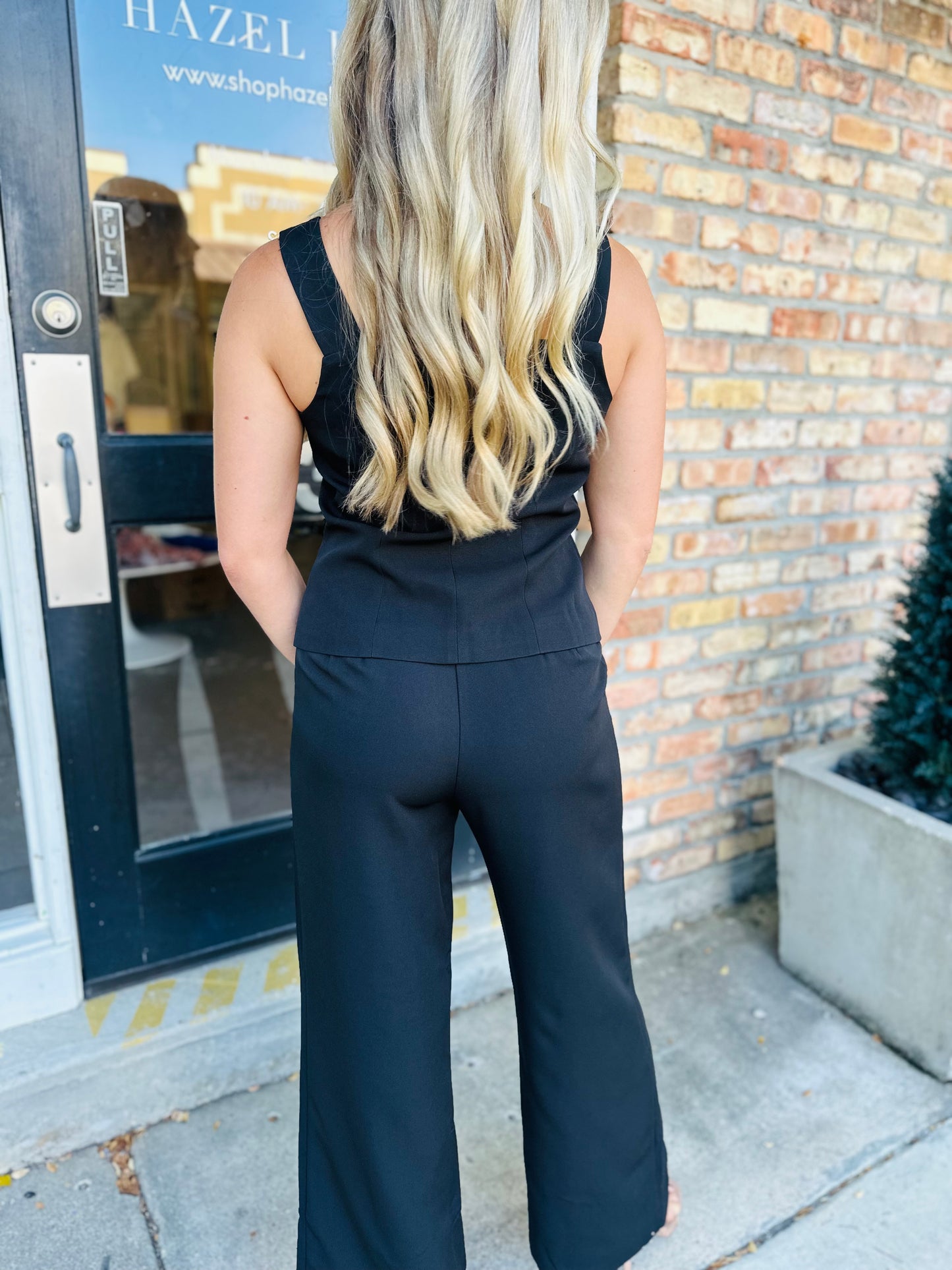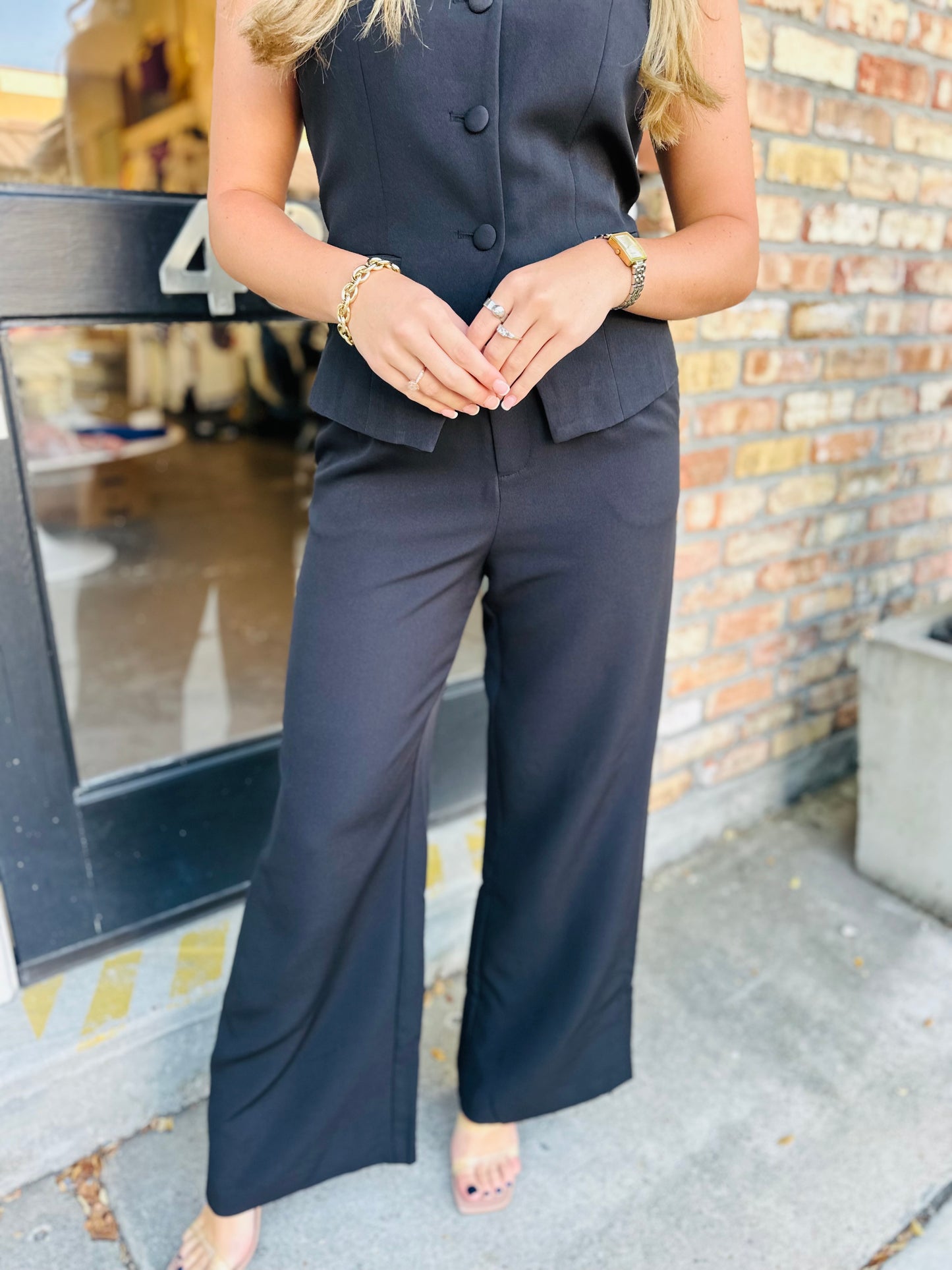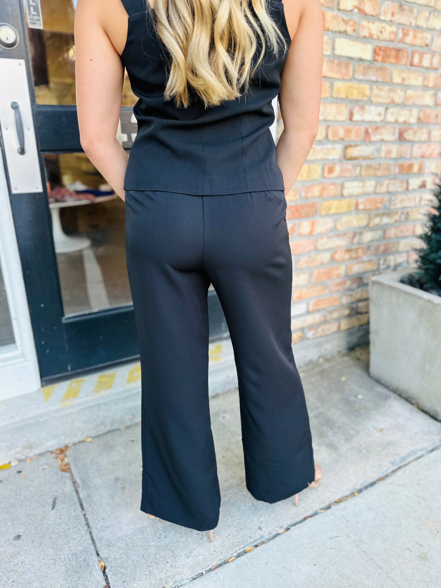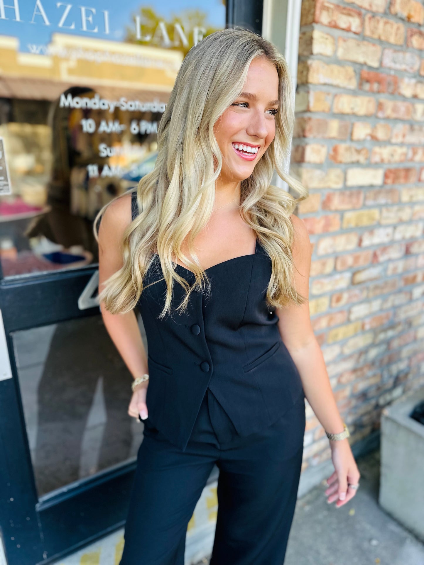 Step out in style with the Brynn High Waist Trouser in classic black. Designed to flatter your silhouette, these trousers offer a chic high-waisted fit that pairs perfectly with the Brynn Sweet Heart Vest for a coordinated look.