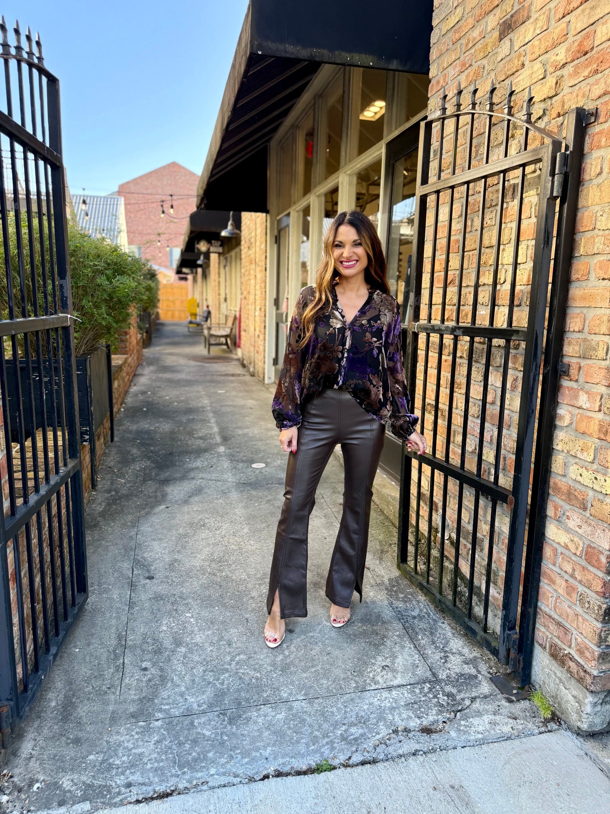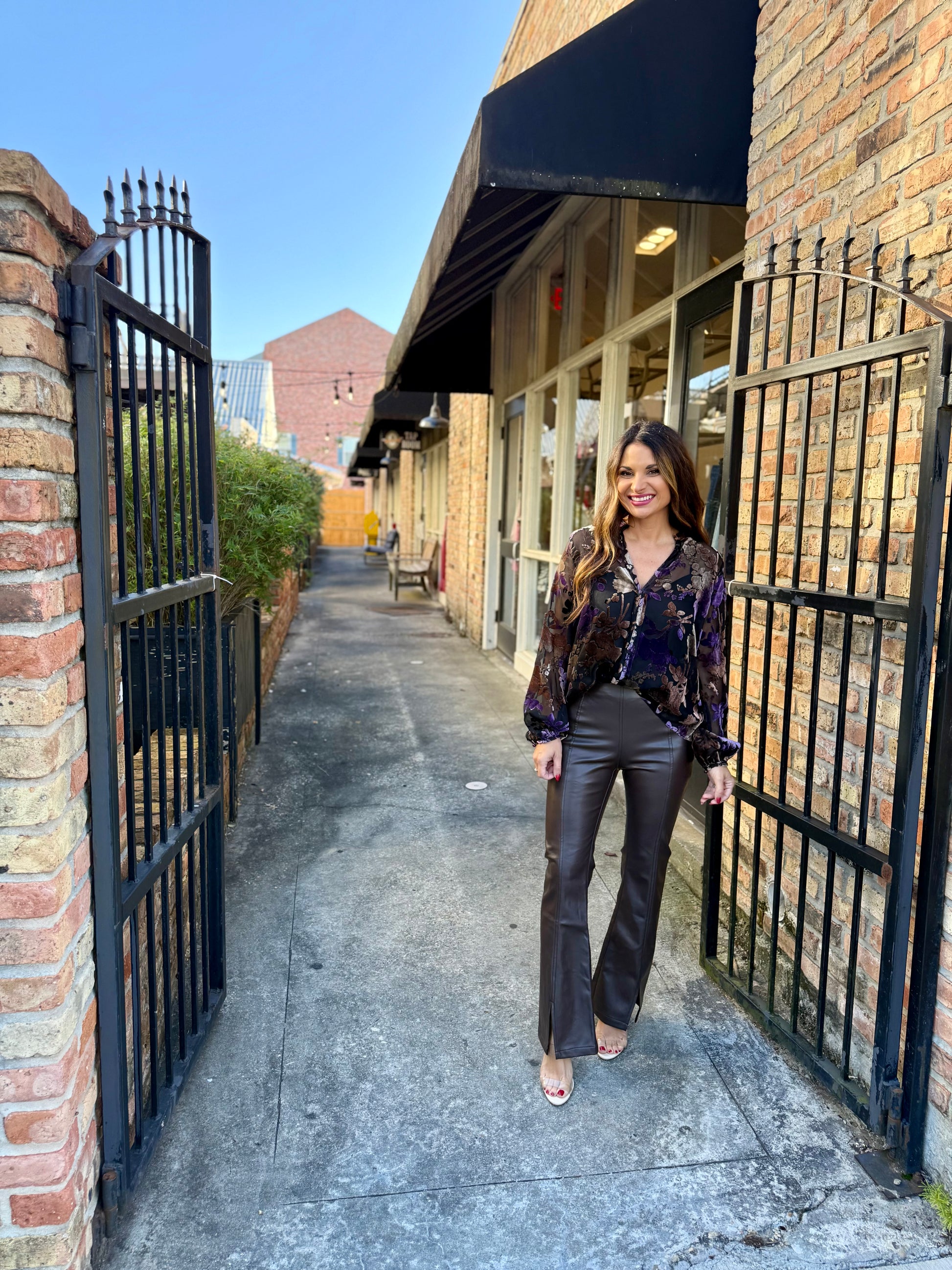Upgrade your fall look with this beautiful burnout print top! The floral design adds a touch of whimsy, making it perfect to pair with a leather skirt or pants. Elevate your style with this unique top.