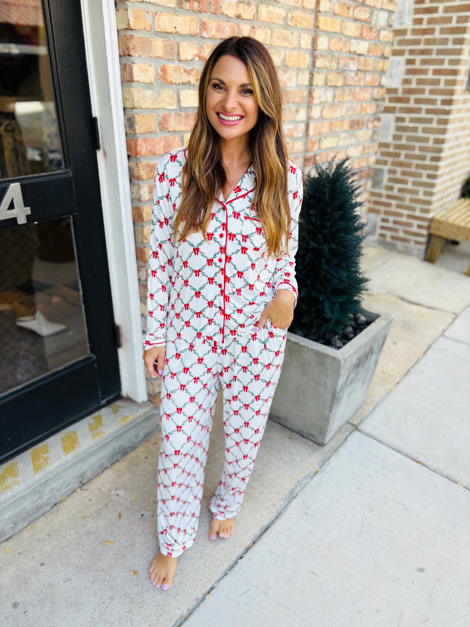 This playful pajama set features a charming lattice garland button-up top adorned with red bows and green trim, paired with matching pants for cozy comfort. Perfect for Christmas and beyond, it adds a fun, girly touch to your nighttime routine.