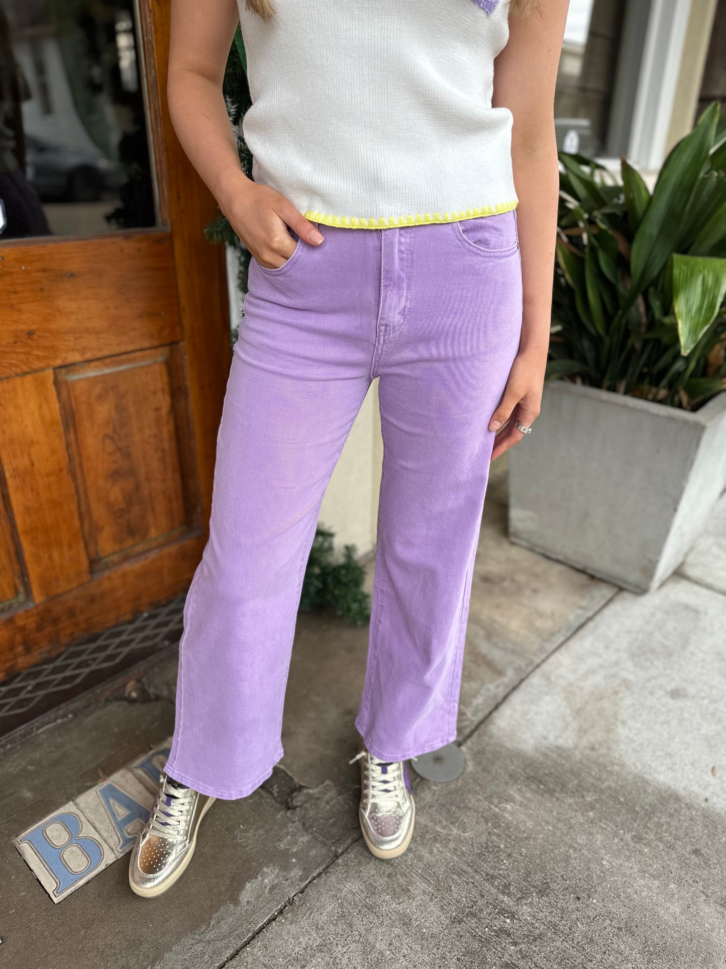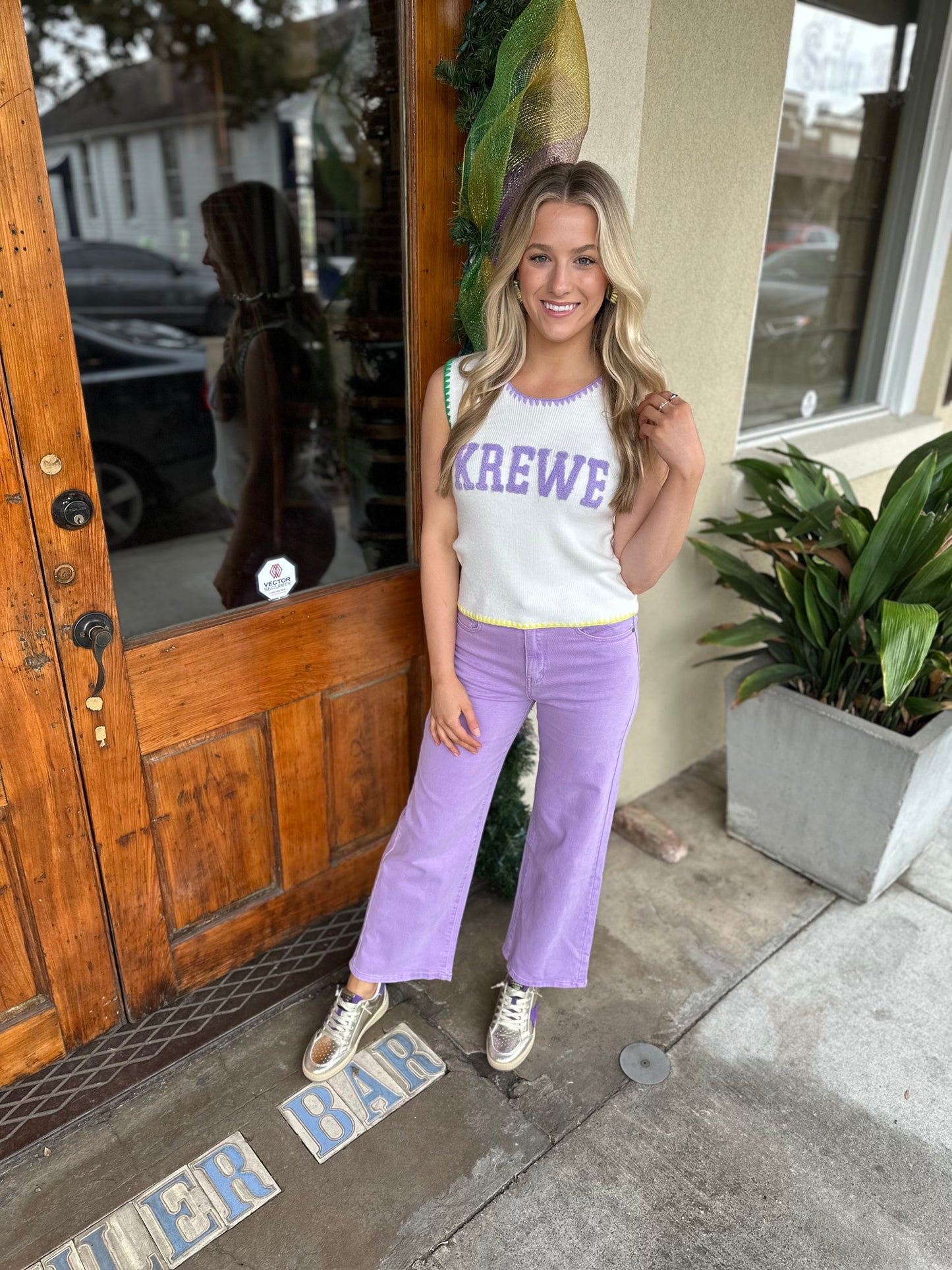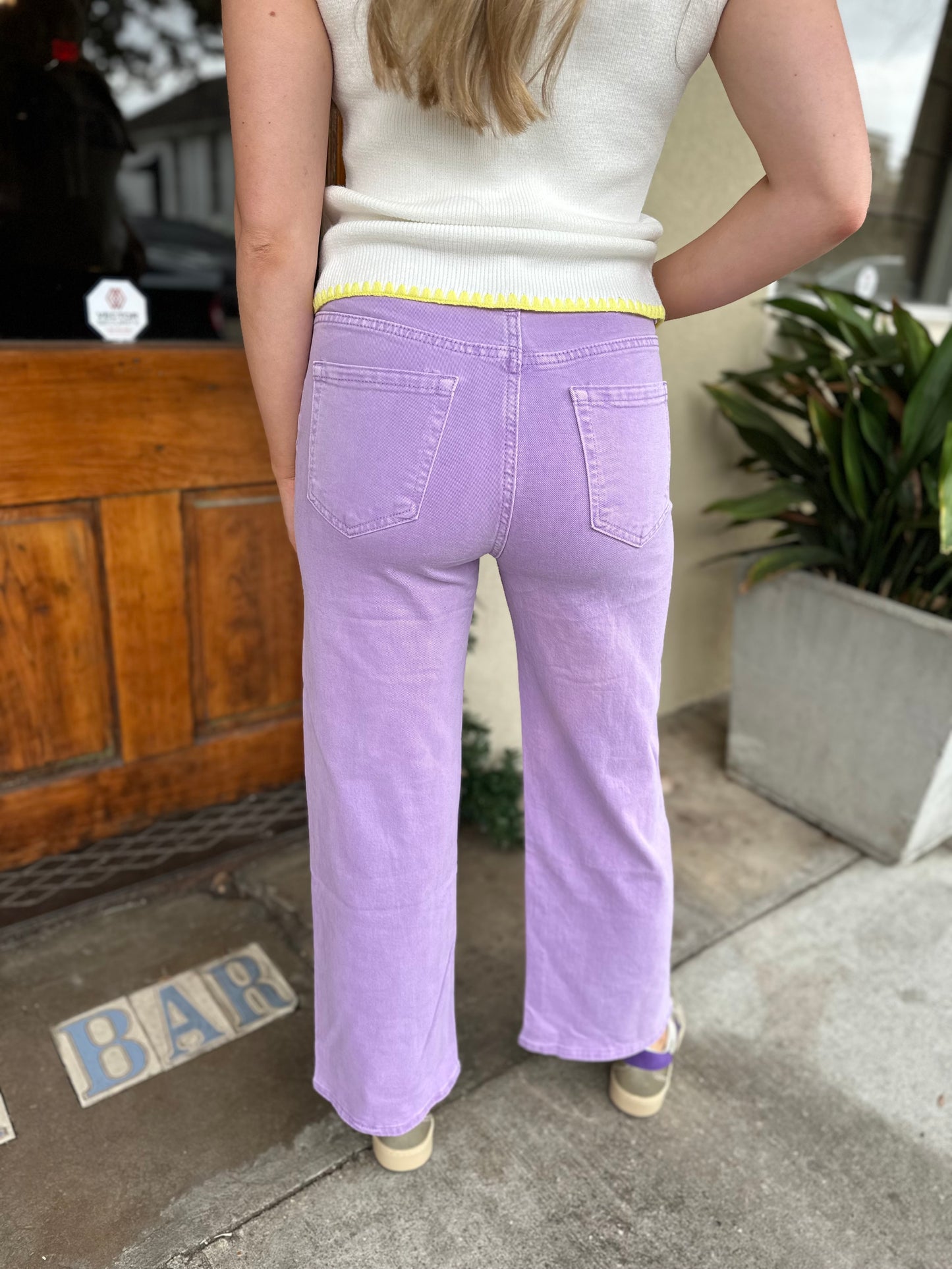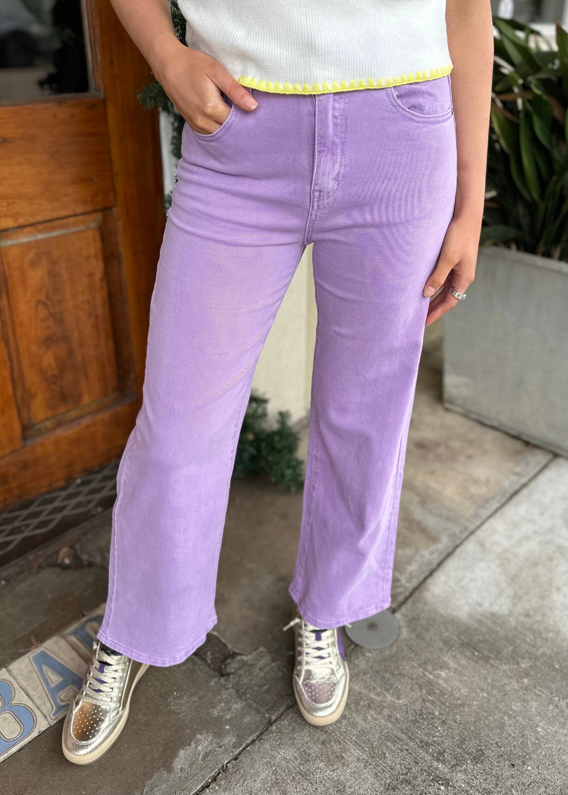 Get ready to stand out in style with our Cleopatra Wide Leg Denim! These gorgeous lavender jeans are perfect for any occasion, whether you're celebrating Mardi Gras or showing your LSU pride. With a flattering wide leg fit, you'll feel confident and comfortable all day long. Upgrade your denim game with these playful and unique jeans.
