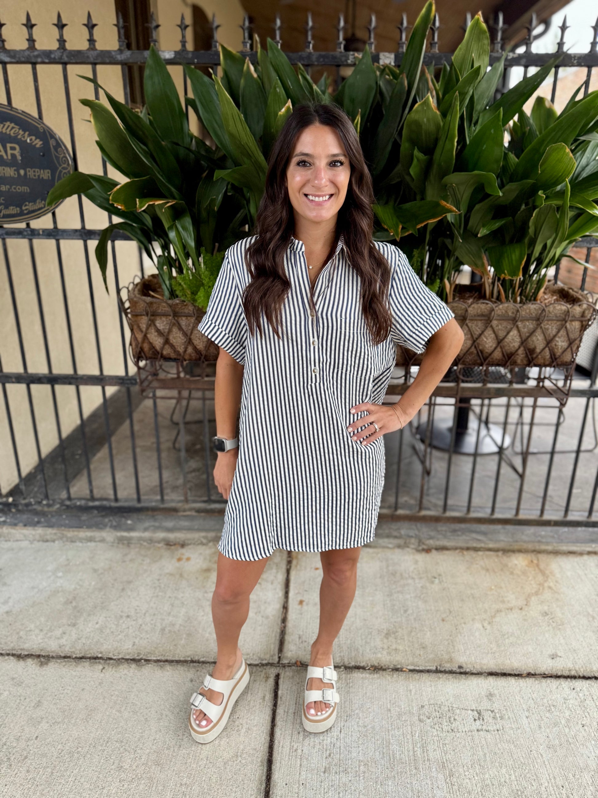 Step into effortless style with this playful striped seersucker shirt dress. Designed for comfort and ease, it features handy pockets and a breezy fit that’s perfect for sunny days. Whether you're out to carline or a casual lunch, this easy-to-wear dress adds a fresh, fun vibe to your wardrobe.