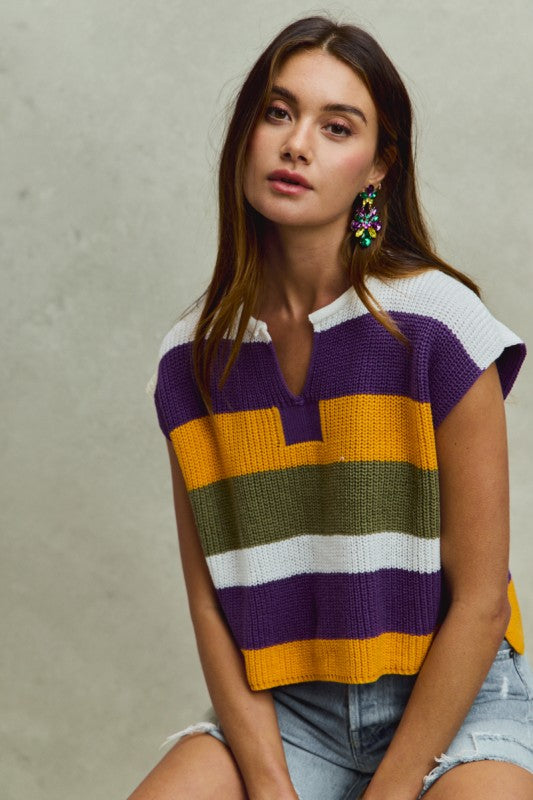 Celebrate in style with this vibrant Mardi Gras striped dolman sweater top! Featuring bold color stripes that capture the festive spirit of the season, the relaxed dolman sleeves offer effortless comfort and movement. Perfect for Mardi Gras parties or parade going. The loose, flattering fit works beautifully layered or worn solo. Get ready to turn heads and spread good vibes wherever you go!