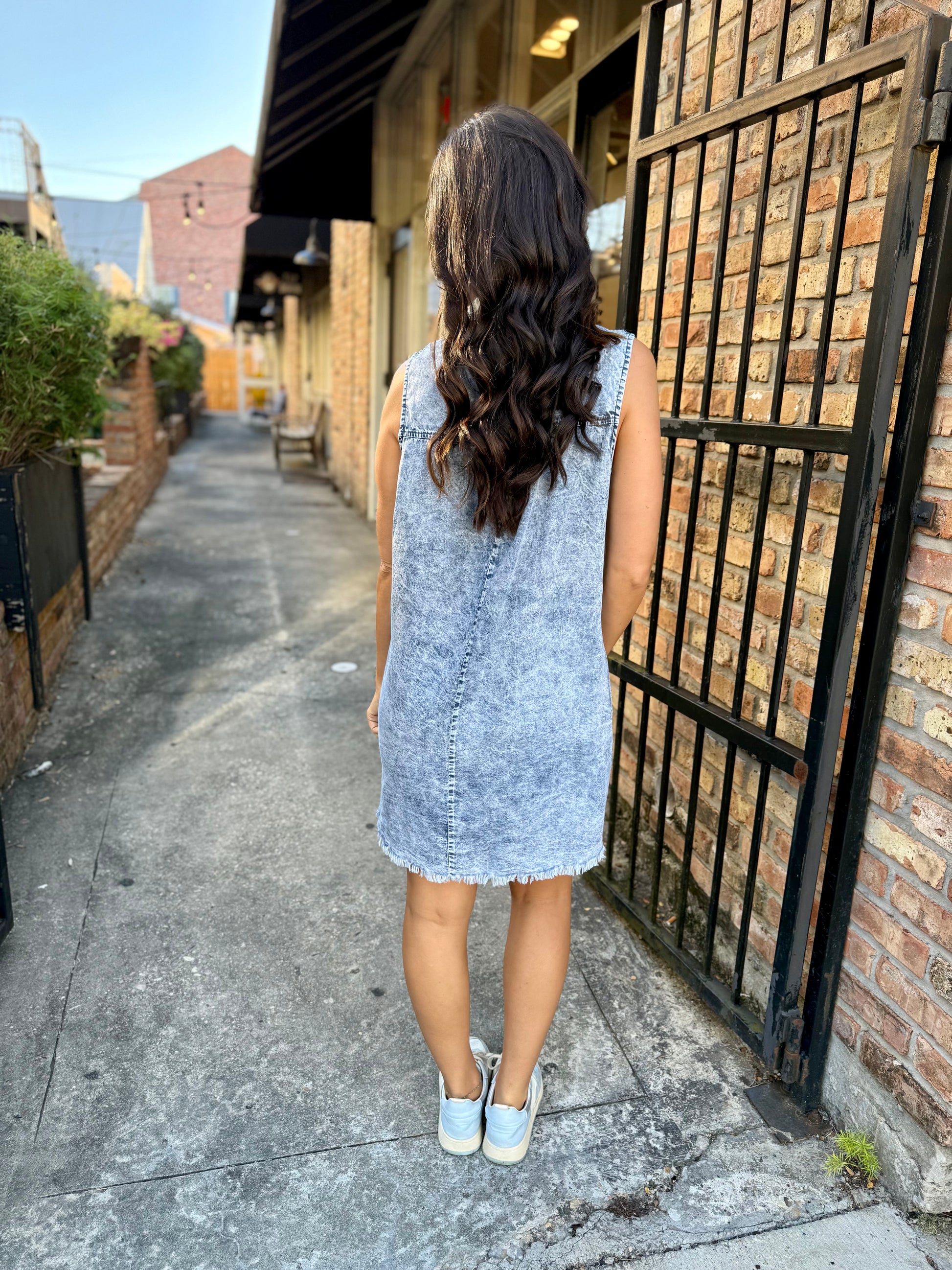 This playful sleeveless shirt dress in washed denim is your go-to for effortless style. Featuring a button-down front and two chest pockets, it blends casual charm with practical flair. Perfect for sunny days, it keeps things cool and easy with a fun, flirty vibe.