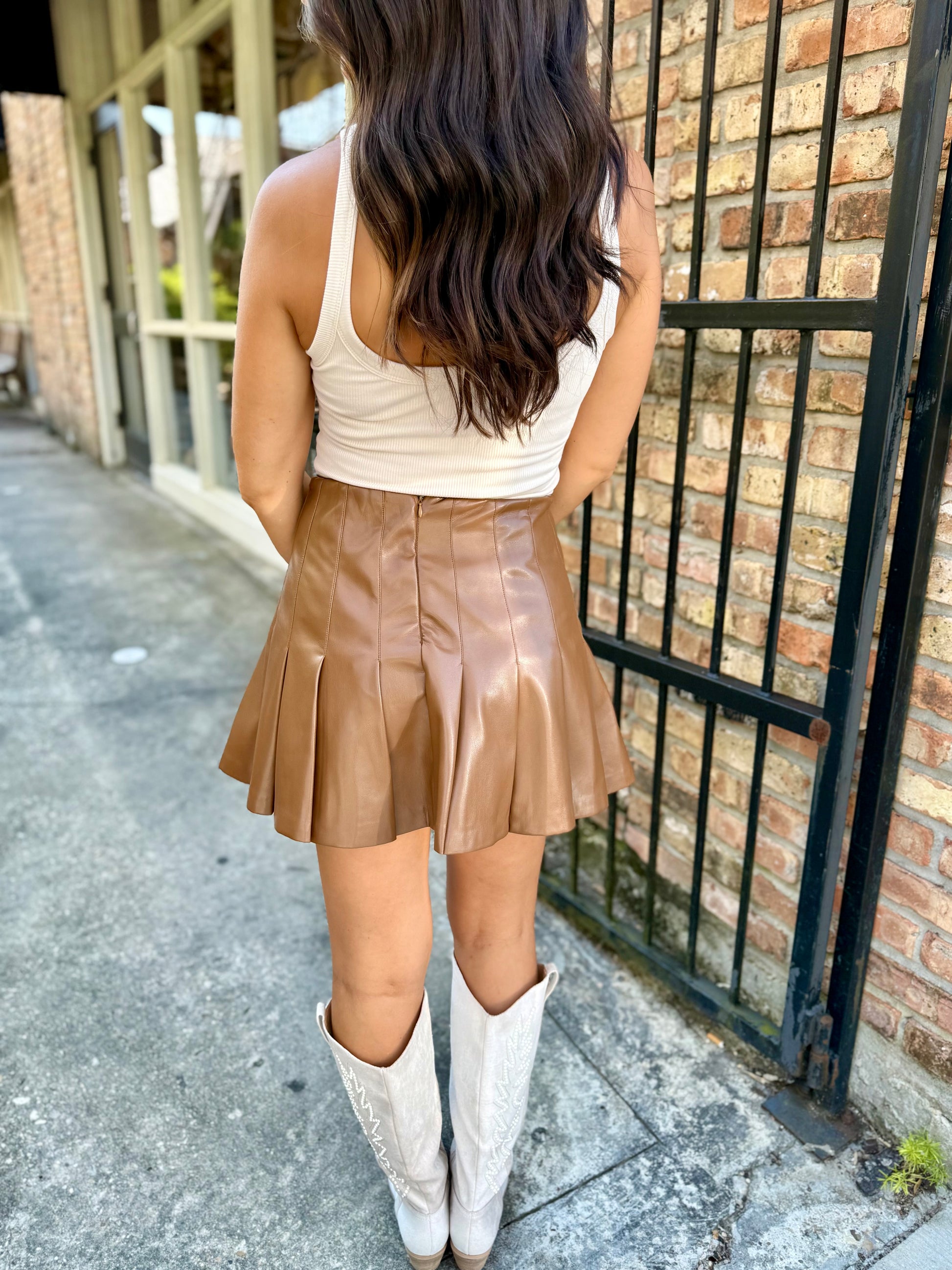 The Ellis Skort in rich brown combines the chic look of pleated faux leather with the comfort of built-in shorts, making it perfect to dress up for a night out or keep casual for daytime fun. Its versatile style lets you play with your wardrobe while staying effortlessly cool and confident.