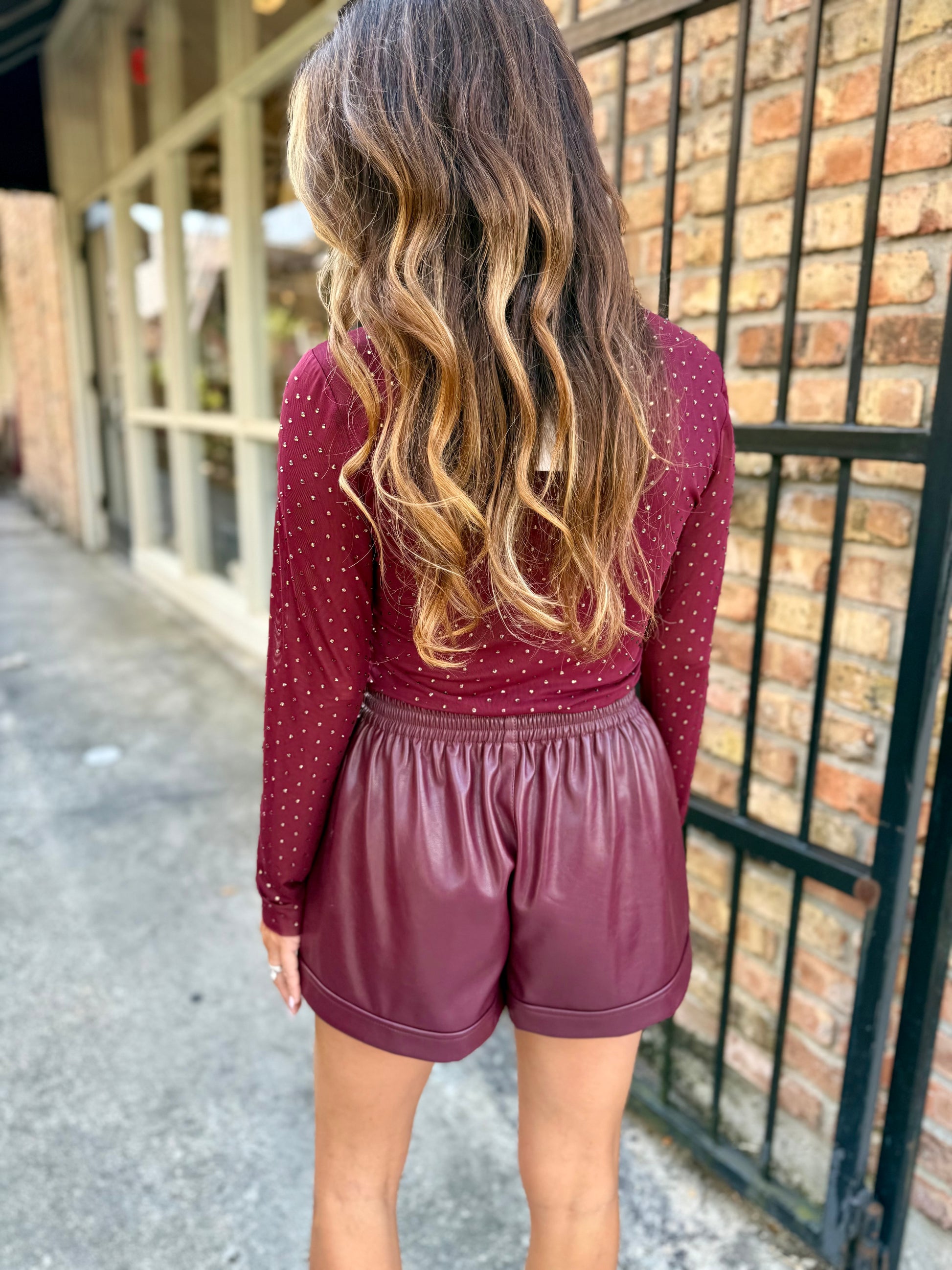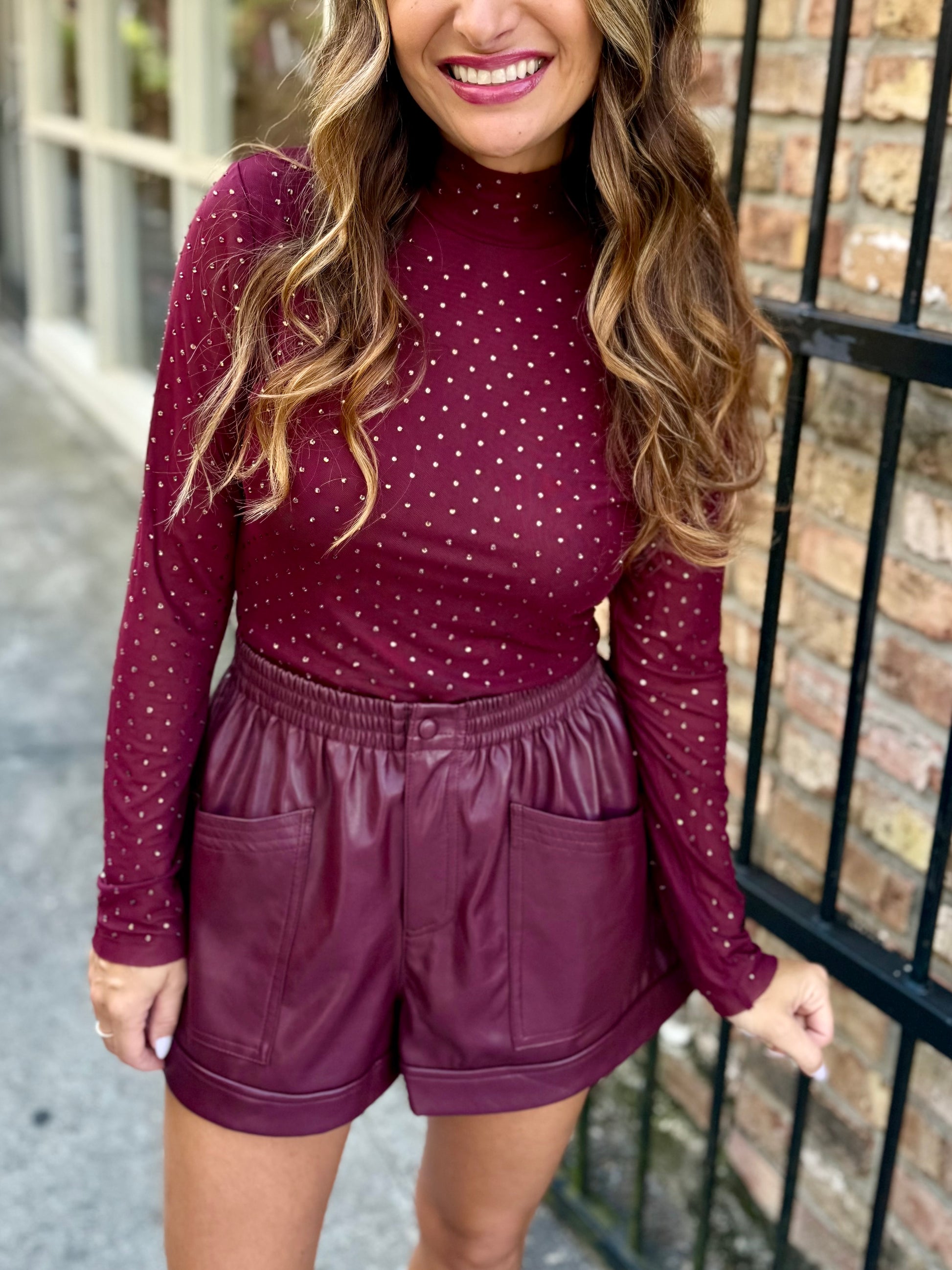 Upgrade your wardrobe with our stylish Embellished Mock Neck Top in burgundy. Made with a delicate mesh material and adorned with beautiful embellishments, this top is perfect for a fun occasion. The mock neck adds a touch of sophistication while still remaining playful and fun. Stand out from the crowd with this unique top!