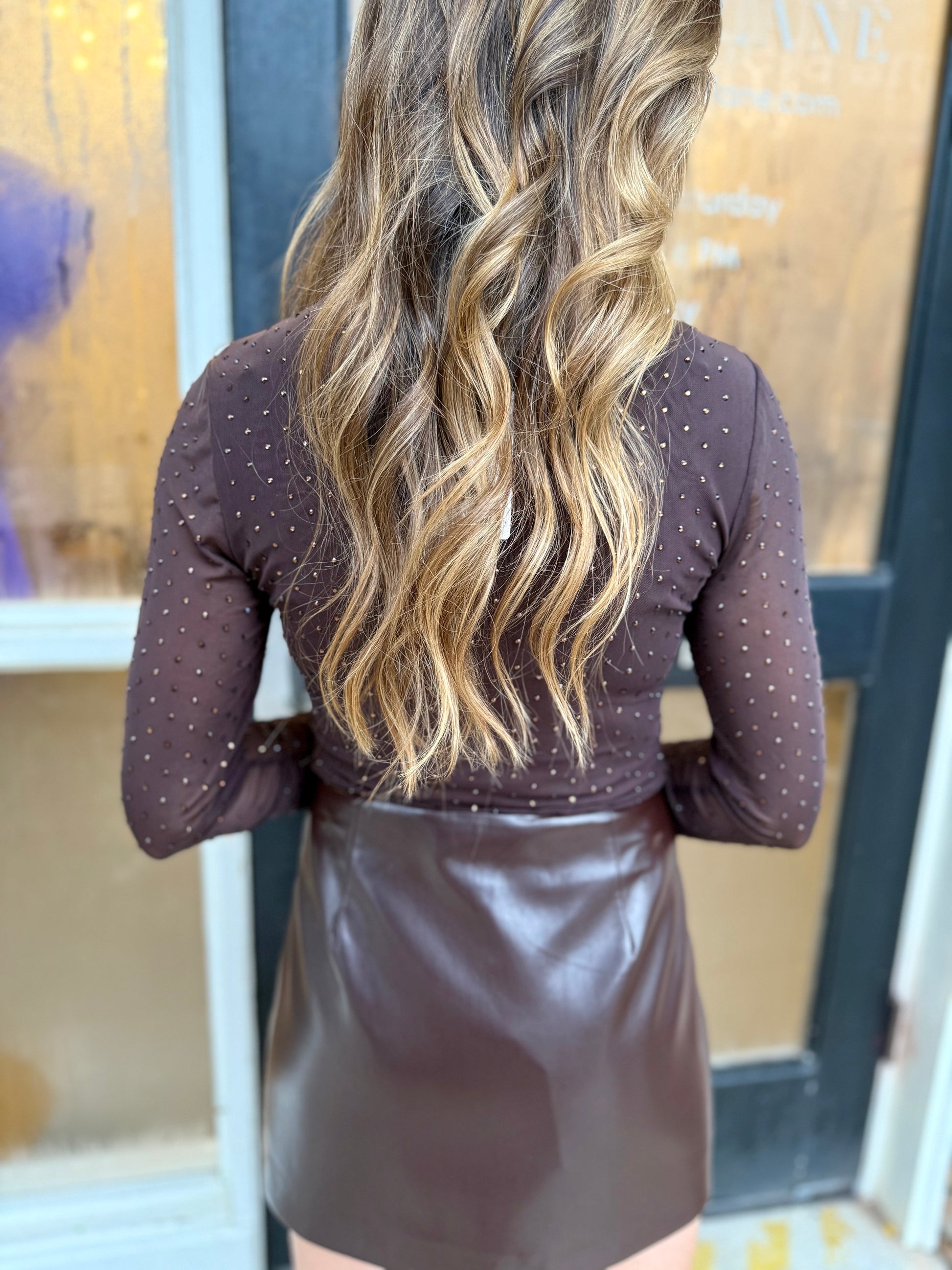 Embellished Mesh Mock Neck Top- Dark Chocolate