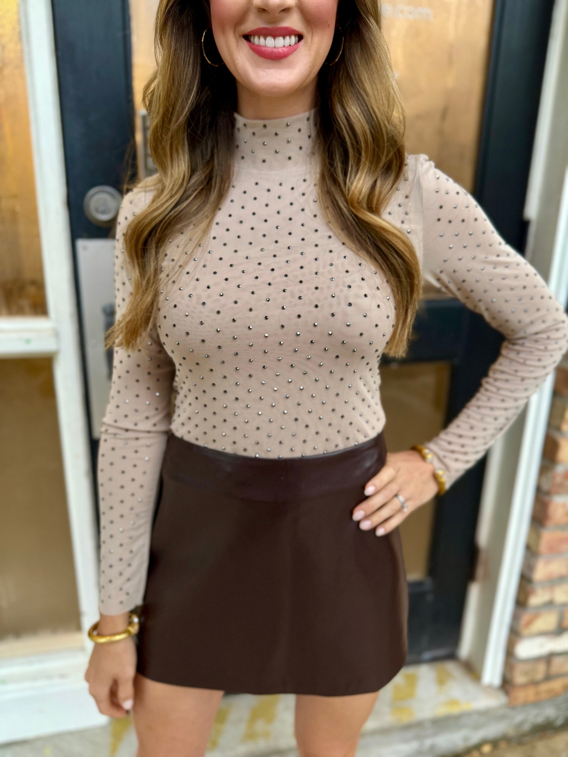 Upgrade your wardrobe with our stylish Embellished Mock Neck Top in Beige. Made with a delicate mesh material and adorned with beautiful embellishments, this top is perfect for a fun occasion. The mock neck adds a touch of sophistication while still remaining playful and fun. Stand out from the crowd with this unique top!