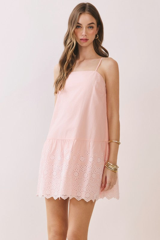 Meet your new go-to mini dress! This solid cami style features adjustable spaghetti straps and a relaxed fit that's oh-so-comfortable. The real showstopper? A delicate eyelet-embroidered hem with a charming scalloped edge, paired with a flirty back tie and exposed zipper that adds just the right amount of sass. Dress it up or keep it casual—this versatile piece does it all.