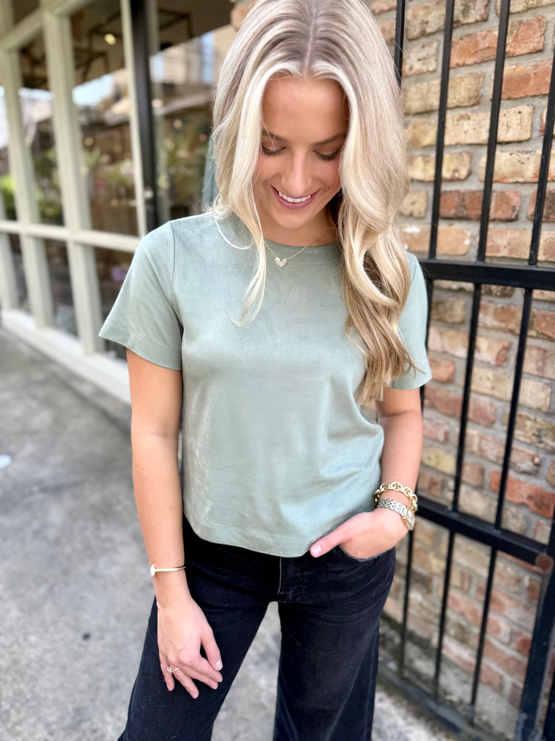 This EZRA faux-suede short-sleeved top features a sleek zip-up design at the back, combining modern style with easy wearability. Its soft texture and tailored fit make it a versatile piece for sophisticated casual looks. Ideal for layering or wearing alone, it offers both comfort and a polished finish.