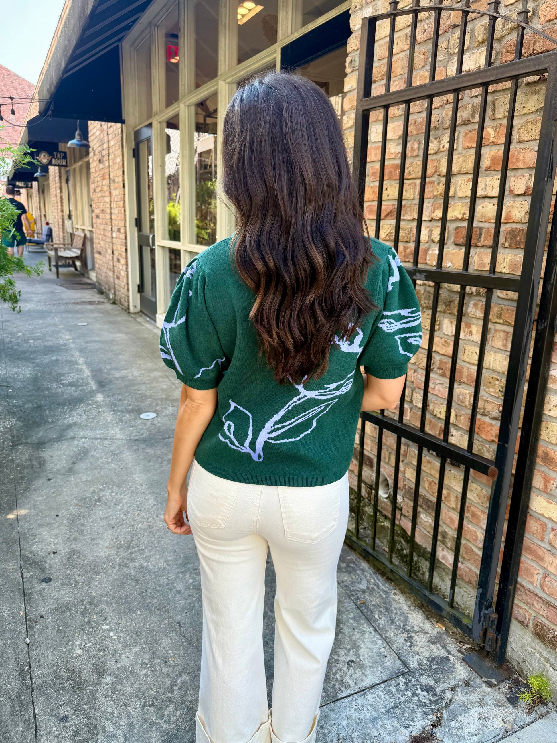 This playful green sweater top features a charming floral motif and short puff sleeves that add a fun, flirty touch. Crafted from a midweight, non-sheer knit, it’s perfect for layering or wearing on its own when you want to stay cozy without overheating. Brighten your wardrobe with this sweet and stylish pullover!