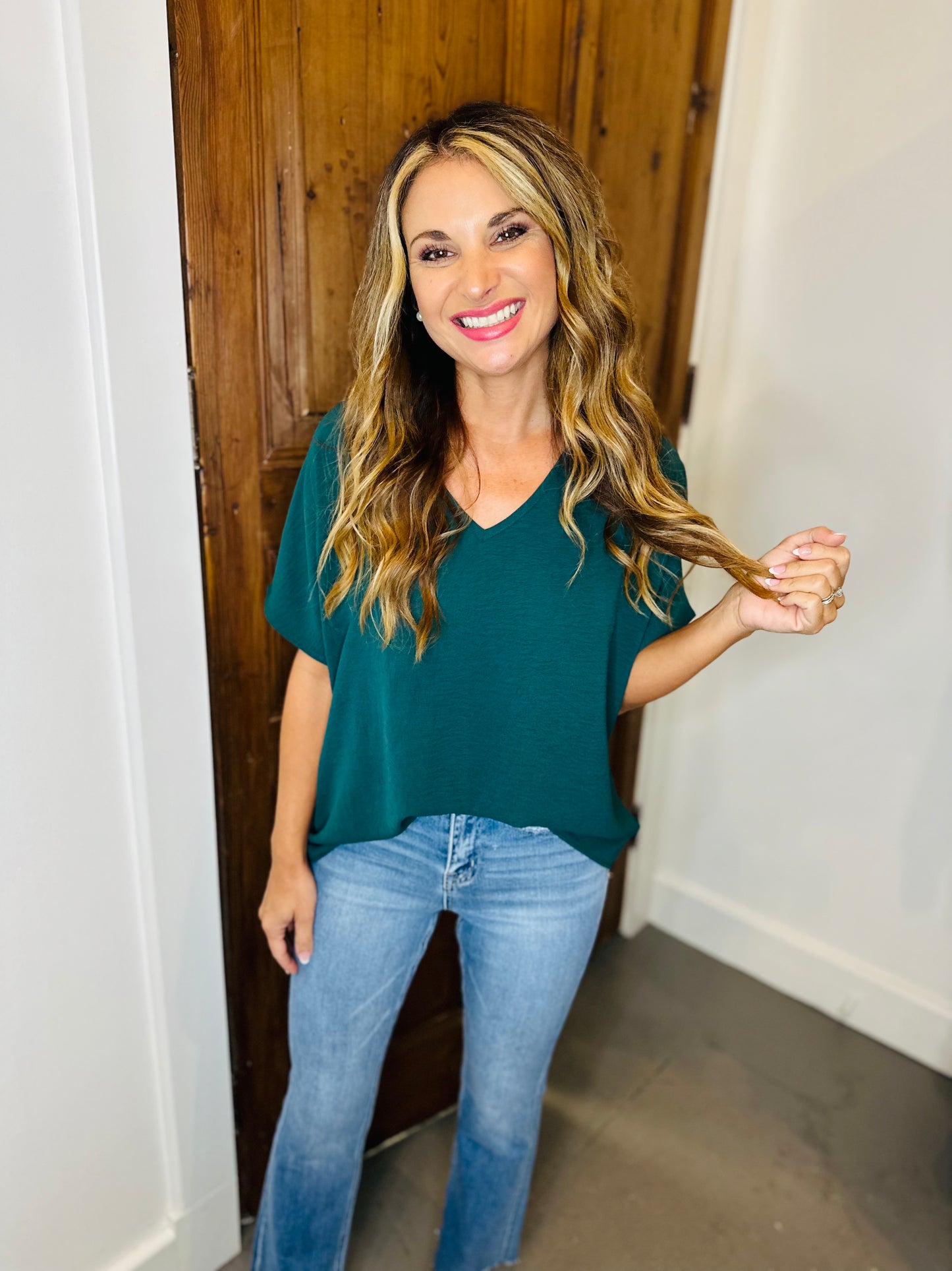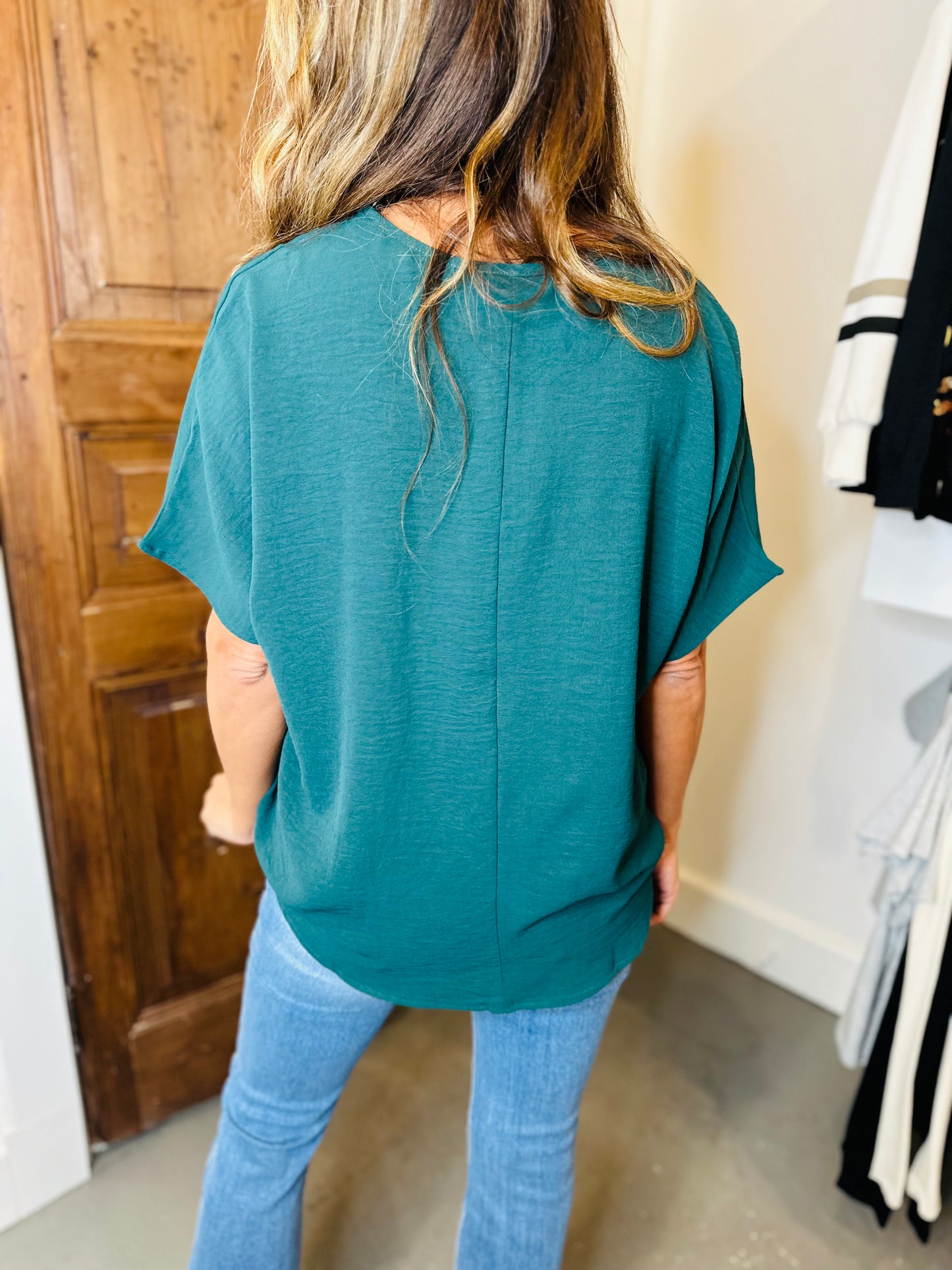 The Flowy V Blouse is a solid v-neck top featuring a rounded hem detail. The fabric is woven and super lightweight! This top can be taken from the office to the weekend. Style this one front tucked knotted, or untucked and you are sure to be back for more colors. A definite BESTSELLER!