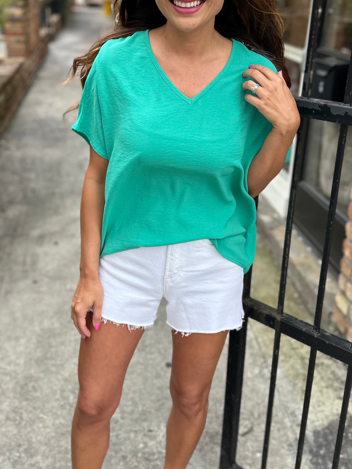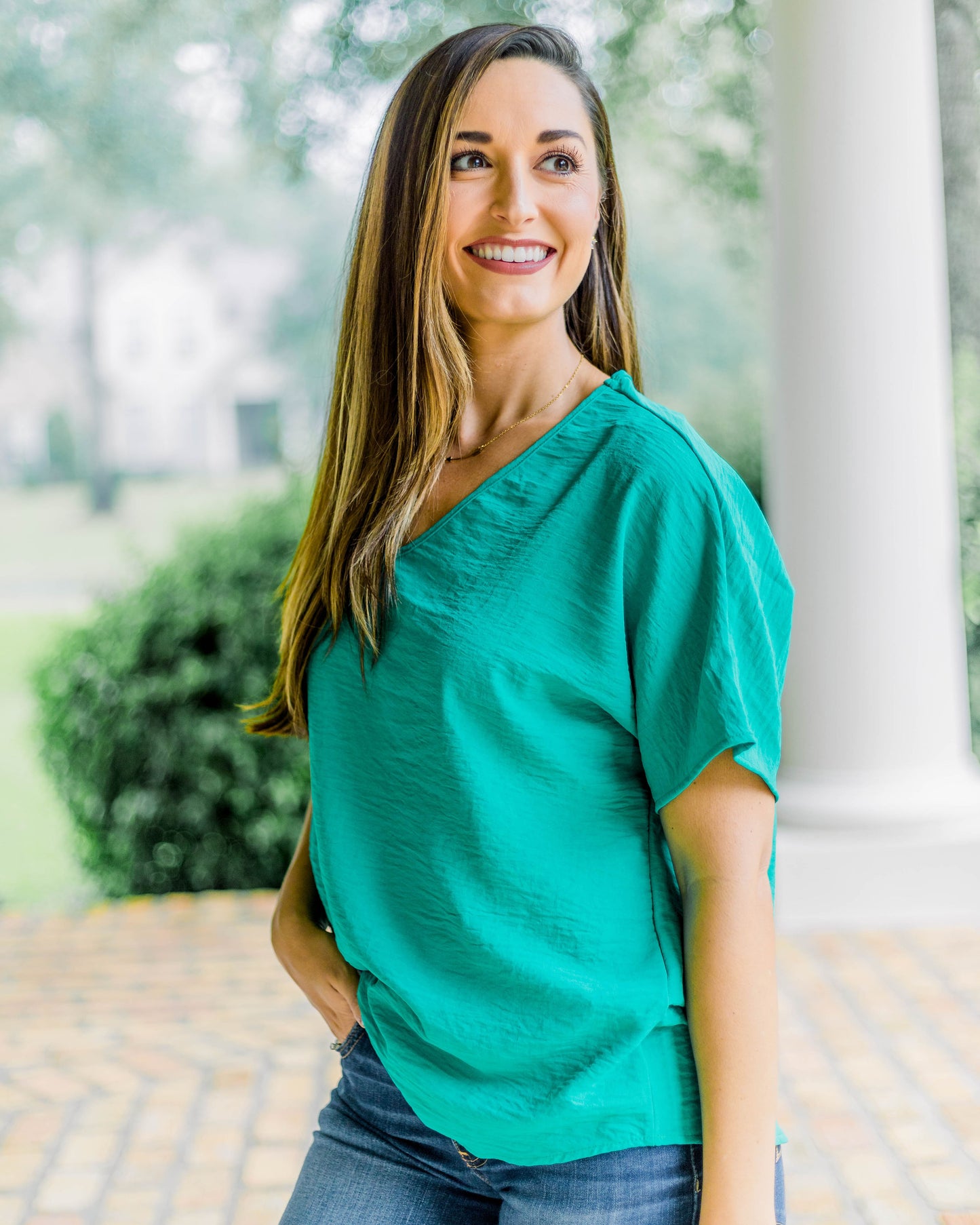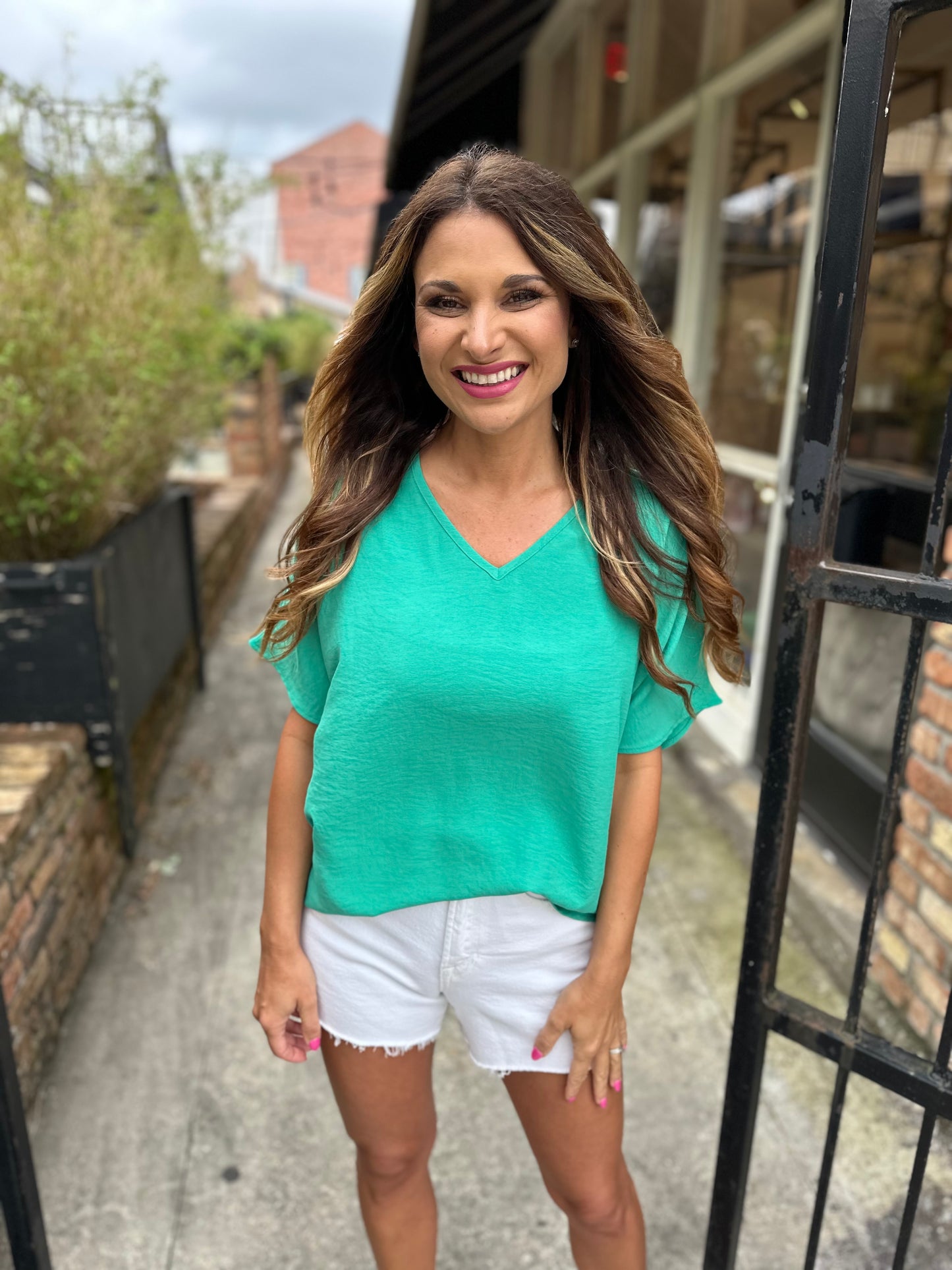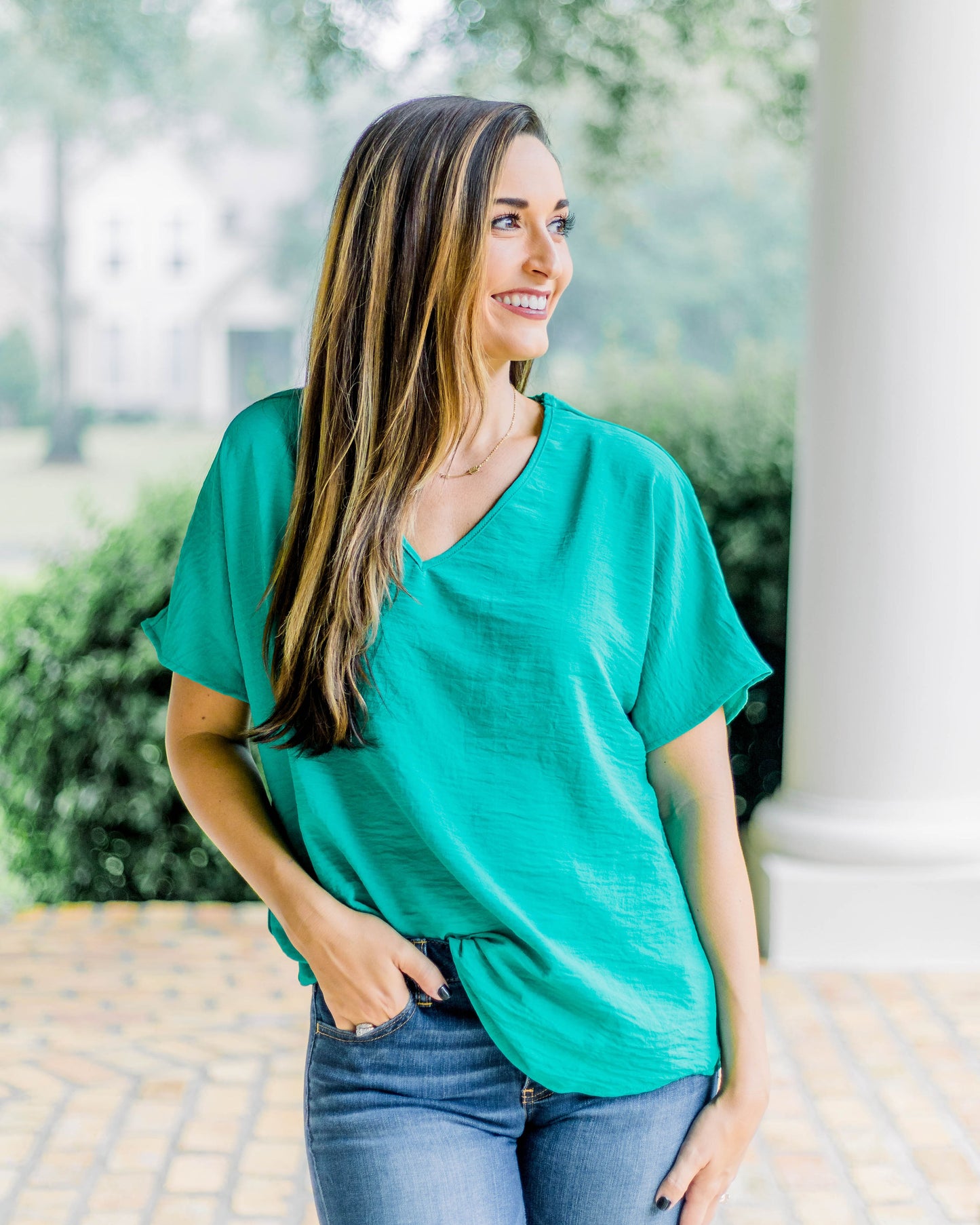 The Flowy V Blouse is a solid v-neck top featuring a rounded hem detail. The fabric is woven and super lightweight! This top can be taken from the office to the weekend. Style this one front tucked knotted, or untucked and you are sure to be back for more colors. A definite BESTSELLER!