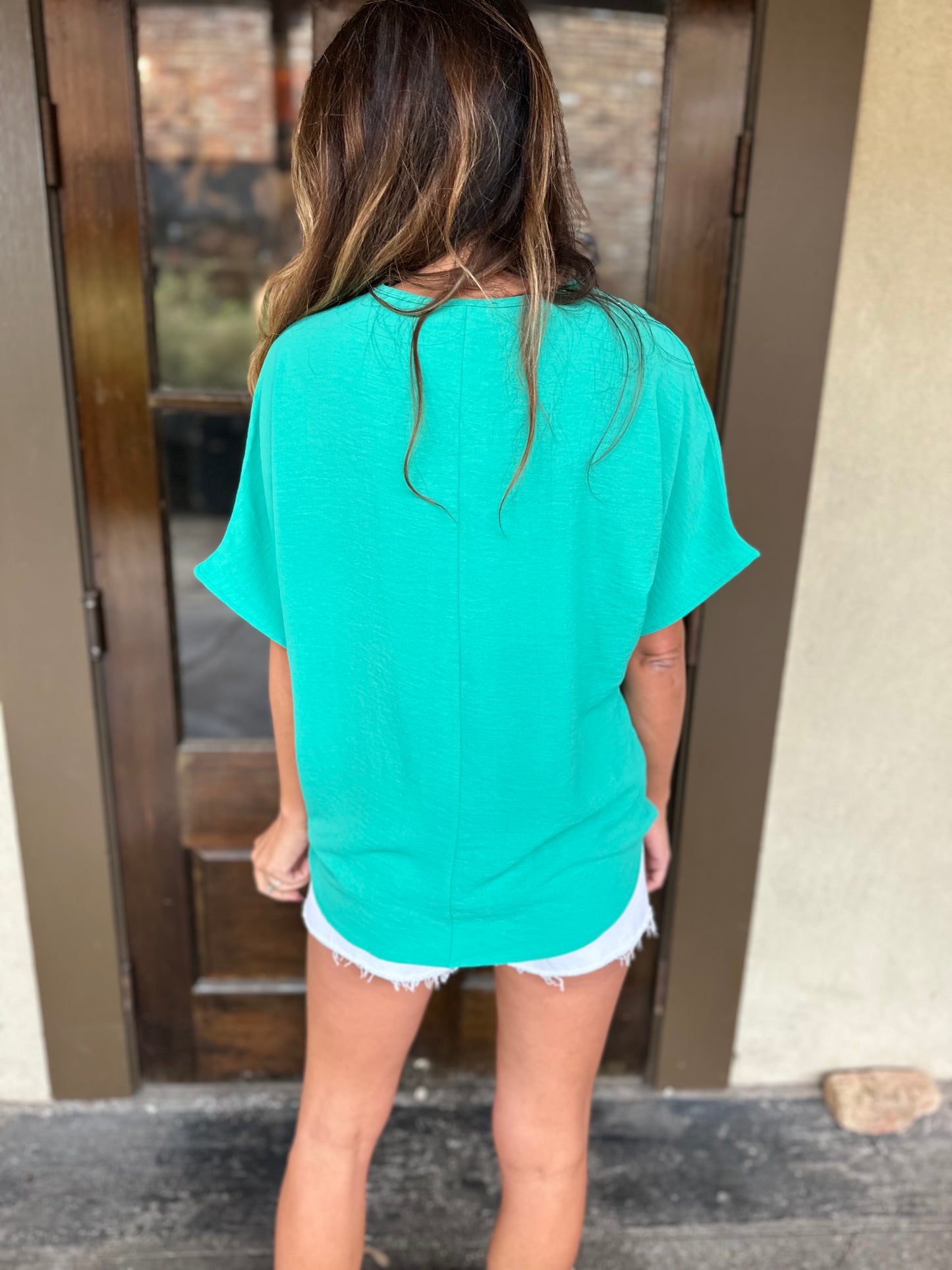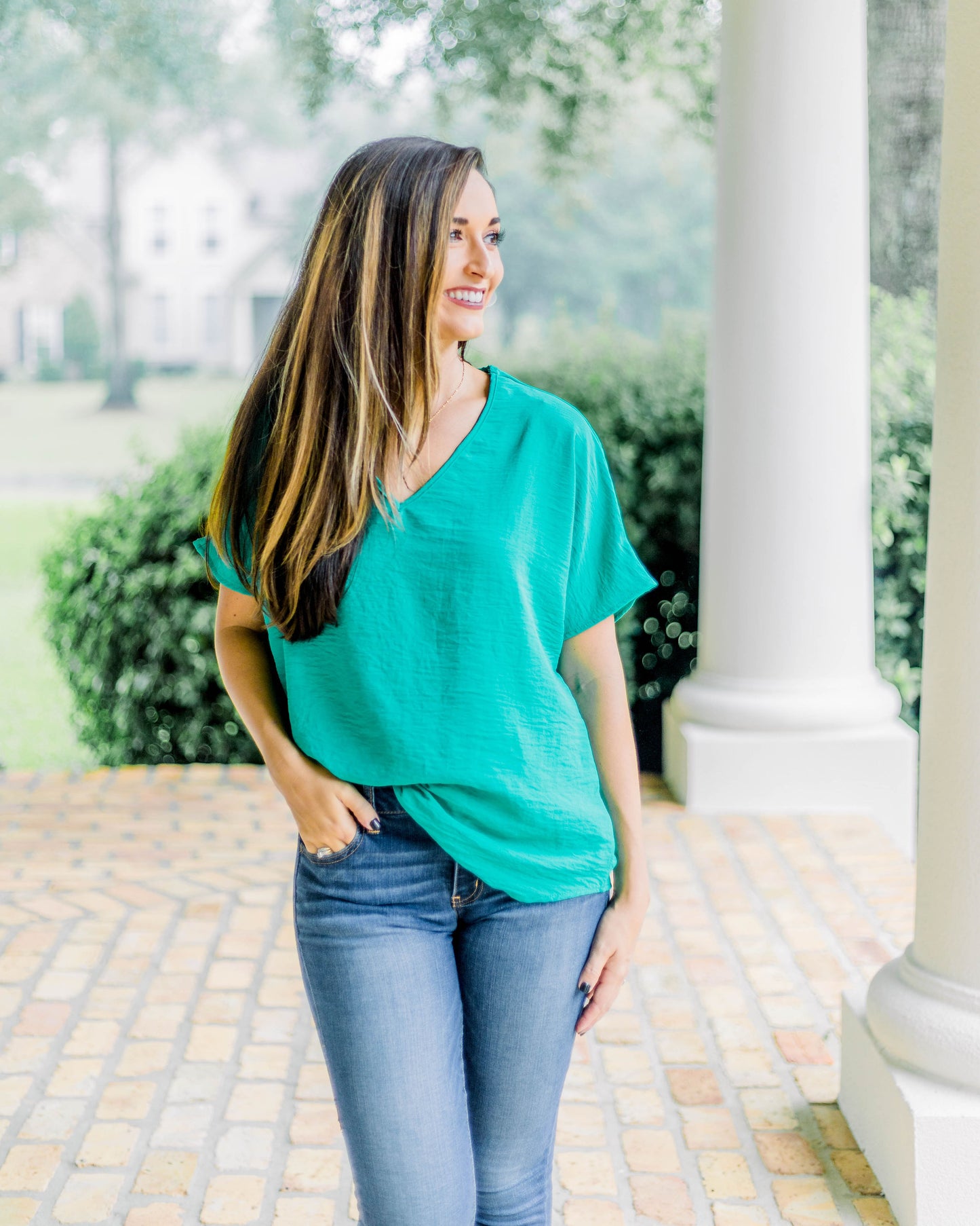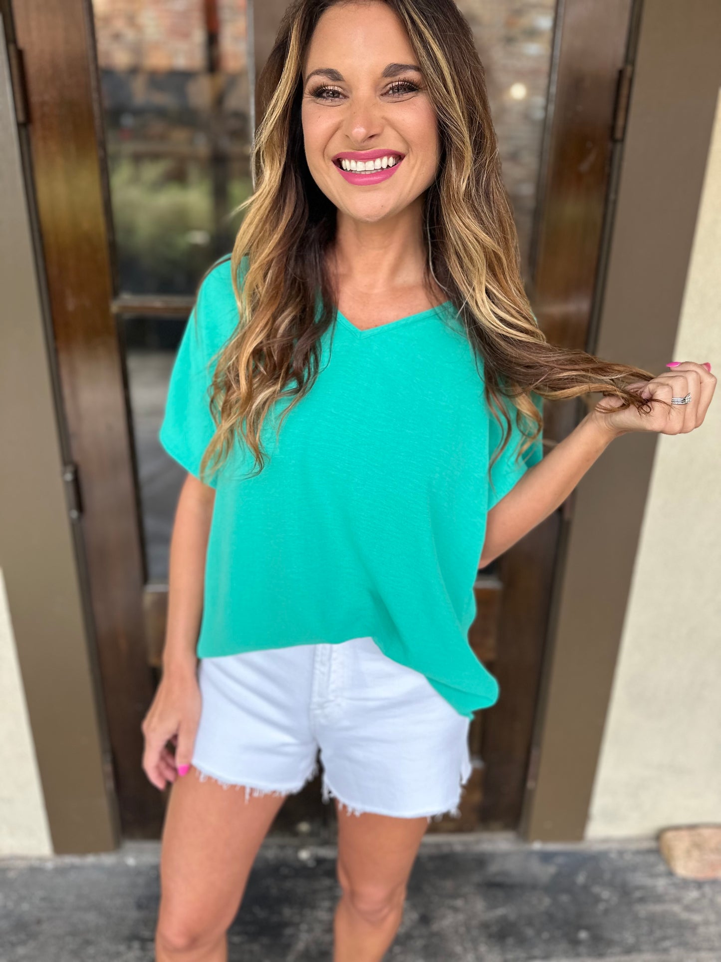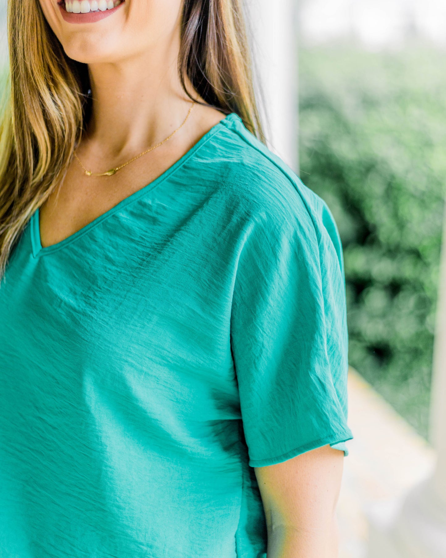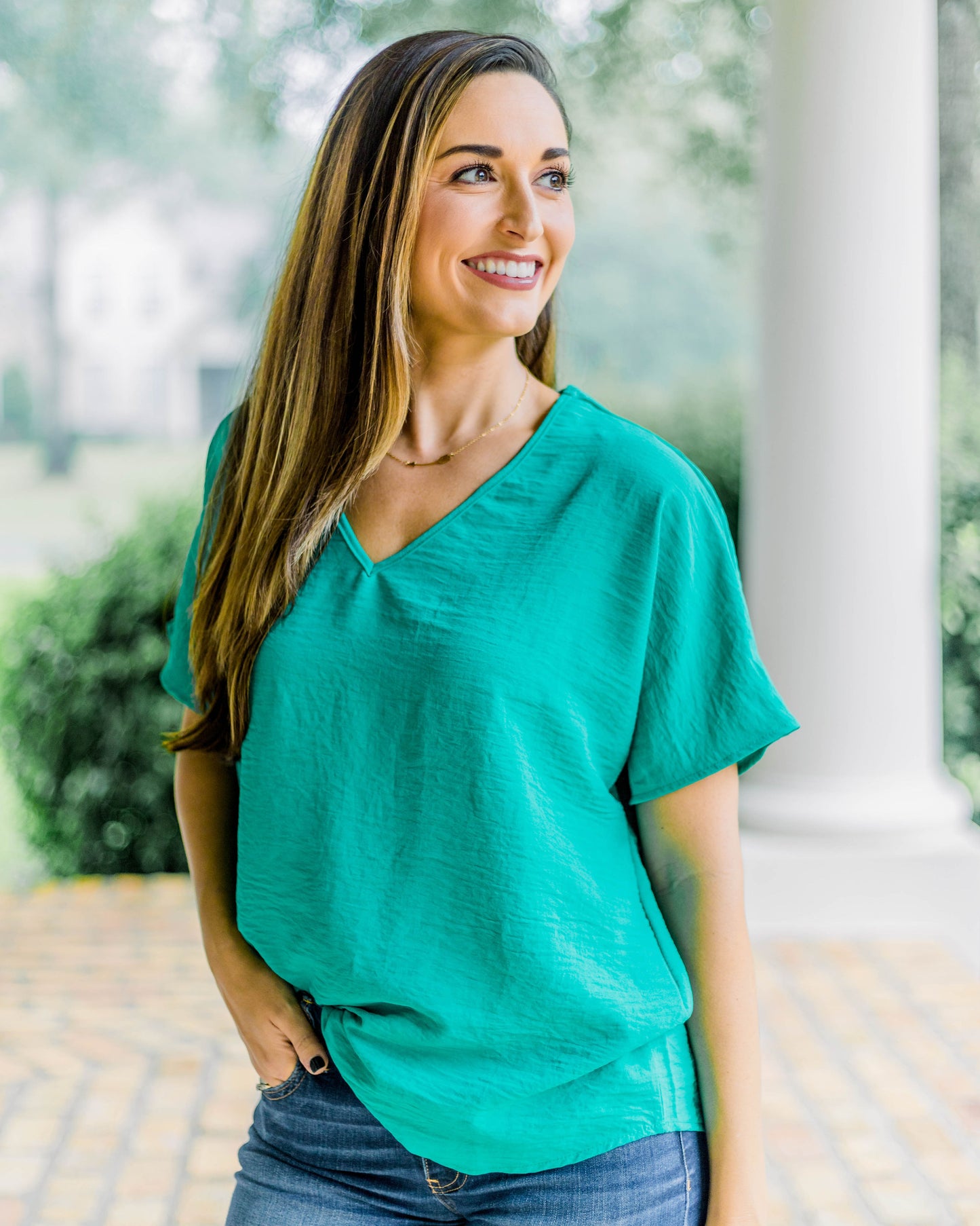 The Flowy V Blouse is a solid v-neck top featuring a rounded hem detail. The fabric is woven and super lightweight! This top can be taken from the office to the weekend. Style this one front tucked knotted, or untucked and you are sure to be back for more colors. A definite BESTSELLER!