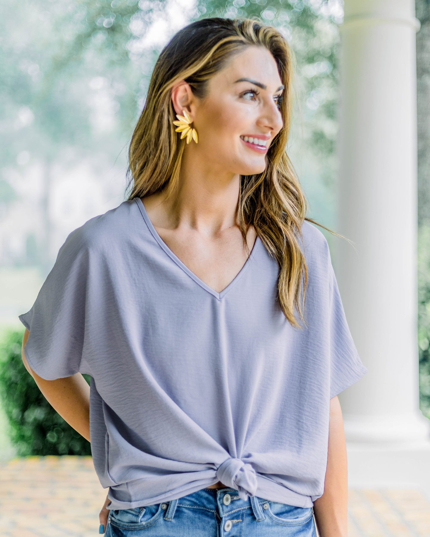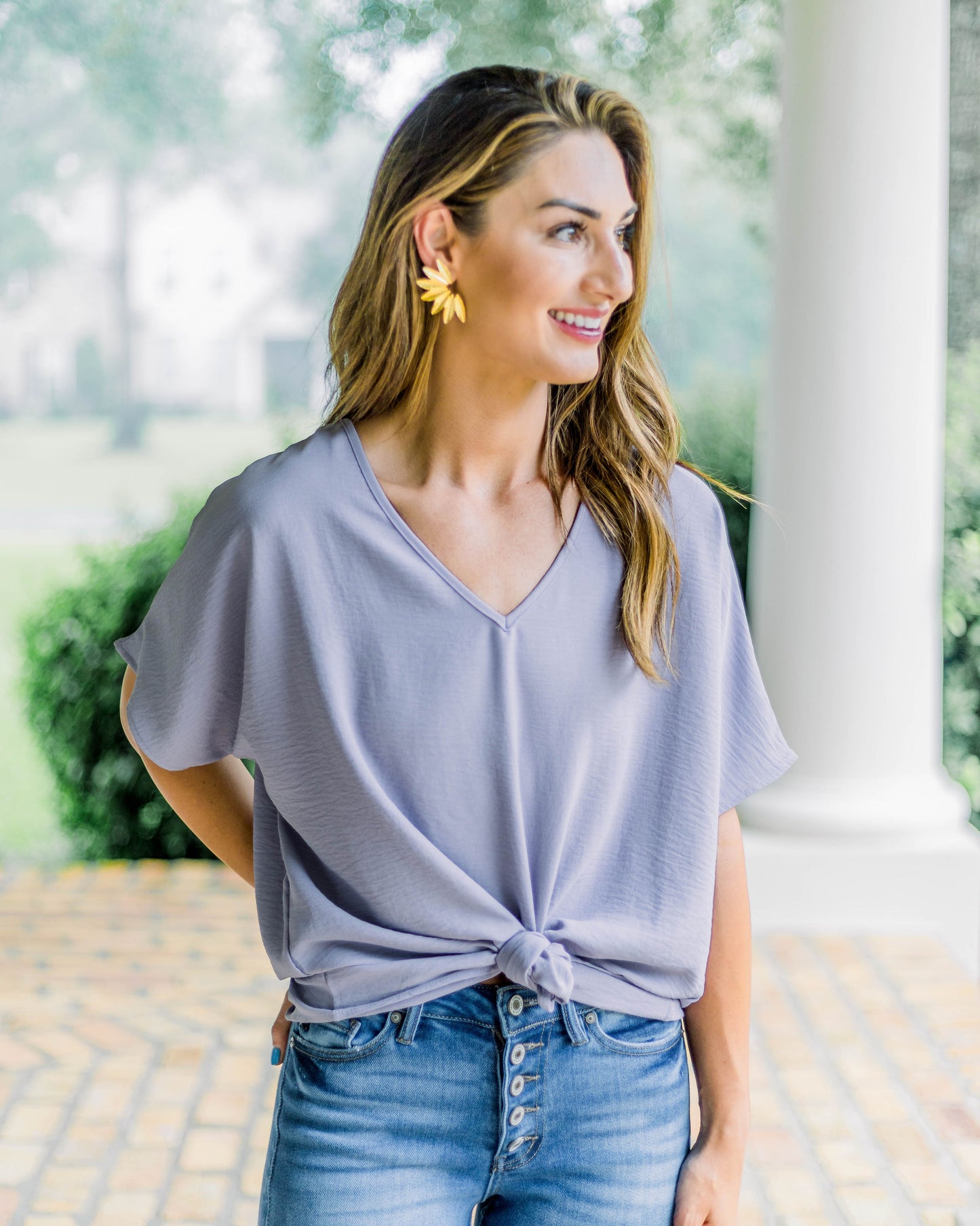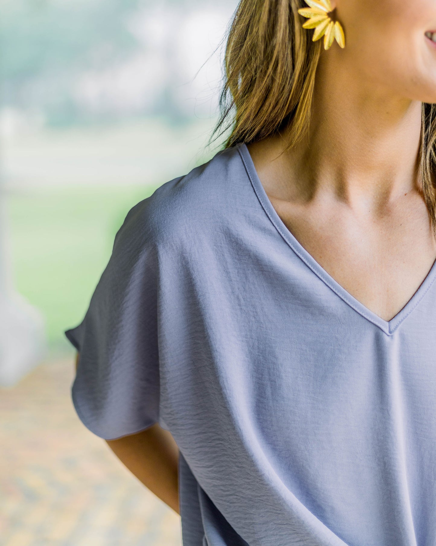 The Flowy V Blouse is a solid v-neck top featuring a rounded hem detail. The fabric is woven and super lightweight! This top can be taken from the office to the weekend. Style this one front tucked knotted, or untucked and you are sure to be back for more colors. A definite BESTSELLER!