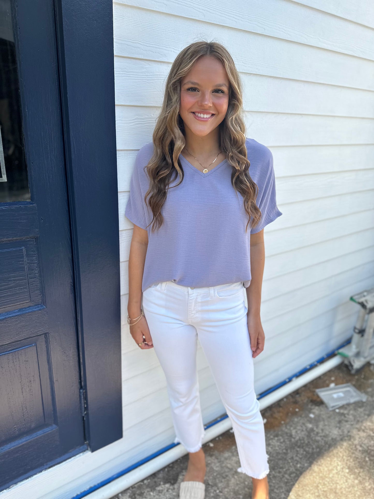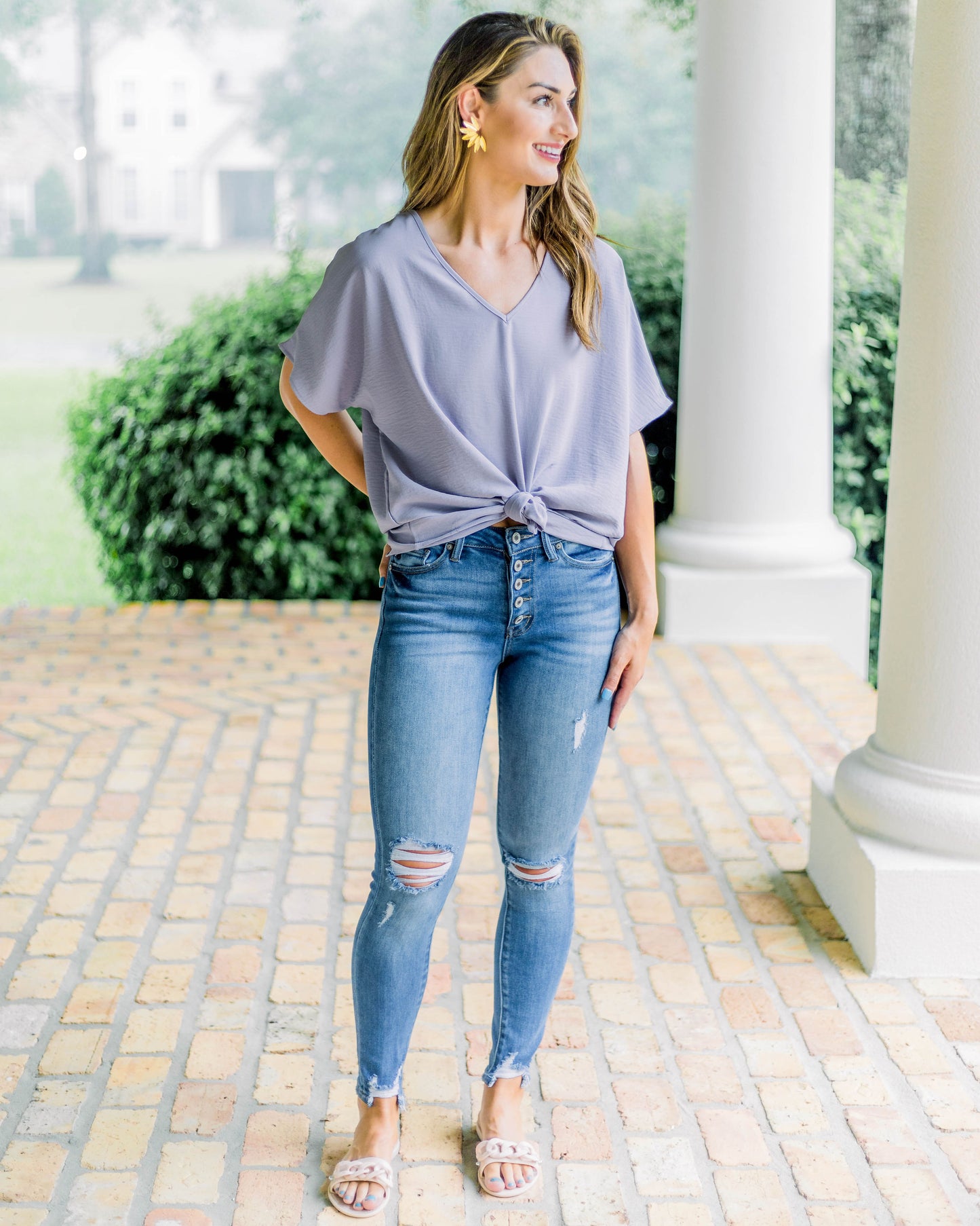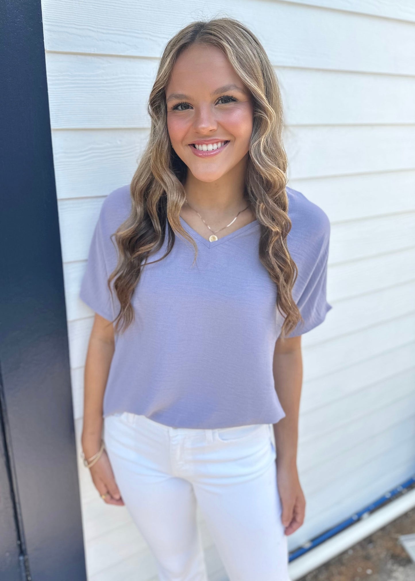 The Flowy V Blouse is a solid v-neck top featuring a rounded hem detail. The fabric is woven and super lightweight! This top can be taken from the office to the weekend. Style this one front tucked knotted, or untucked and you are sure to be back for more colors. A definite BESTSELLER!