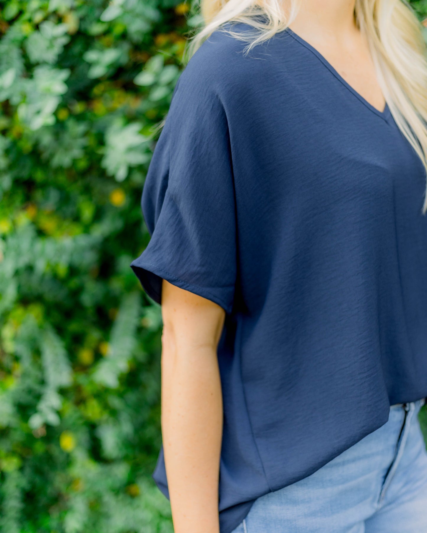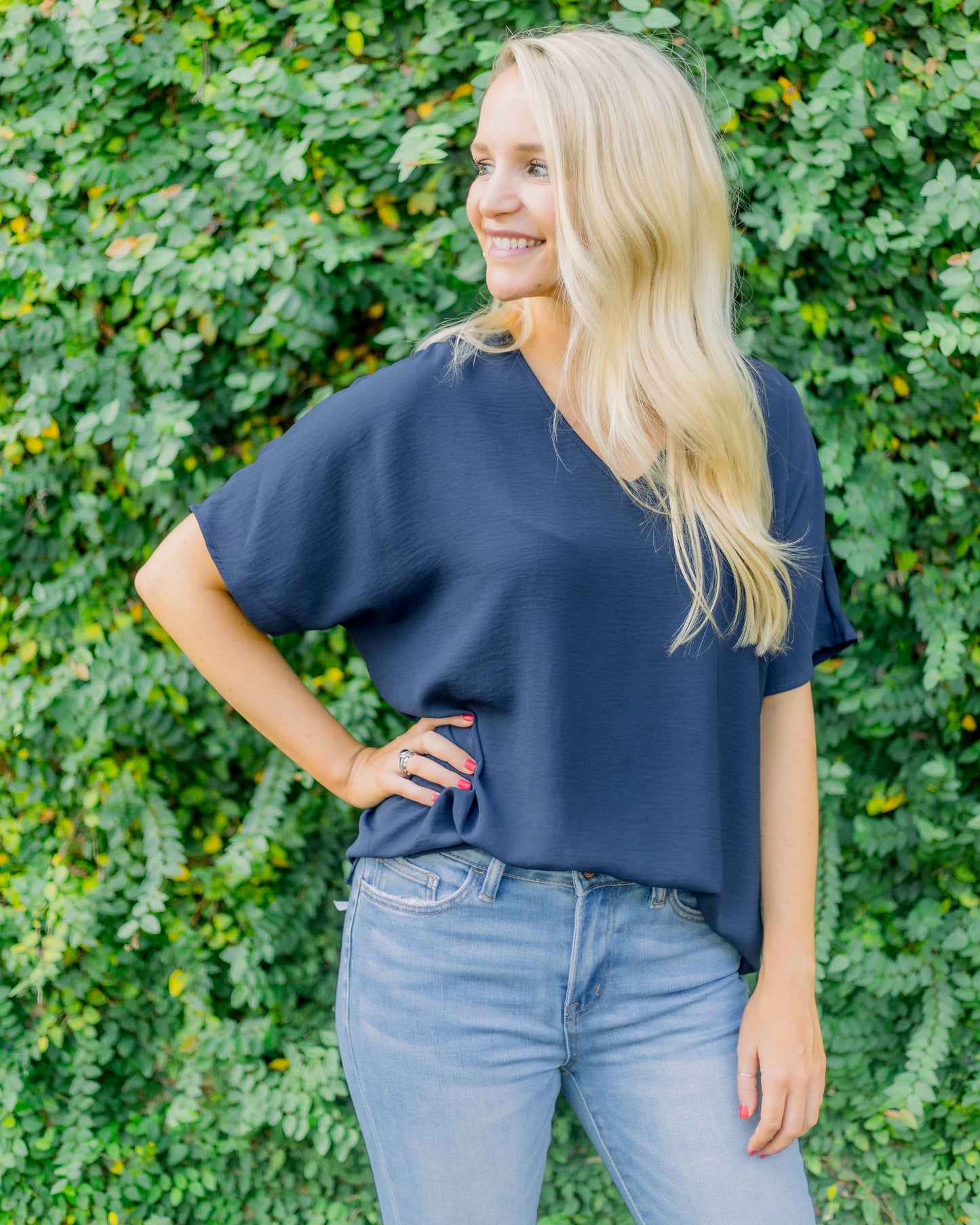The Flowy V Blouse is a solid v-neck top featuring a rounded hem detail. The fabric is woven and super lightweight! This top can be taken from the office to the weekend. Style this one front tucked knotted, or untucked and you are sure to be back for more colors. A definite BESTSELLER!