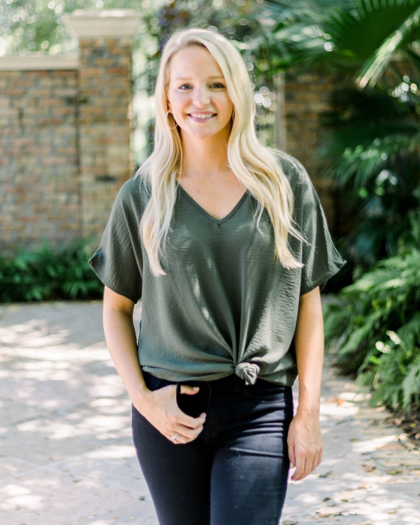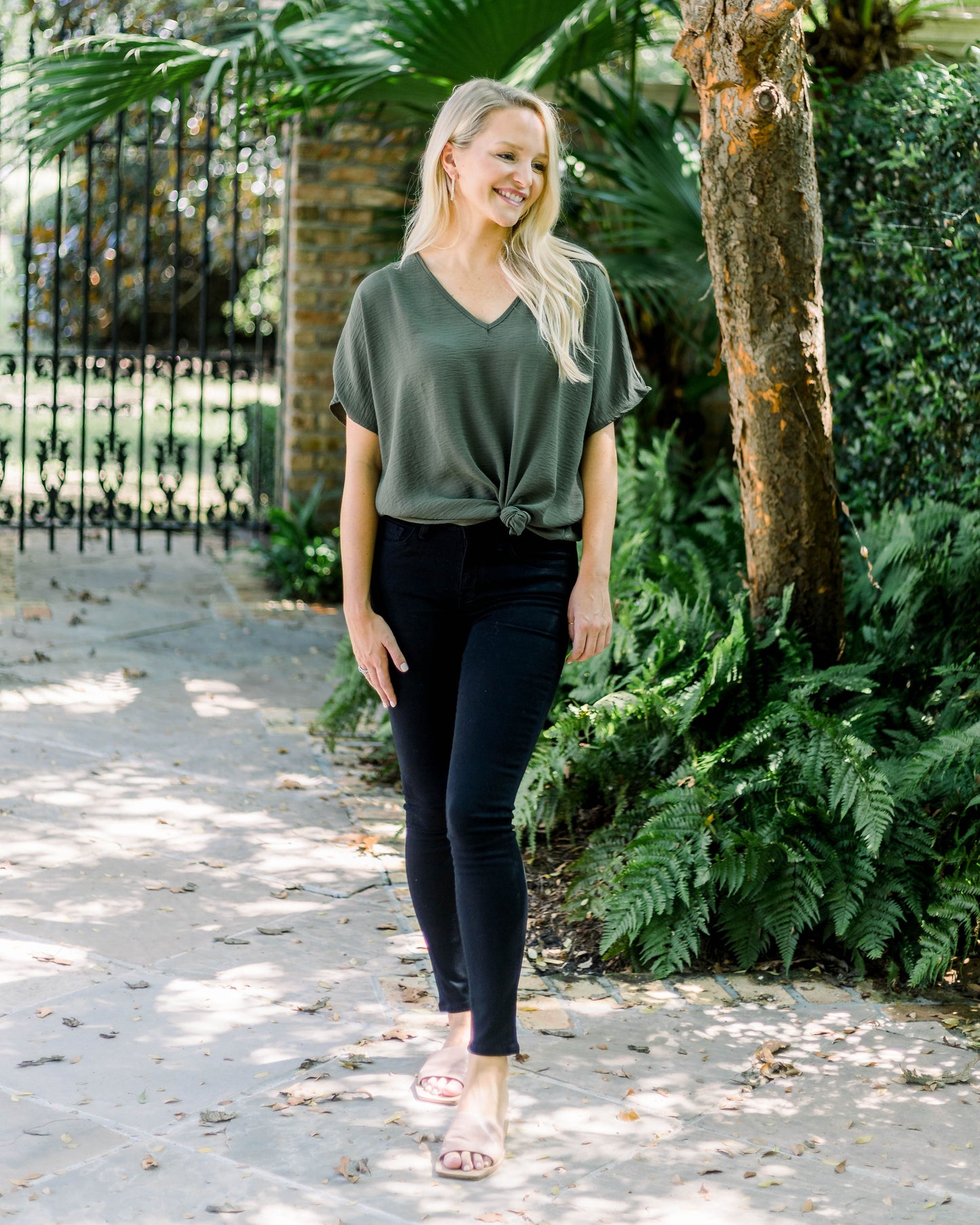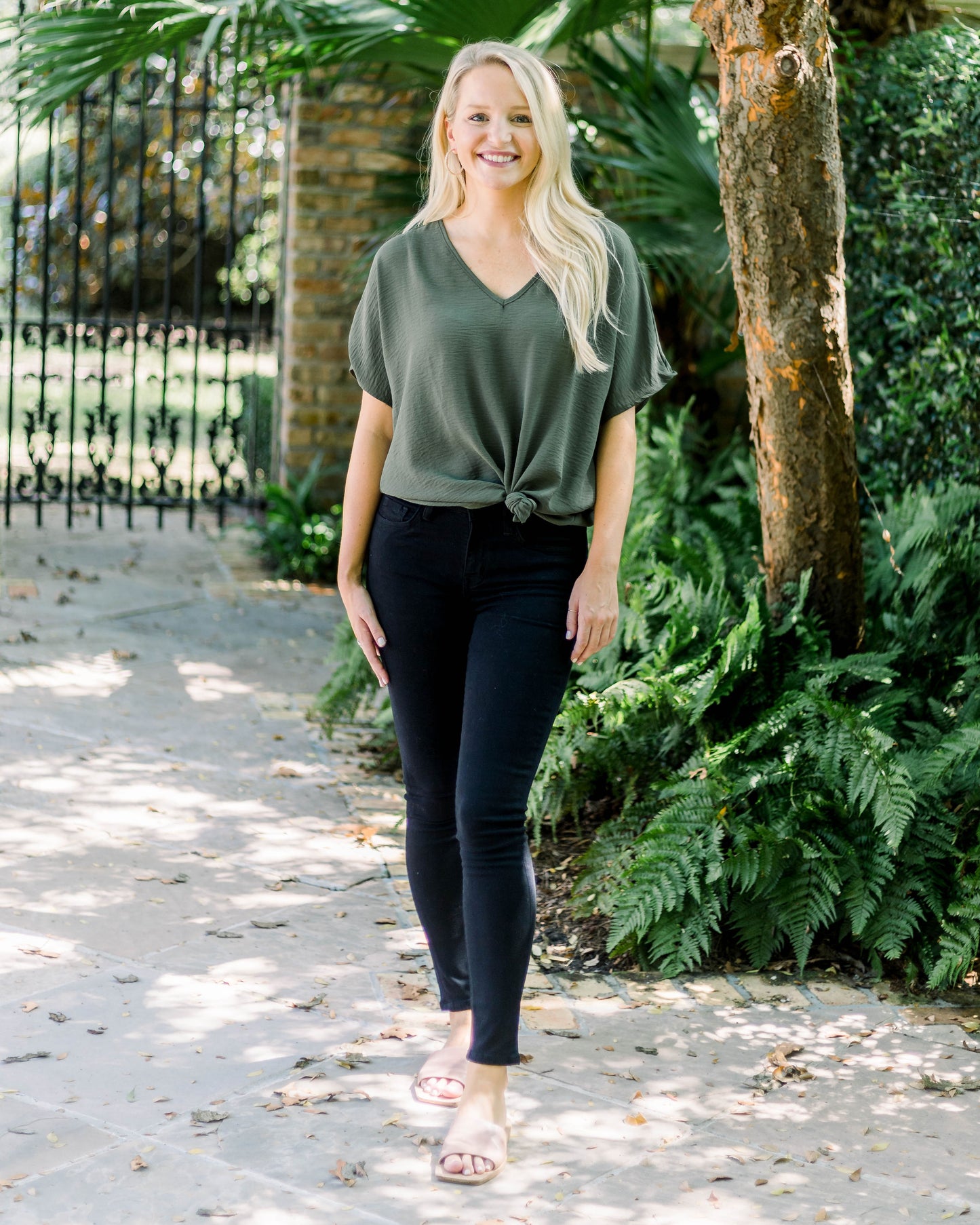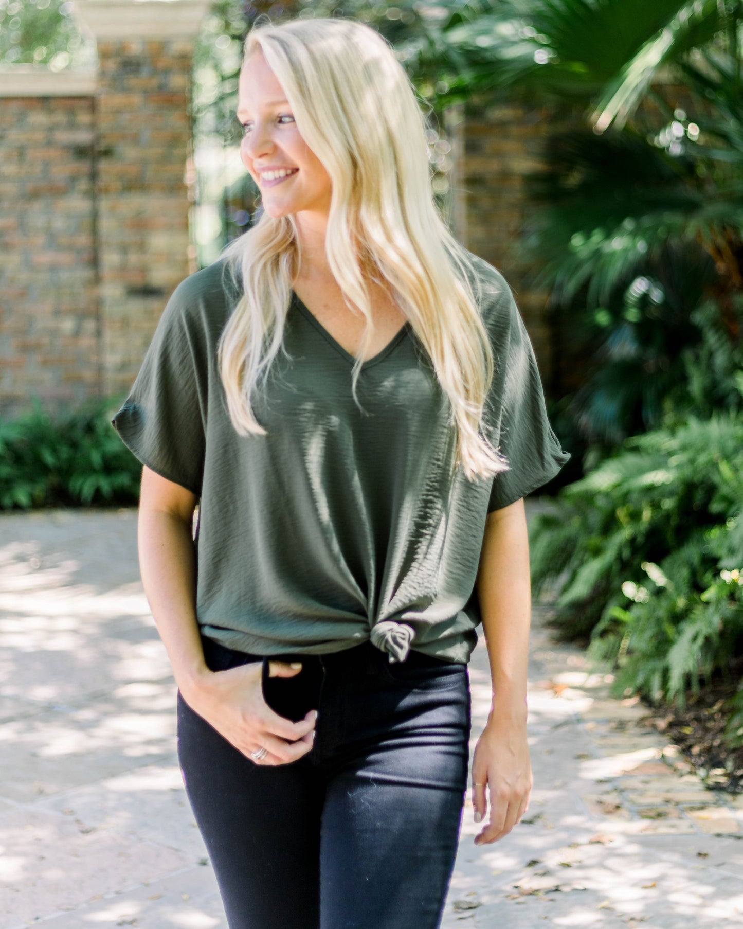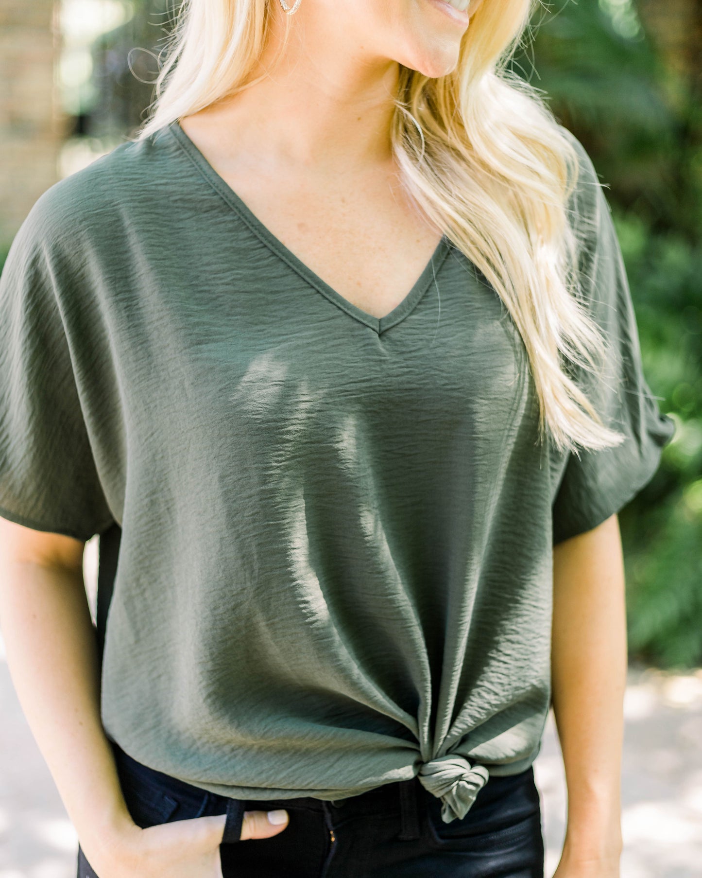 The Flowy V Blouse is a solid v-neck top featuring a rounded hem detail. The fabric is woven and super lightweight! This top can be taken from the office to the weekend. Style this one front tucked knotted, or untucked and you are sure to be back for more colors. A definite BESTSELLER!