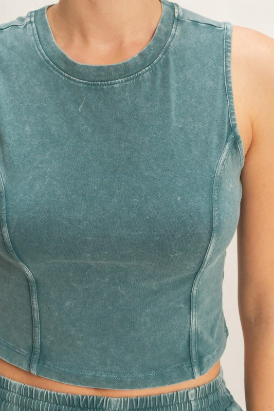 We love a good resemblance of one of our favorite brands!!!! Embrace effortless style with this mineral-washed two-piece set. The sleeveless, cropped top features a ribbed crew neckline and princess lines for a flattering, structured fit. Pair it with the relaxed wide-leg pants, complete with an elastic drawstring waist and convenient side pockets. Perfect for creating a laid-back, put-together look with your favorite clean trainers.