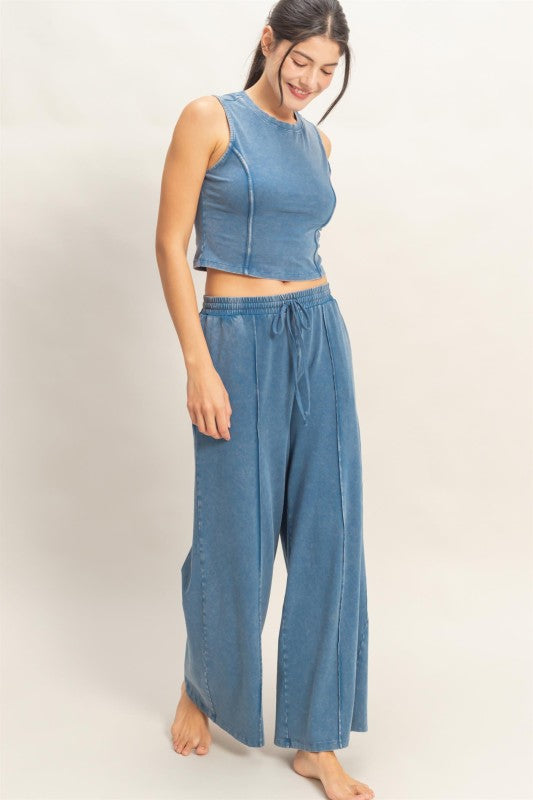 We love a good resemblance of one of our favorite brands!!!! Embrace effortless style with this mineral-washed two-piece set. The sleeveless, cropped top features a ribbed crew neckline and princess lines for a flattering, structured fit. Pair it with the relaxed wide-leg pants, complete with an elastic drawstring waist and convenient side pockets. Perfect for creating a laid-back, put-together look with your favorite clean trainers.