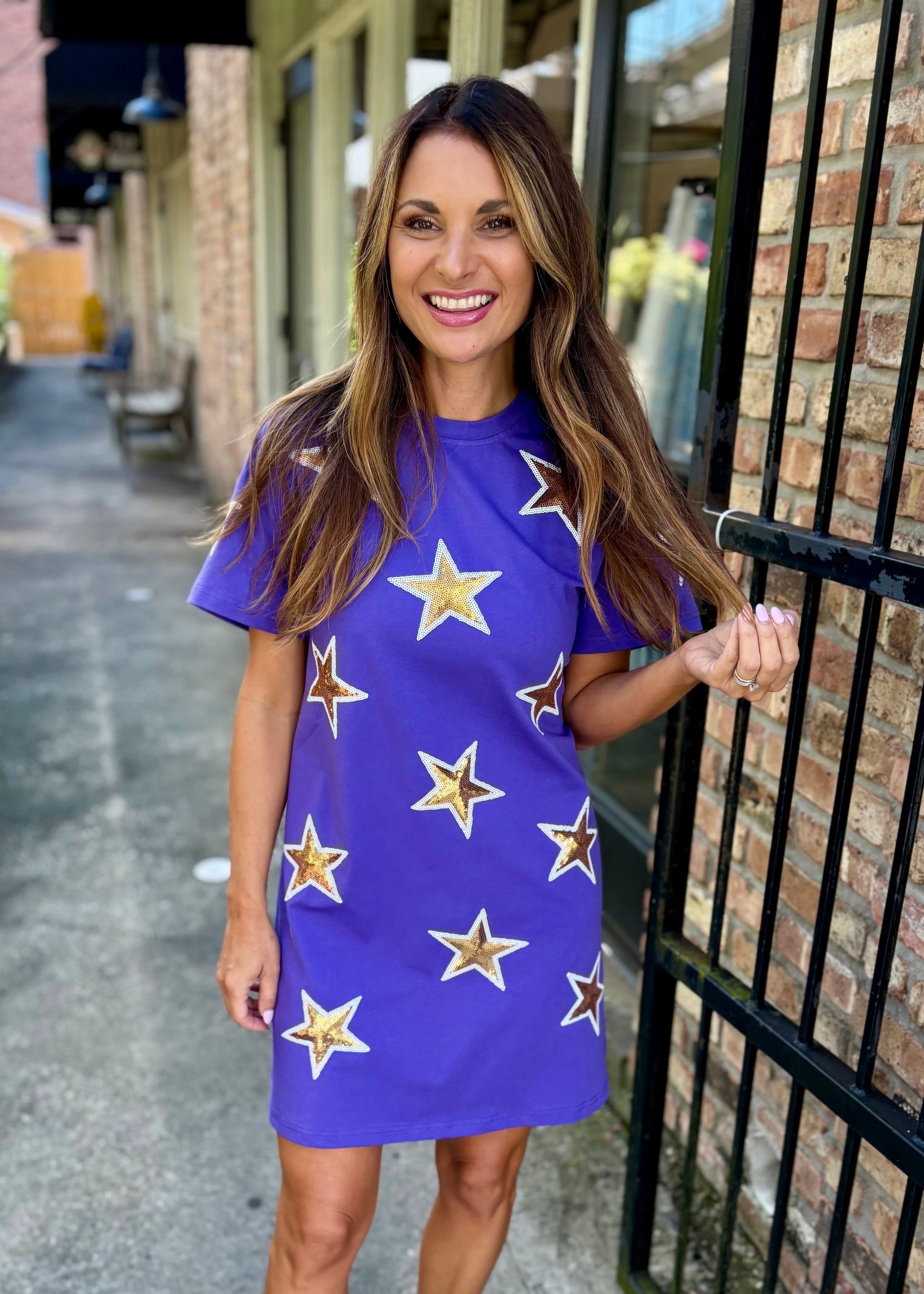 Shine bright on game day with this playful purple dress adorned with sparkling gold sequin stars. Perfect for showing your team spirit with a fun and festive flair, it’s sure to make you the star of the crowd. Comfortable and eye-catching, this dress brings energy and excitement to every celebration.