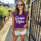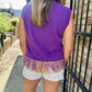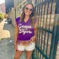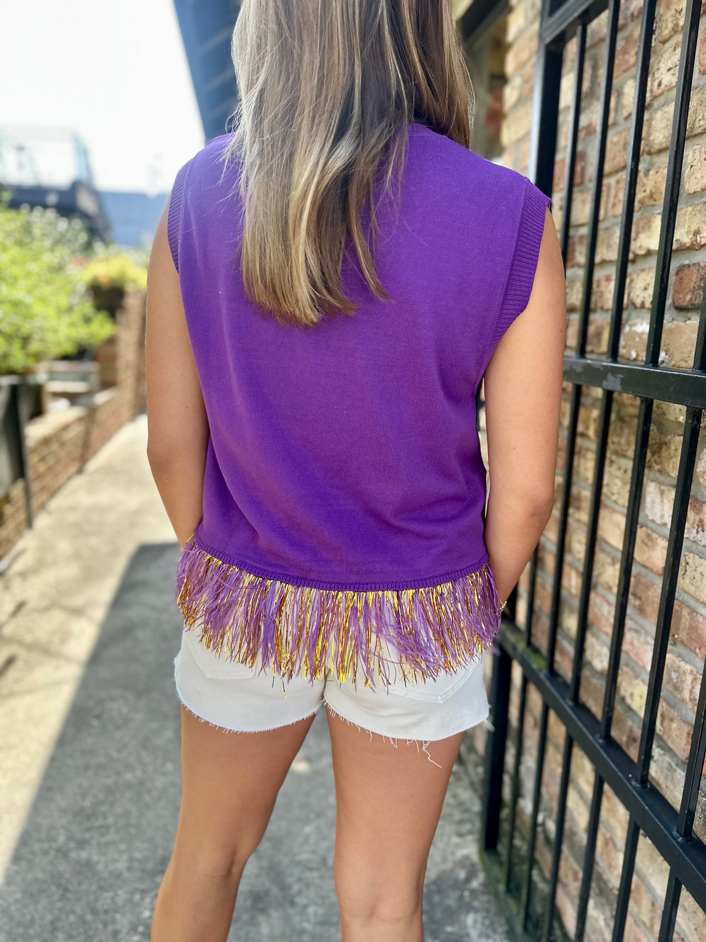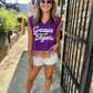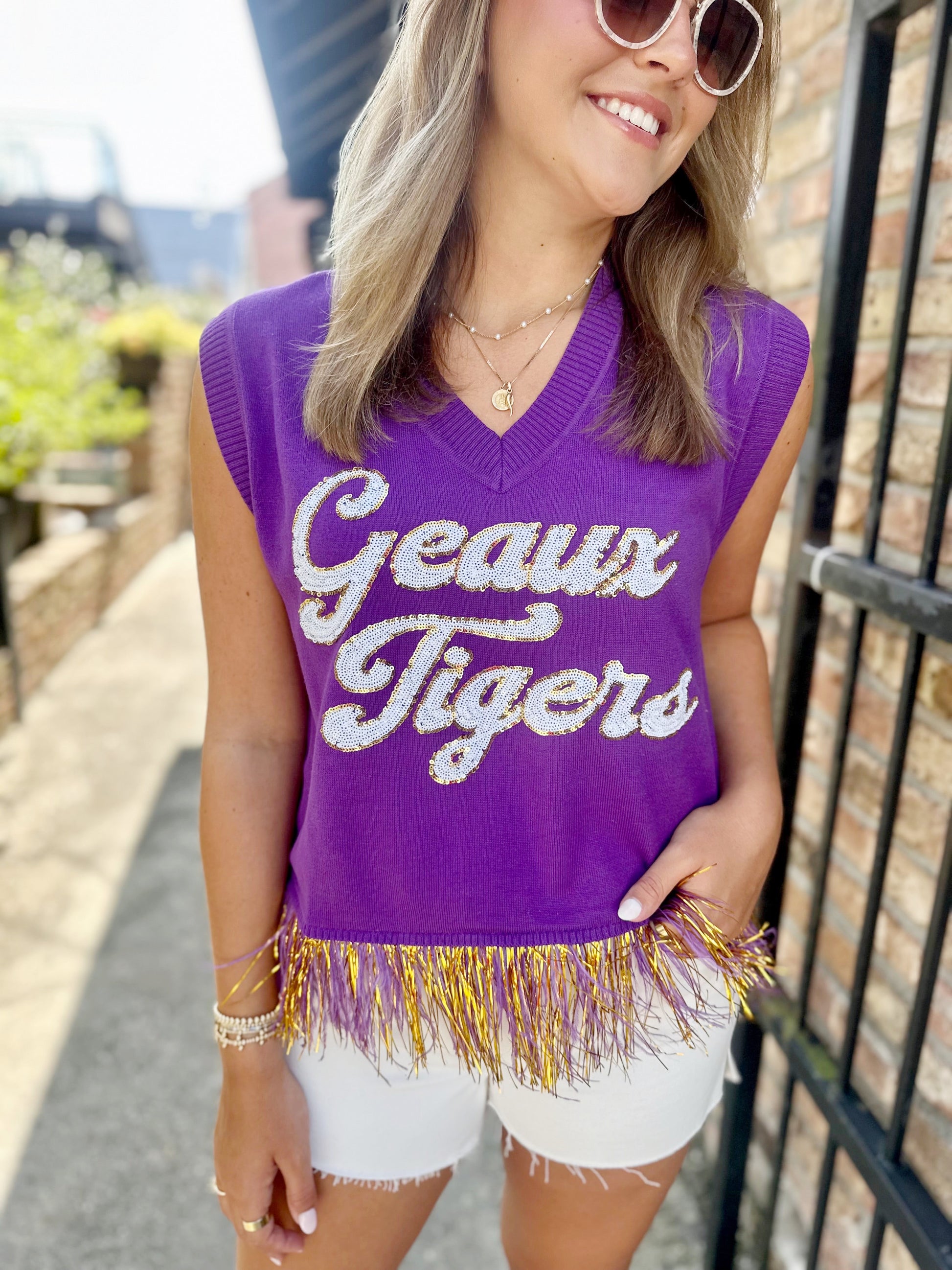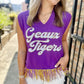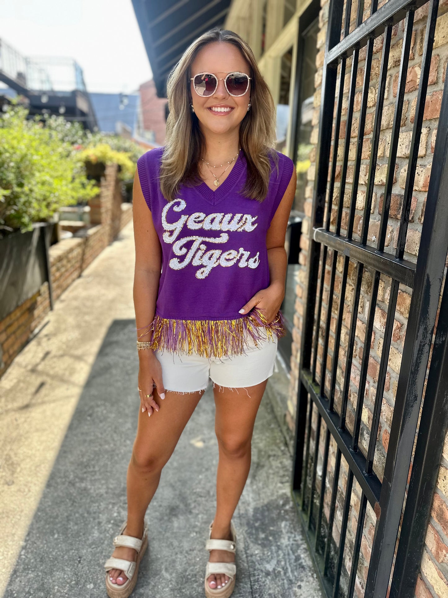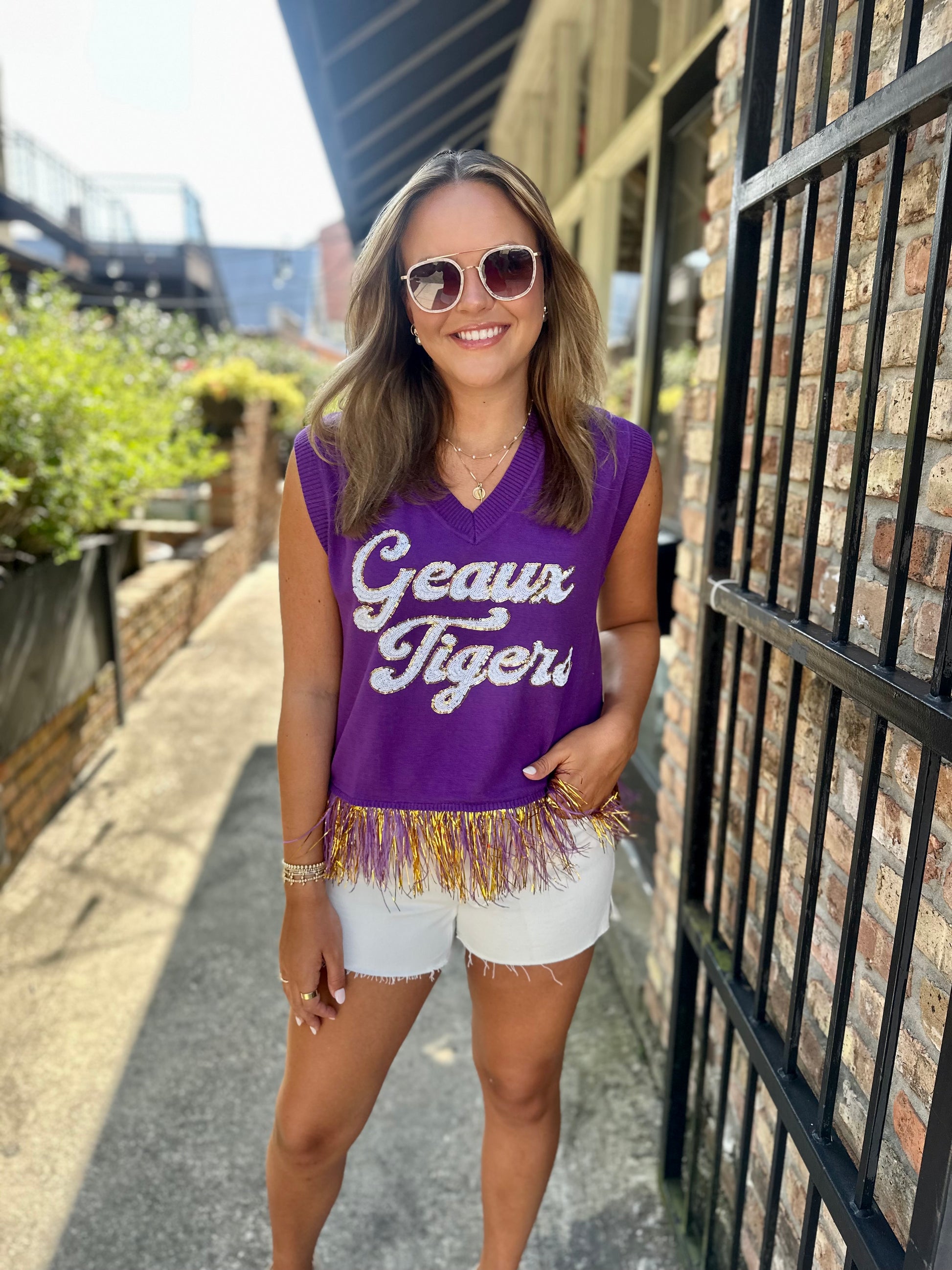 Show your LSU pride with this playful Geaux Tigers Feather Bottom Sweater Tank. Featuring a fun feathered hem, it adds a unique twist to your game day outfit while keeping things light and comfy. Perfect for cheering on your team in style!