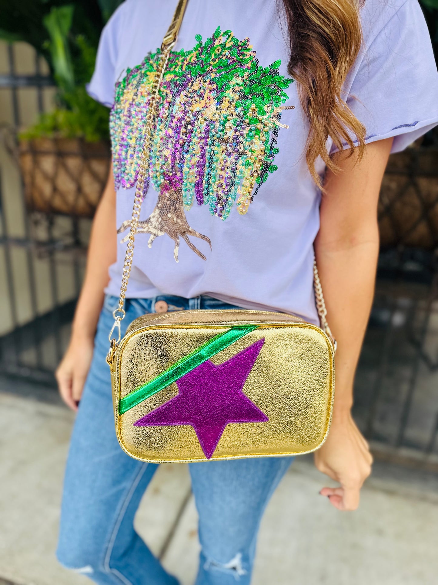 Get ready for a party with the Golden Mardi Gras Bag! This Mardi Gras bag is perfect for any parade day or night. It's lightweight and hands-free design makes it Carnival ready, so you can let loose and have some fun.