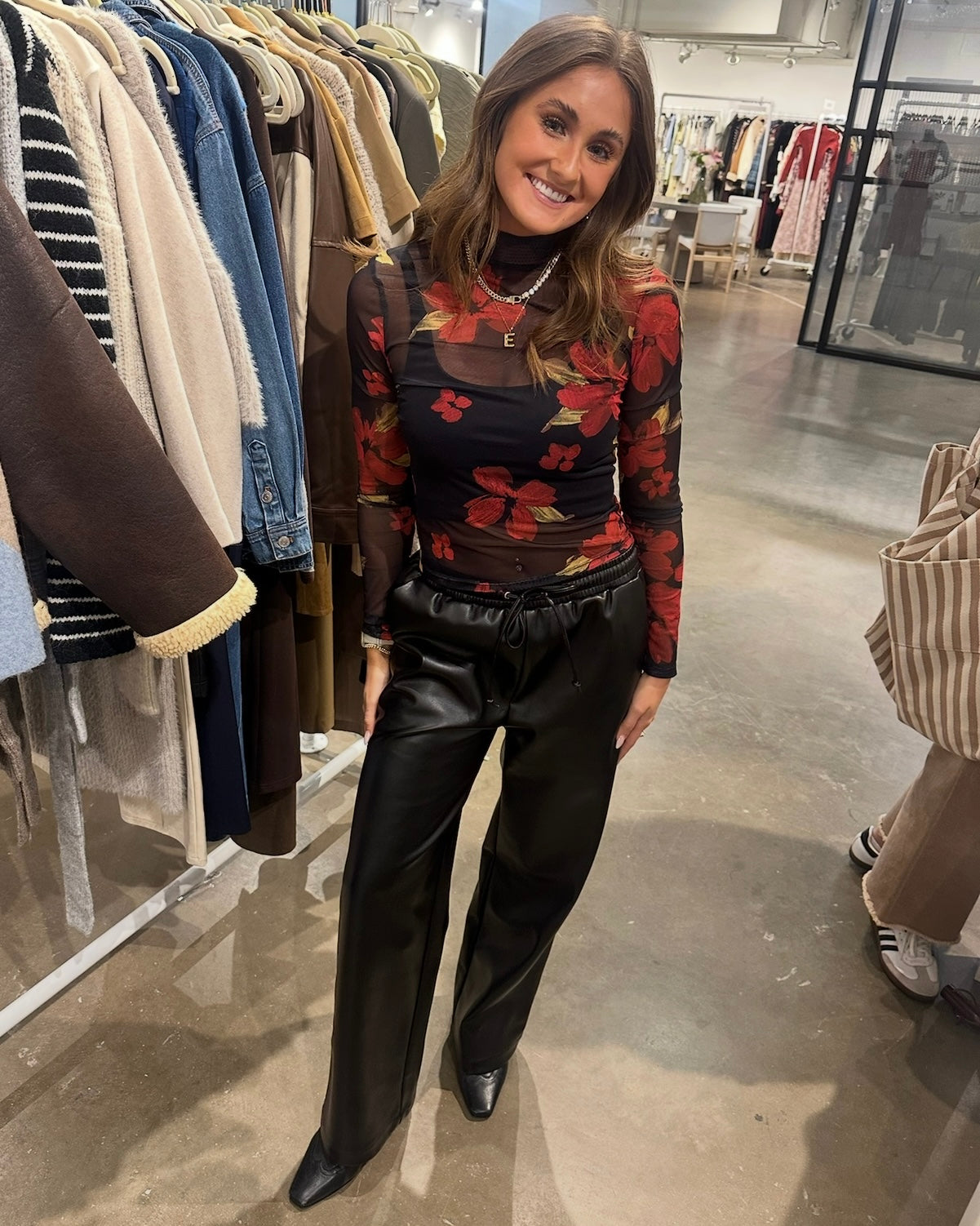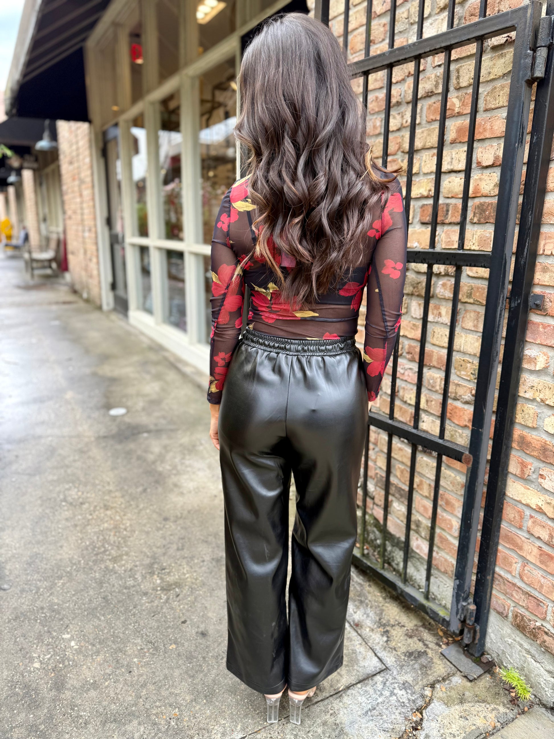 Top is sheer, pair with black bra, tank or bodysuit.