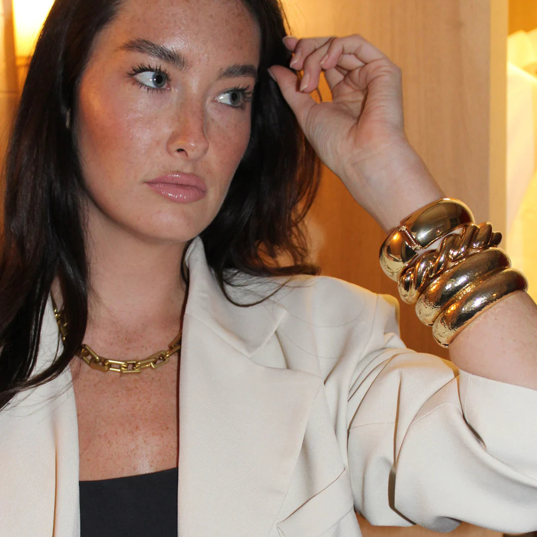Bring a bold sparkle to your look with the Hammered Bangle in Gold. Crafted from stainless steel with a shiny gold plating, its textured surface catches the light beautifully. The hinged closure makes it easy to slip on and off, while the 3/4" width and 7" circumference offer a comfortable, standout fit. Perfect for adding a playful pop of shine to any outfit!