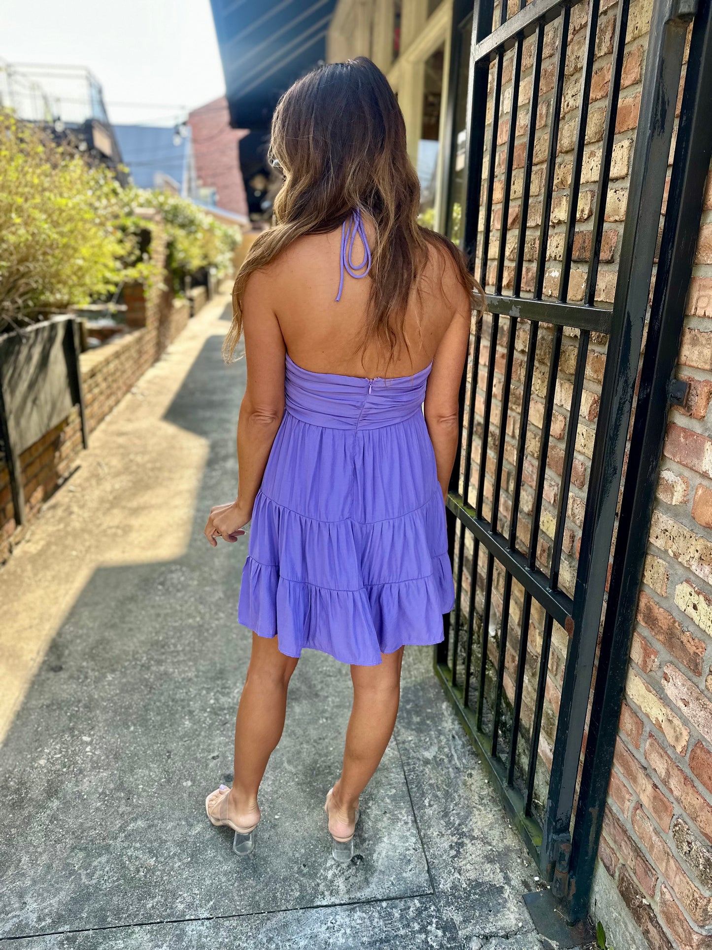 Get ready to turn heads with the Hara Halter Mini Dress in Misty Purple! Featuring a ruched v-neck detail and multi-tiered halter design, this dress is perfect for a night out. Stand out in style and confidence with this flirty and playful piece.