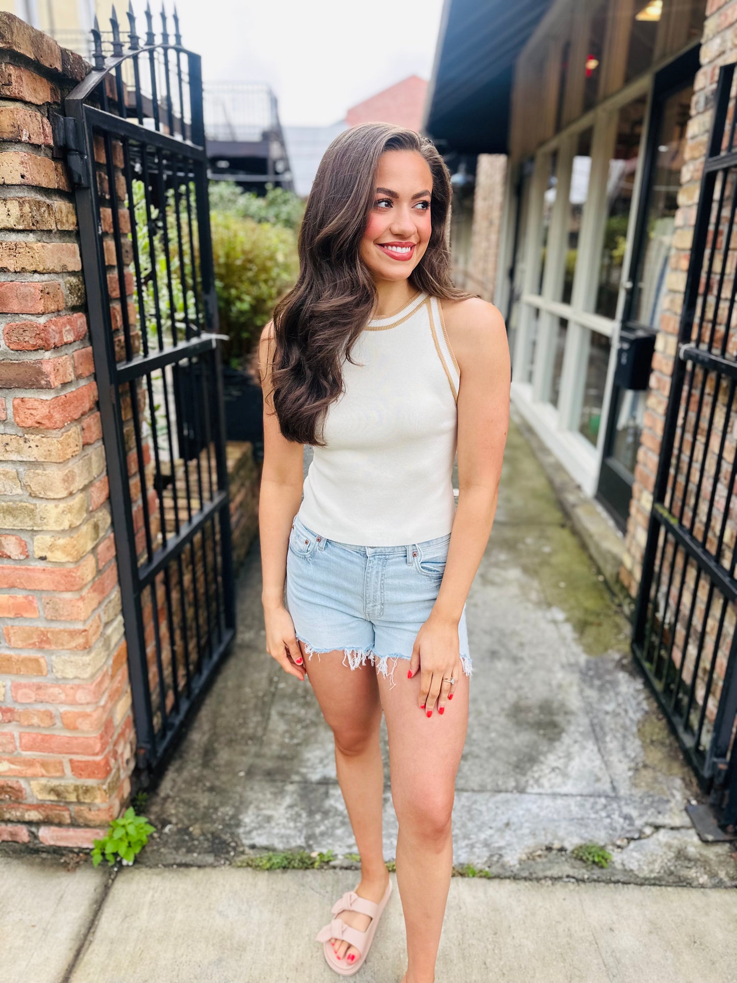 This playful tank sweater in an ivory and sand color combo, features a unique taupe band around the neck and arms for added style. Stay comfy and chic with this quirky addition to your wardrobe.