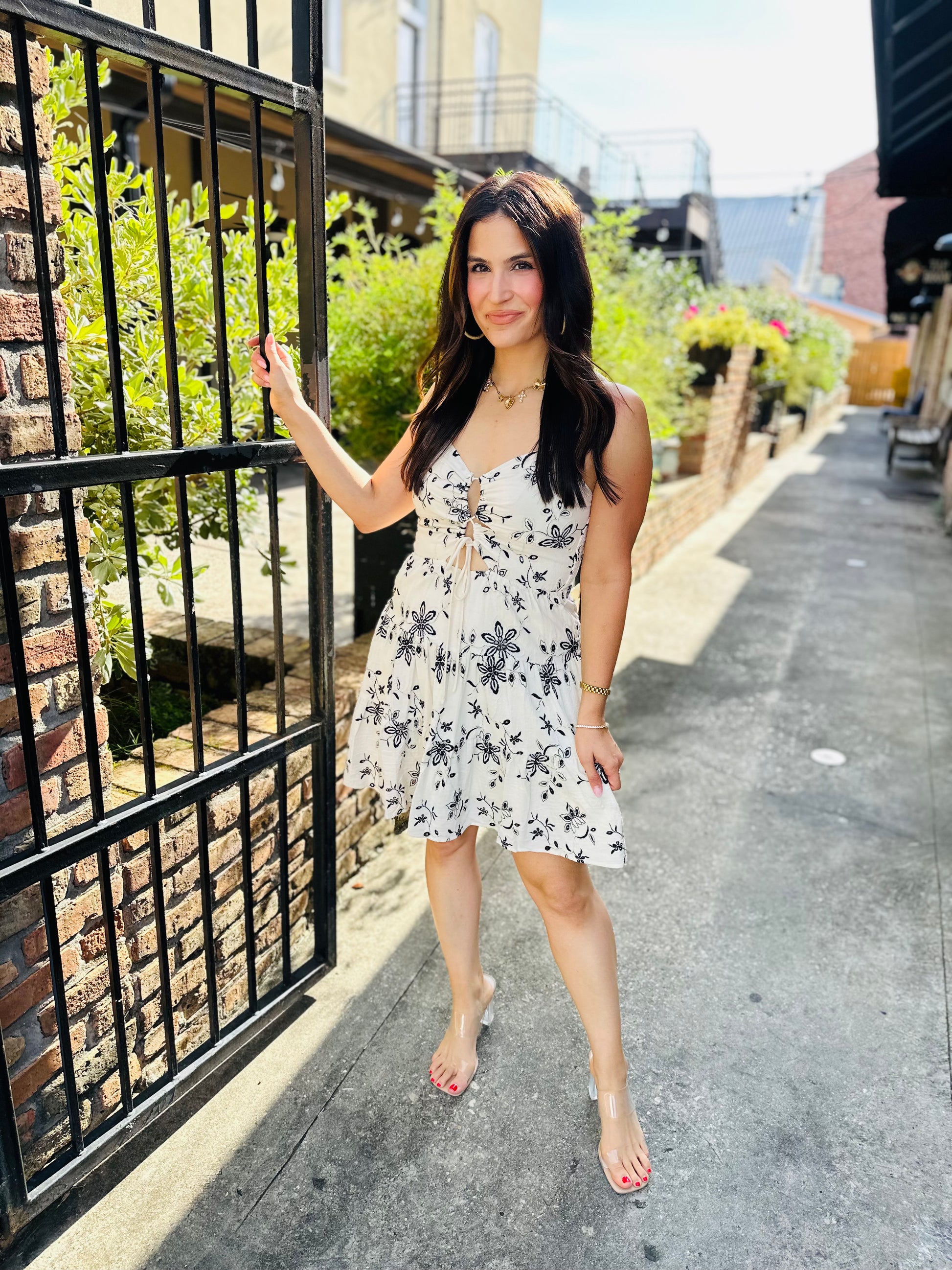 Step into sunshine with the Jaymes Cut Out Dress in Natural Floral. This playful dress features delicate embroidery and charming cut-out details that add a flirty touch to your look. Perfect for garden parties or weekend brunches, it combines comfort and style effortlessly. Embrace the floral vibes and let your outfit bloom!