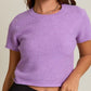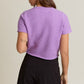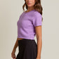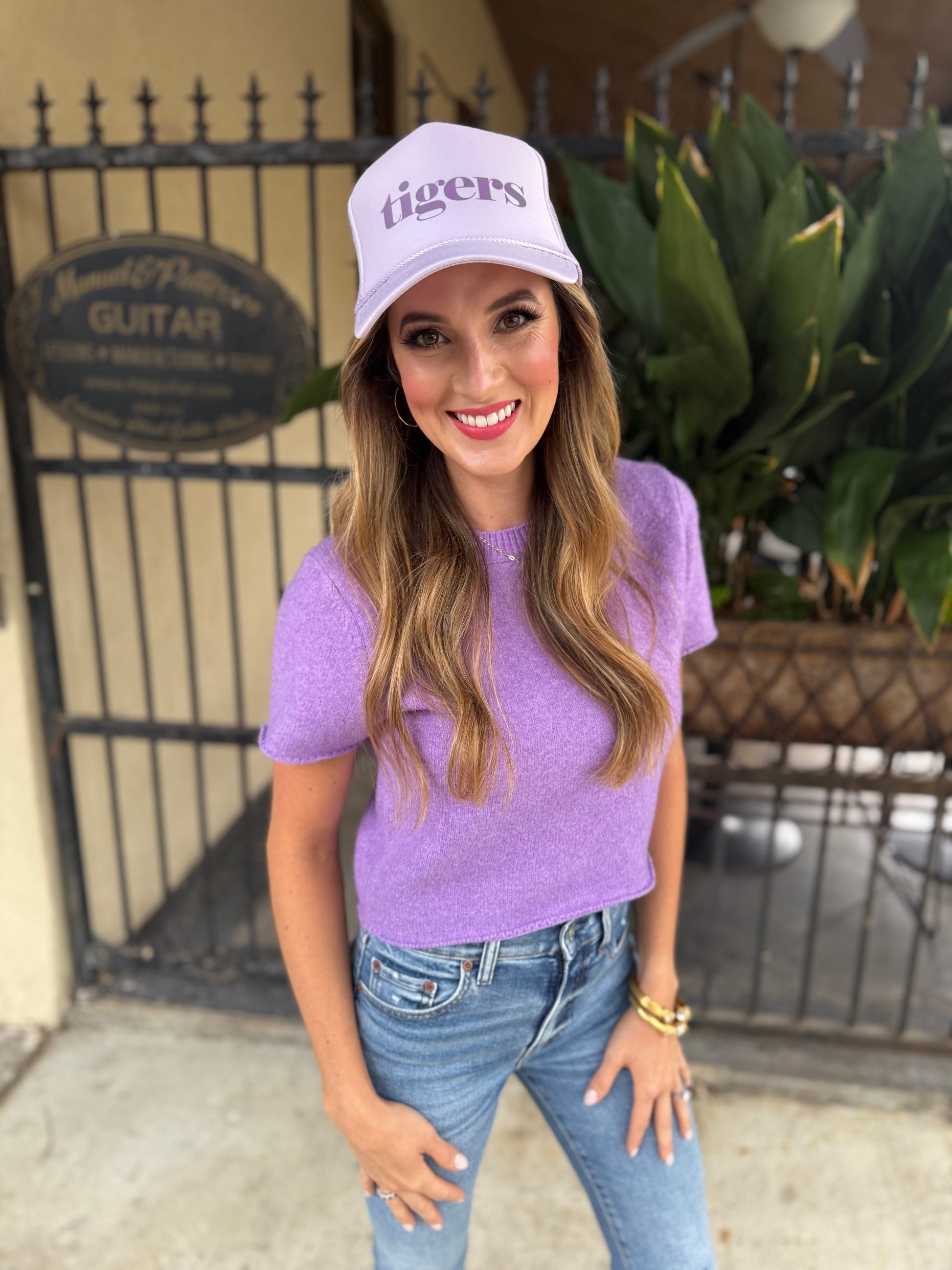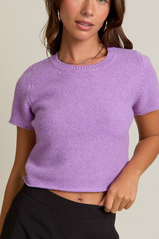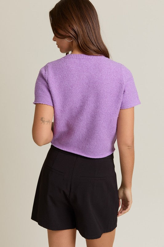 This playful purple crop sweater hits right at the waistline, making it the perfect piece to show off your favorite high-waisted jeans or skirts. Its short sleeves keep things light and breezy, while the cozy knit adds just the right touch of warmth for those in-between days. Easy to mix, match, and love!
