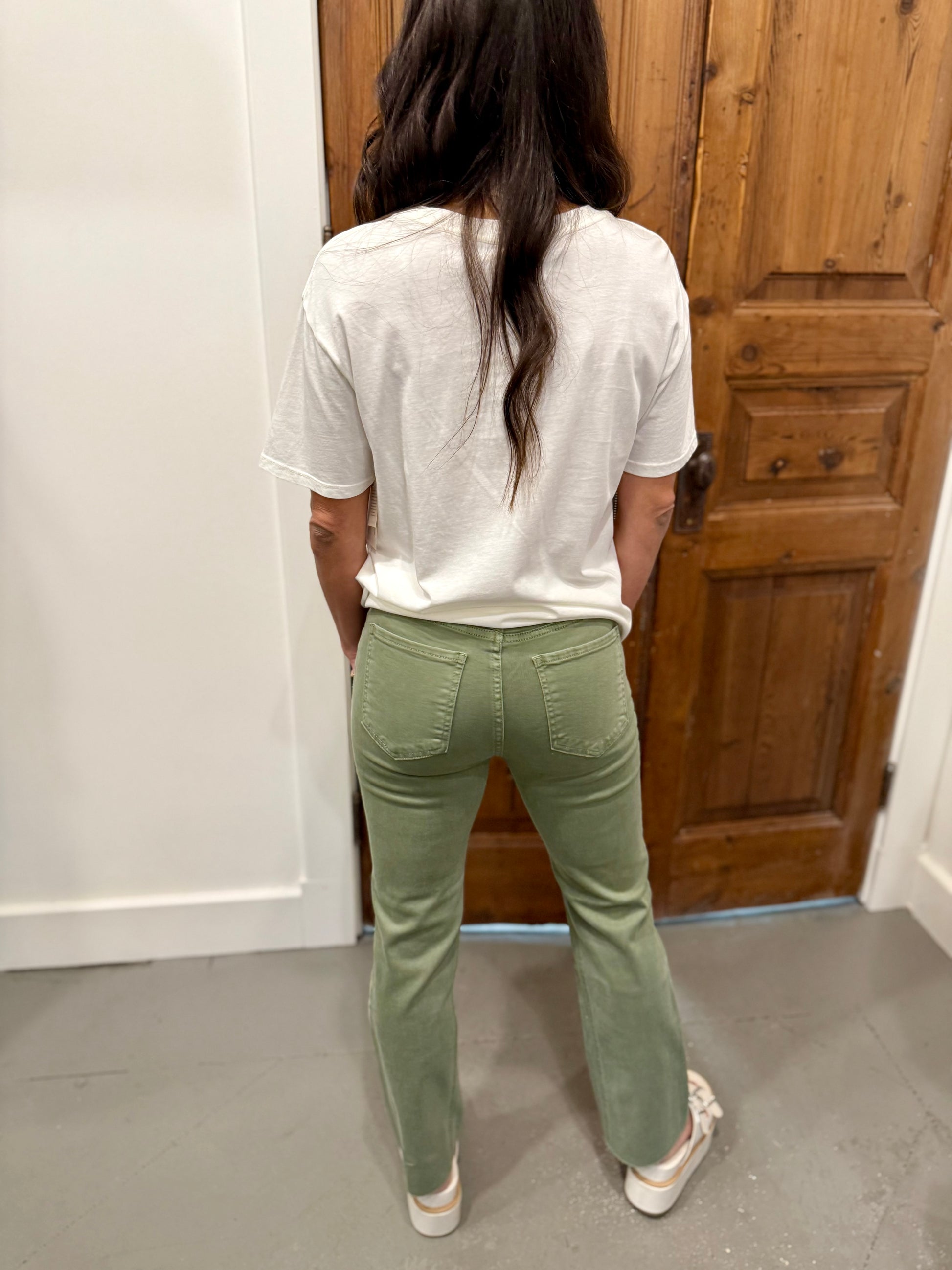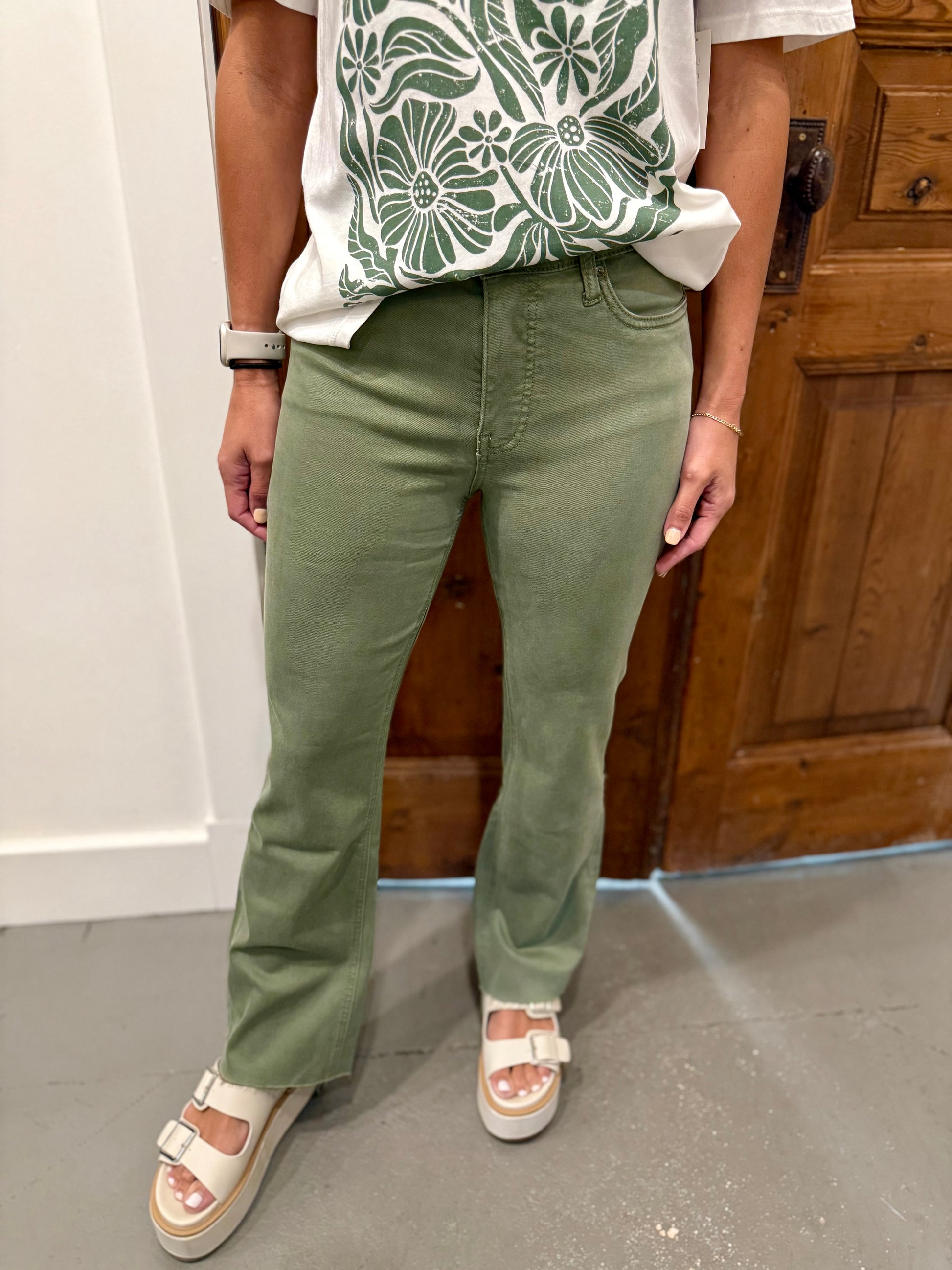 Elevate your everyday look with these high rise Ankle Flare jeans, crafted in a soft sage color for a fresh and modern twist on classic denim. Designed with signature Fab Ab technology, they offer a flattering fit that smooths and supports. The ankle-grazing length and subtle flare create a chic, versatile silhouette perfect for any occasion.