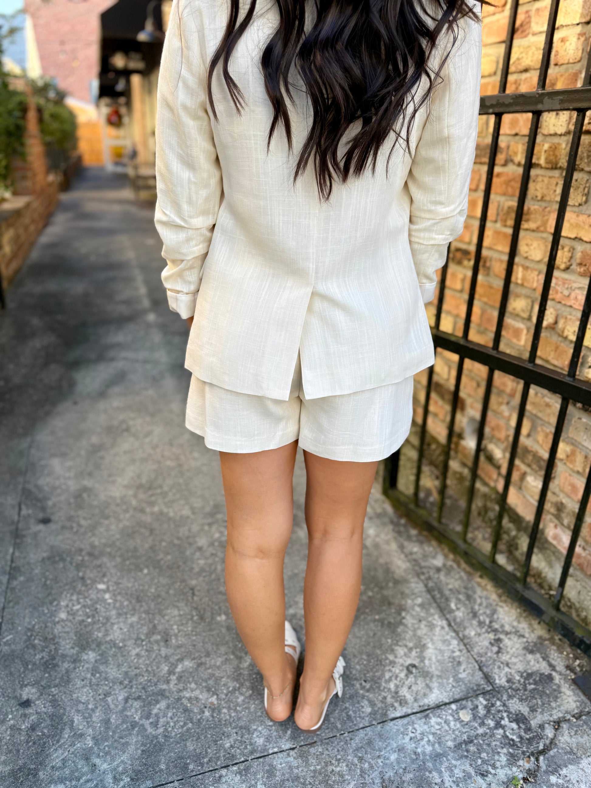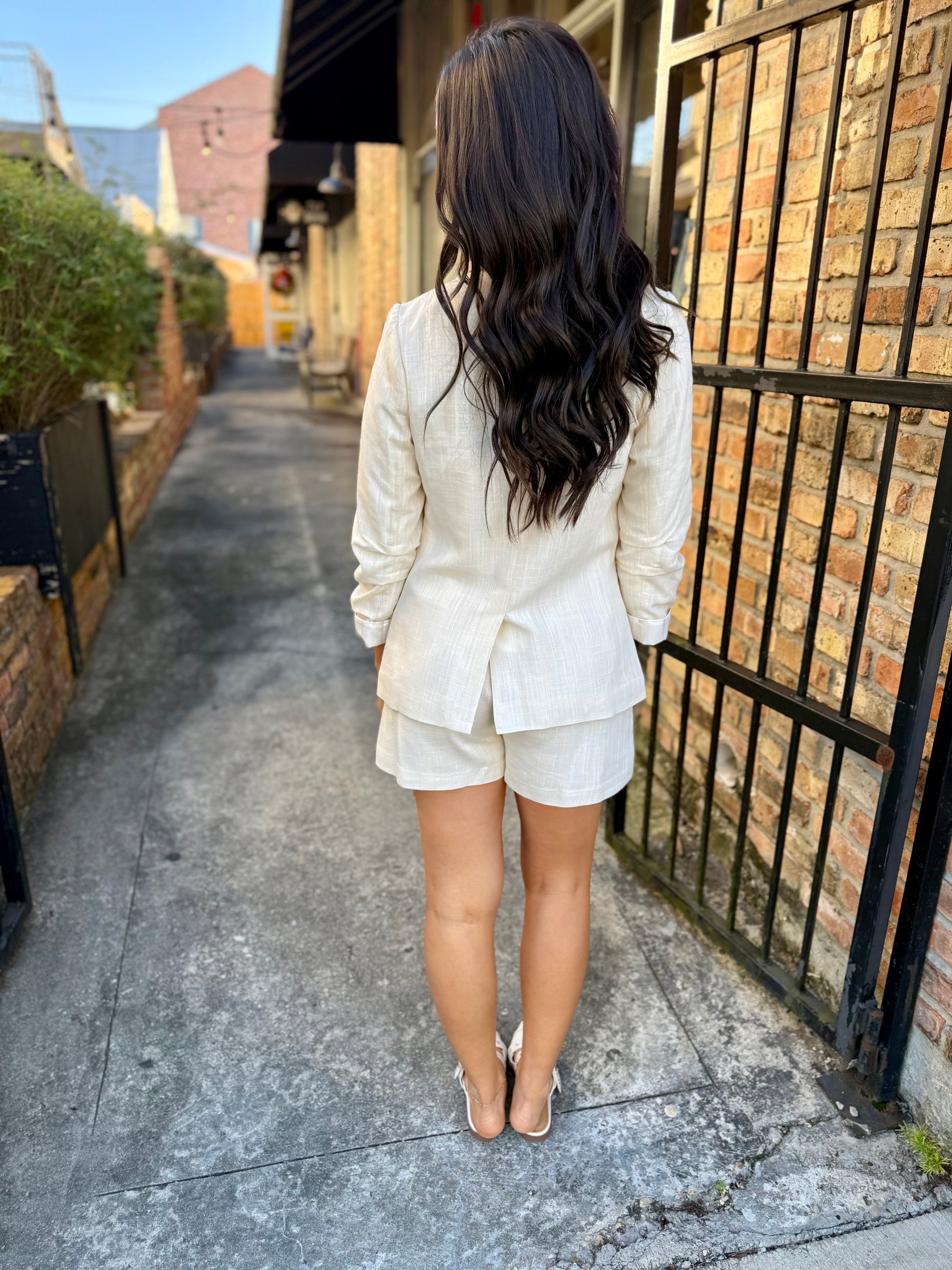Elevate your everyday style with the Liam Blazer in Ecru—where polished meets playful. This tailored linen blend beauty features cinched sleeves that bring modern edge to a timeless silhouette, while the soft woven blend keeps things light and breezy. Single-button closure, notched lapels, and front pockets make it as practical as it is chic. Fully lined for comfort, it's your new go-to for looking put-together whether you're heading to the office or out for the evening. Dress it up with the atcing Liam Shorts or keep it casual with jeans.
