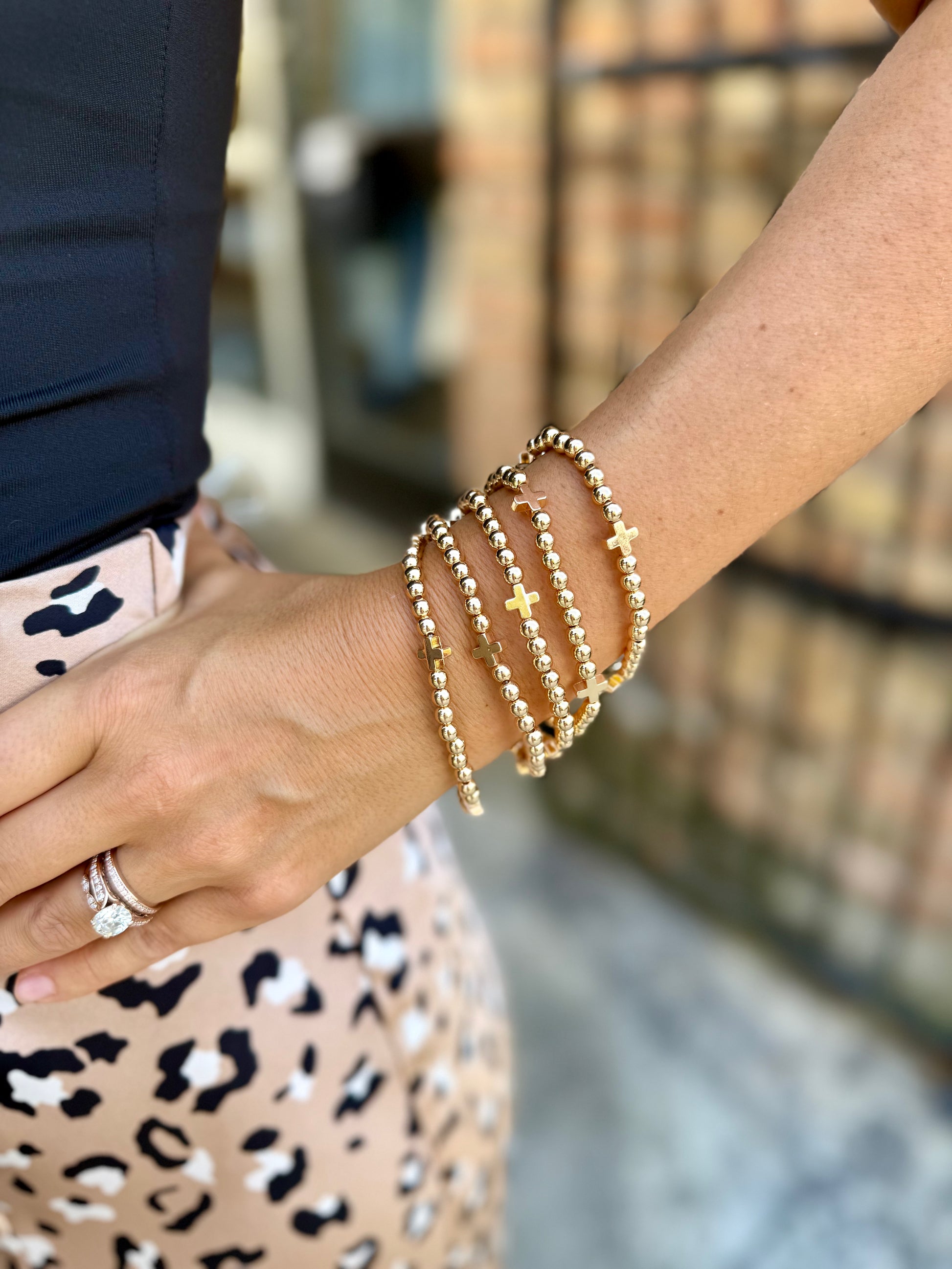 Elevate your wrist game with the Longo 5 Row Cross Bracelets in gold. Combining shiny metal beads and a stretch design, this playful set slips on easily and stacks perfectly for a bold, fun look that moves with you.