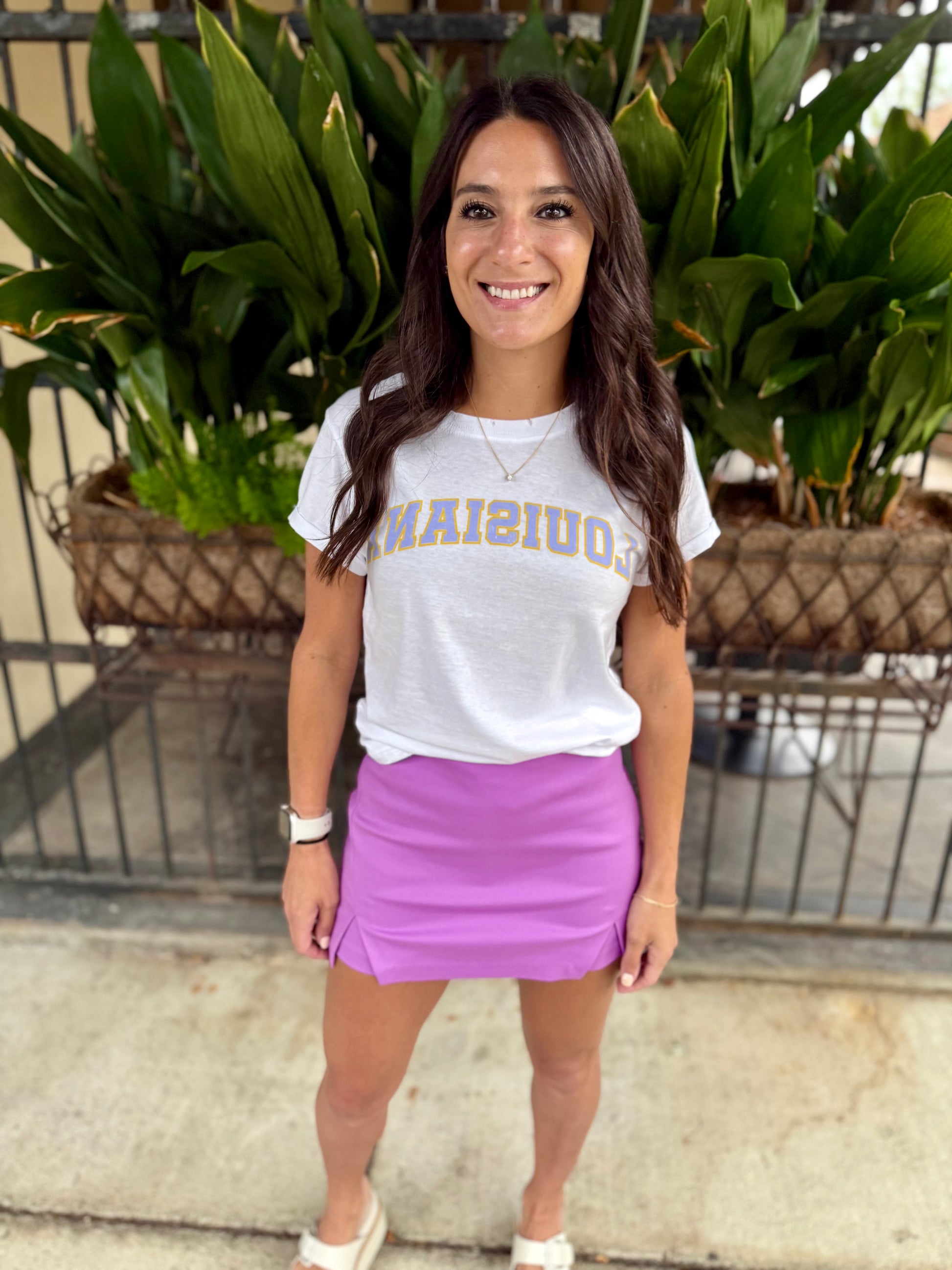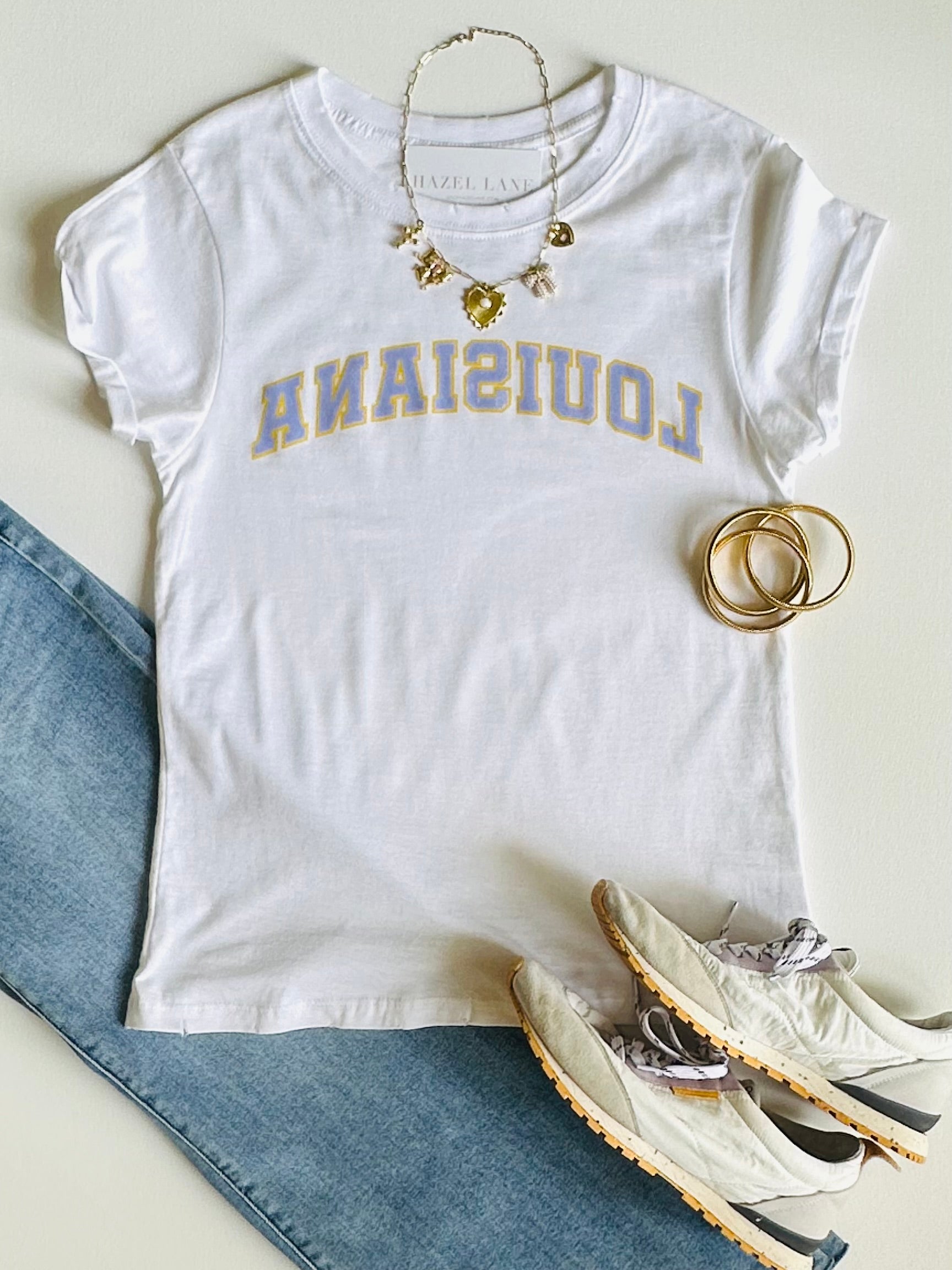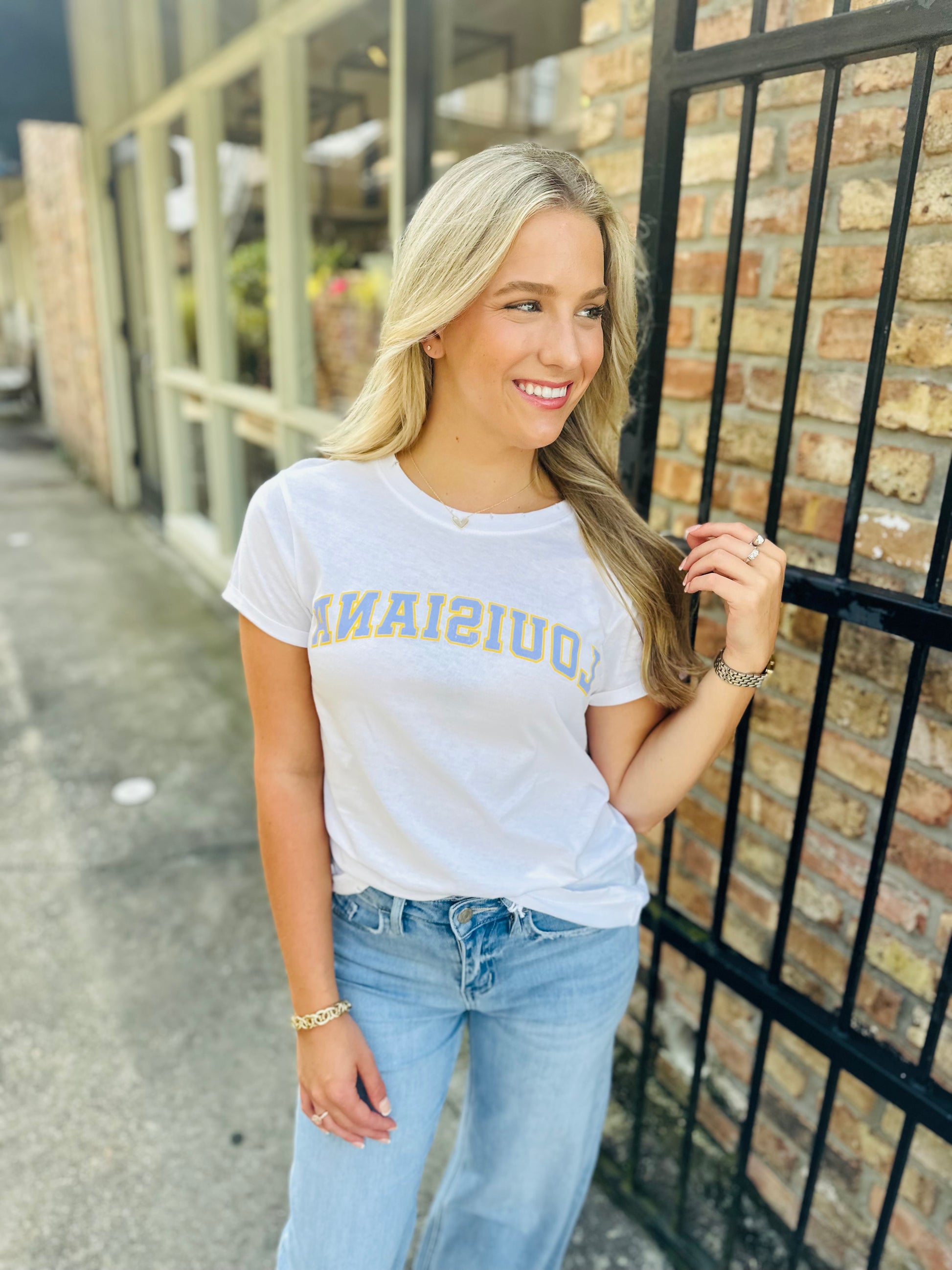 Show your Louisiana pride in style with this Louisiana Backwards Graphic Tee in crisp white. Crafted from super soft vintage-washed fabric, it offers a comfy, lived-in feel. Distressed edges and rolled short sleeves add a playful, worn-in vibe, while the ribbed crew neck keeps it classic. Perfect for LSU game day or casual outings, this tee brings purple and gold spirit with a fun twist.