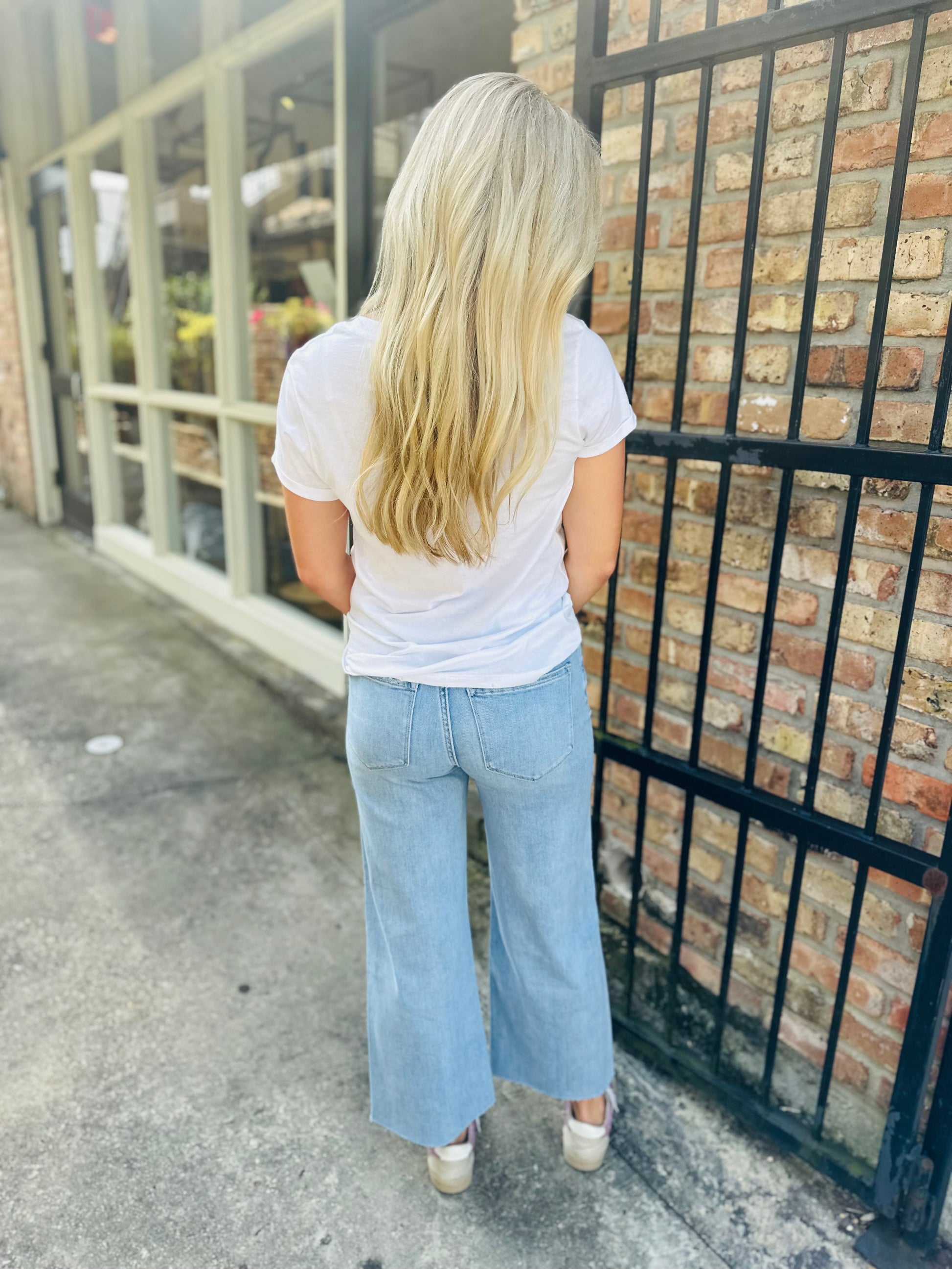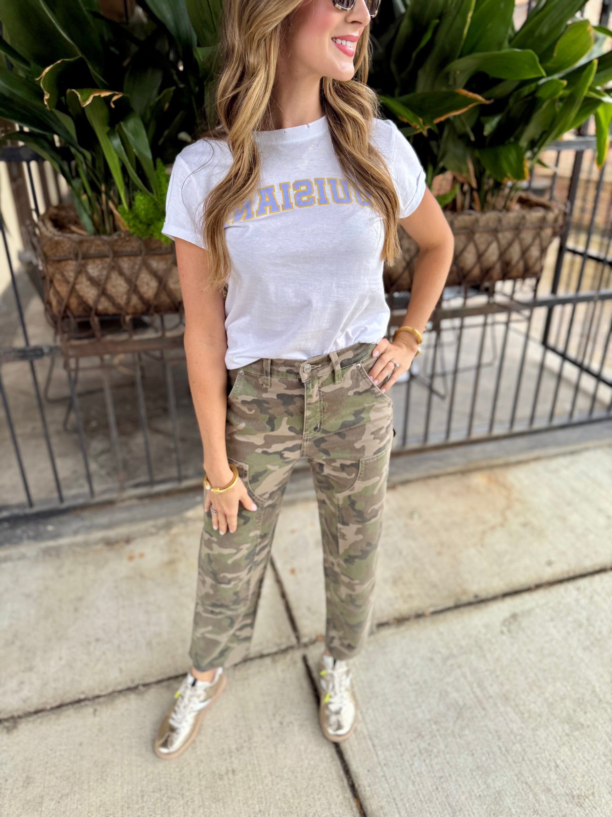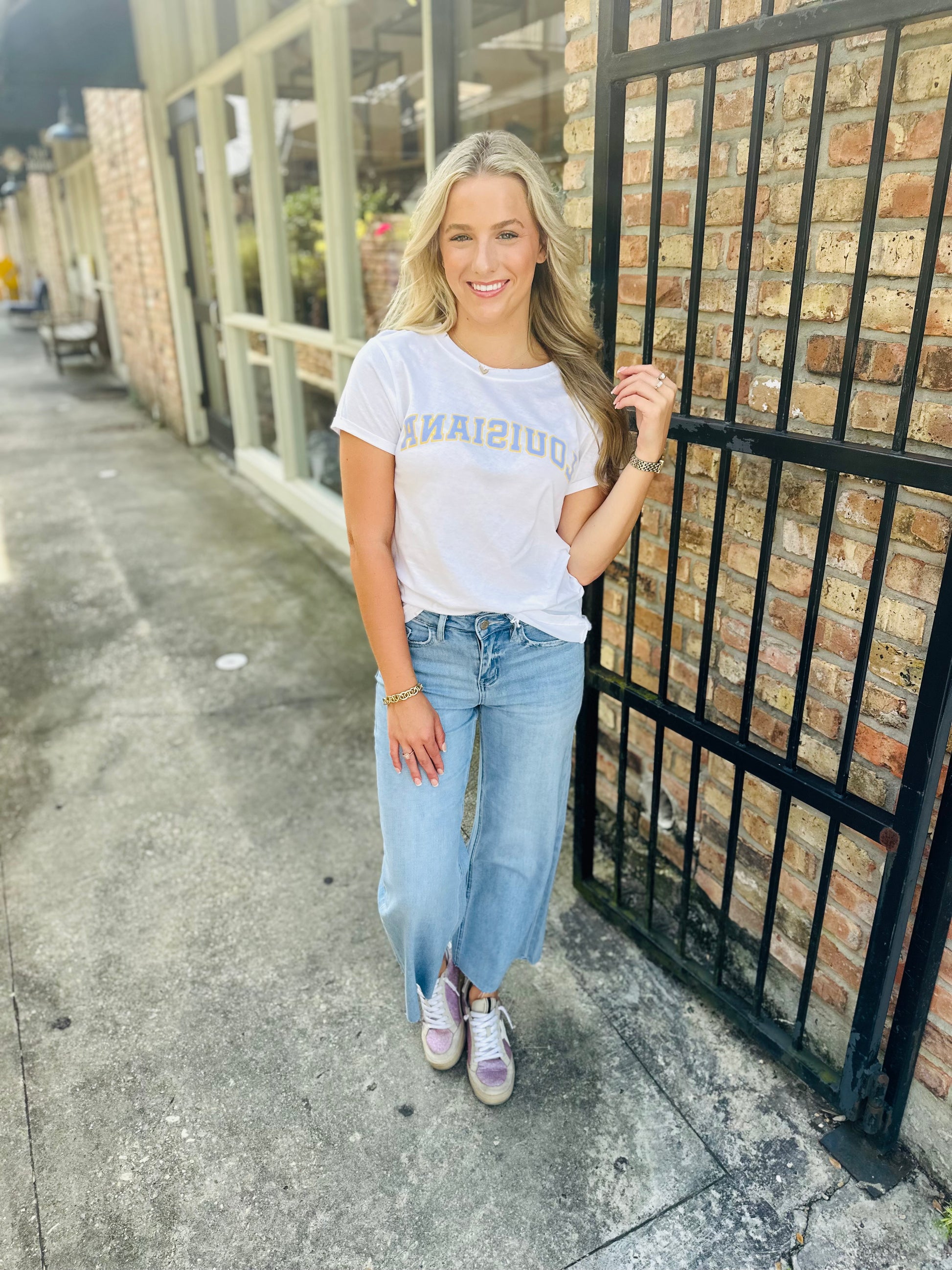 Show your Louisiana pride in style with this Louisiana Backwards Graphic Tee in crisp white. Crafted from super soft vintage-washed fabric, it offers a comfy, lived-in feel. Distressed edges and rolled short sleeves add a playful, worn-in vibe, while the ribbed crew neck keeps it classic. Perfect for LSU game day or casual outings, this tee brings purple and gold spirit with a fun twist.