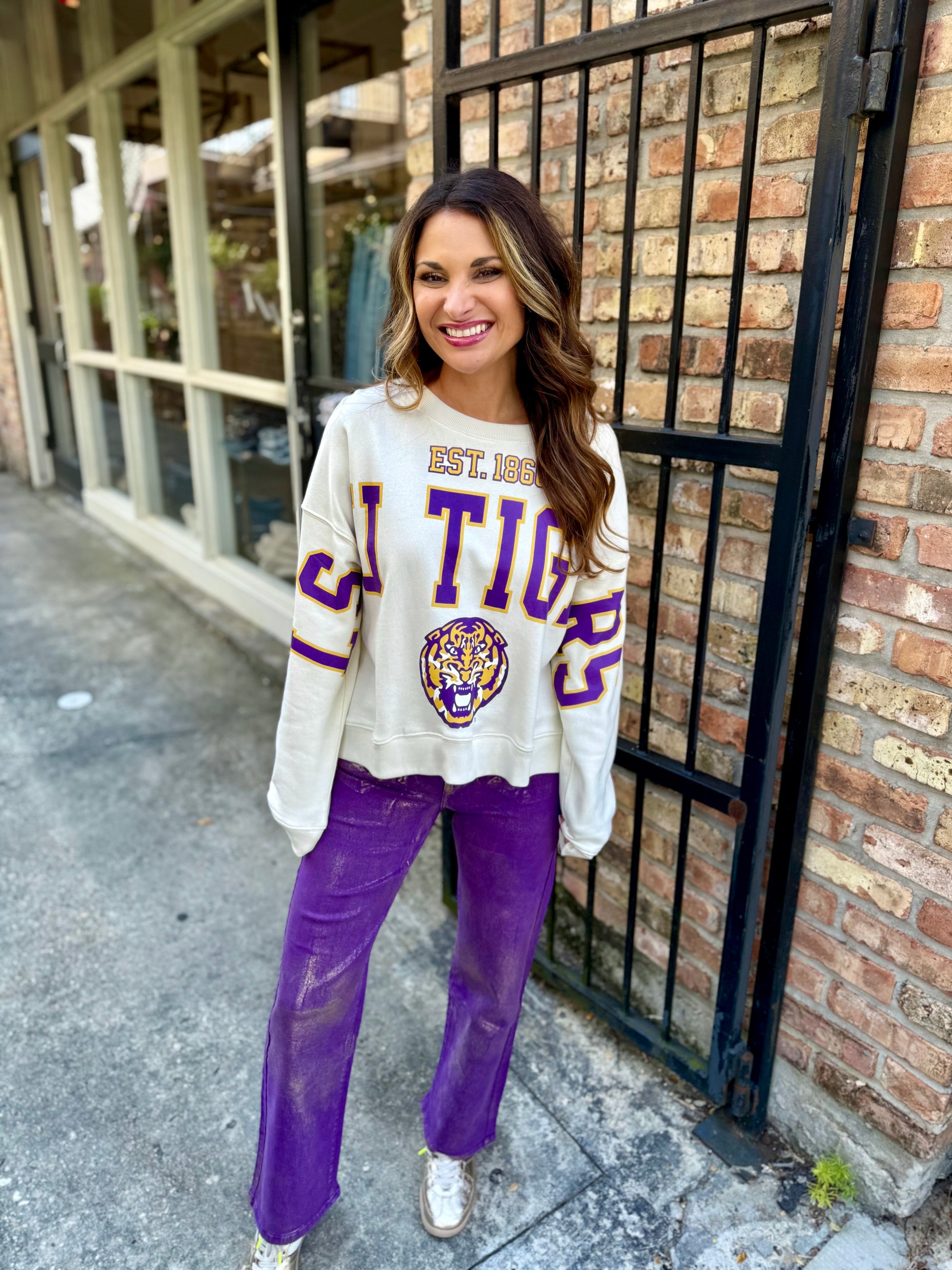 Bold graphics meet a modern silhouette in this sweatshort. Oversized in the best way, this cotton fleece crewneck delivers collegiate cool with an edge. Designed with dropped shoulders and a slightly cropped, boxy fit, it features oversized screen prints at the chest and sleeves.