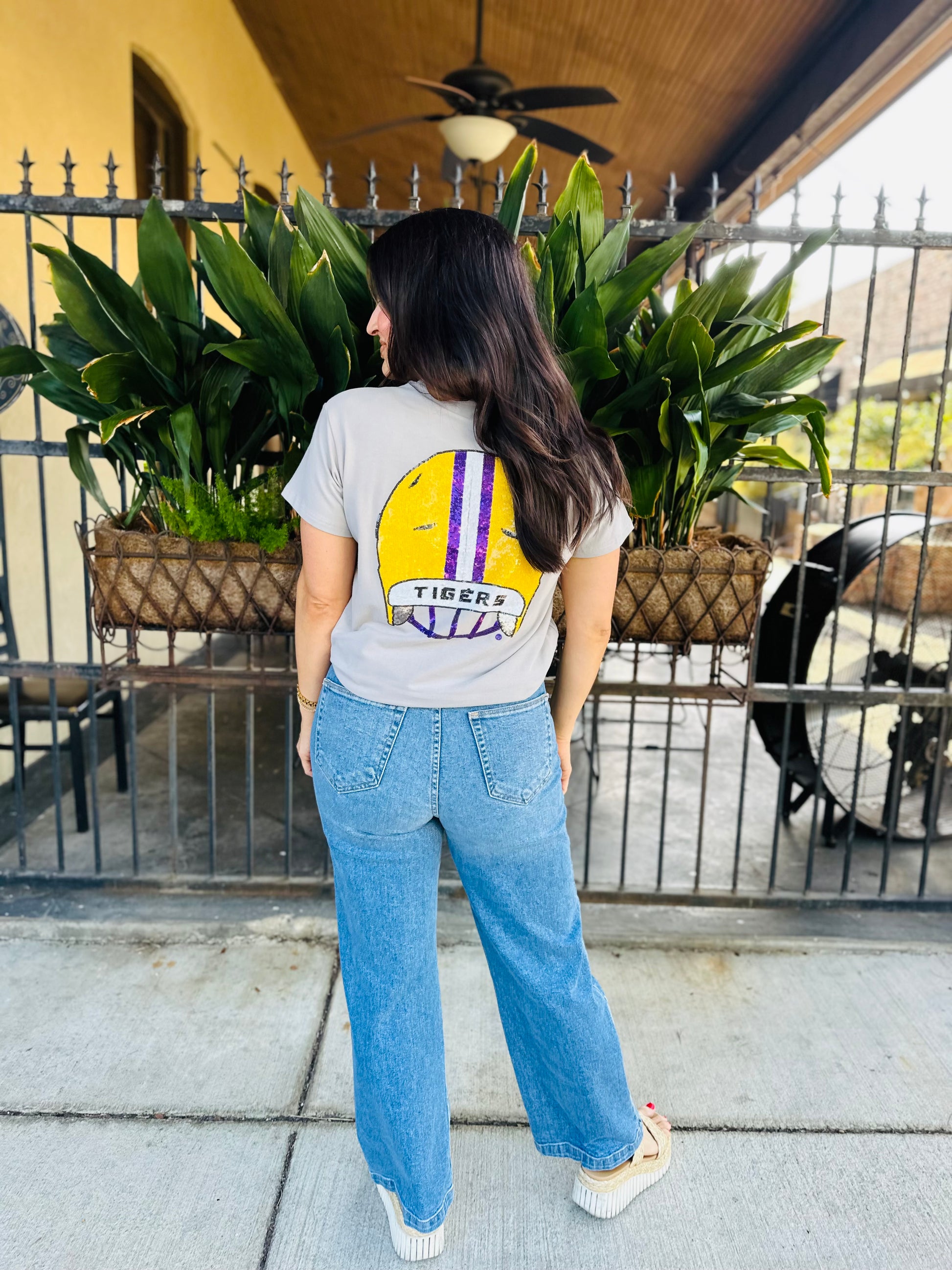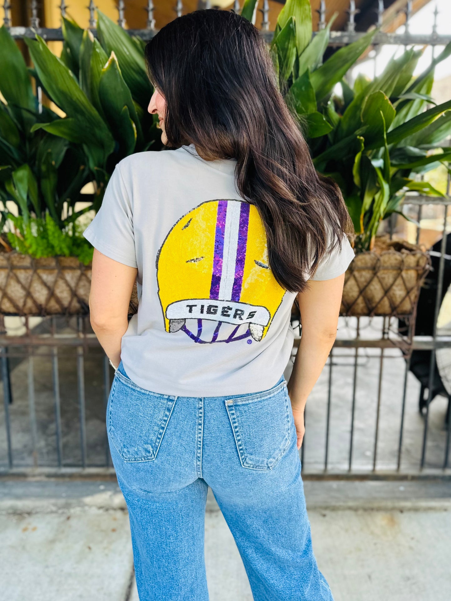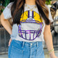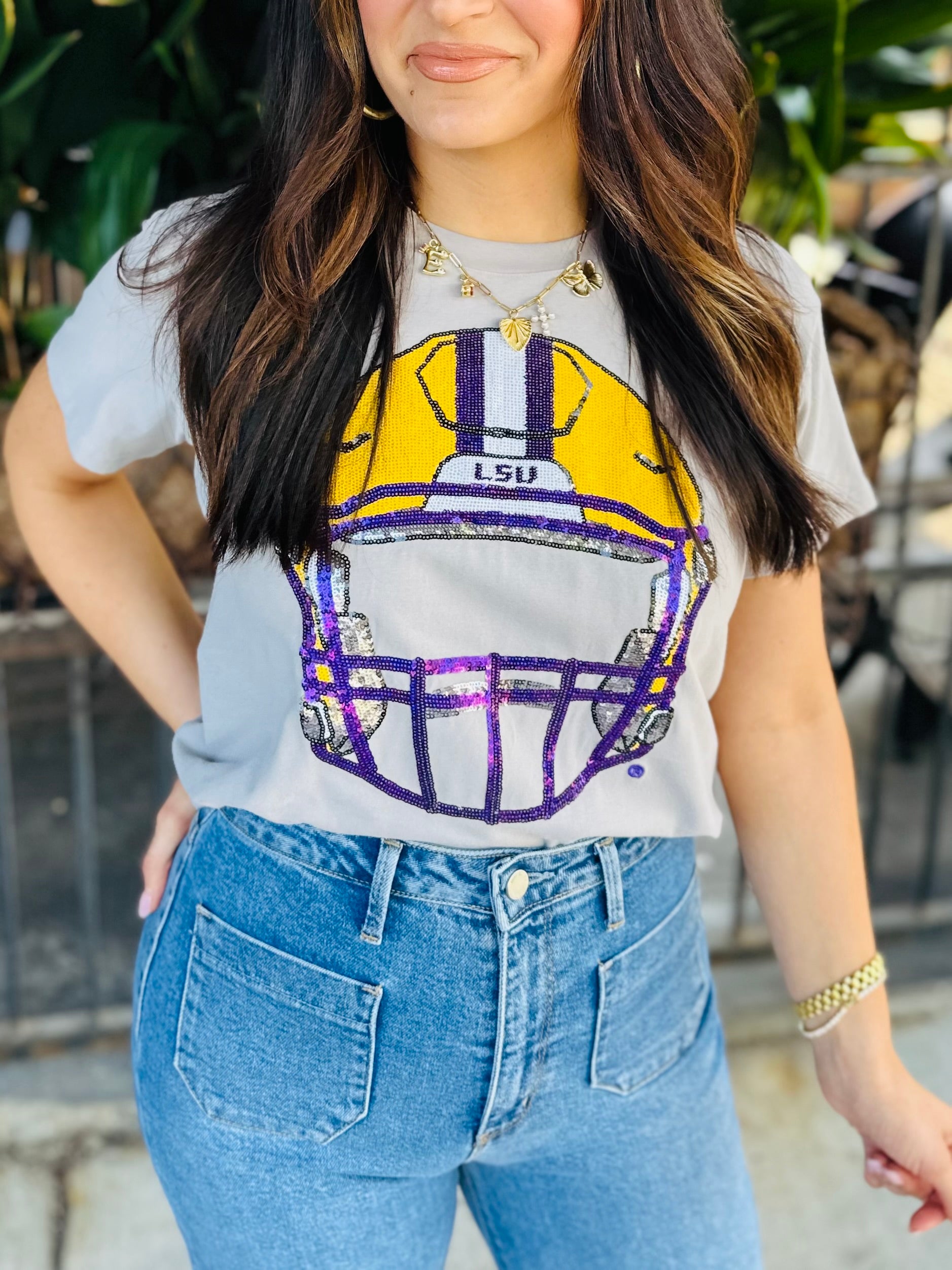 Show your LSU pride with this playful gray tee featuring a shimmering LSU helmet on the front and a cool back view of the helmet on the back. Perfect for game days, it’s a fun way to celebrate your Tigers spirit in style.