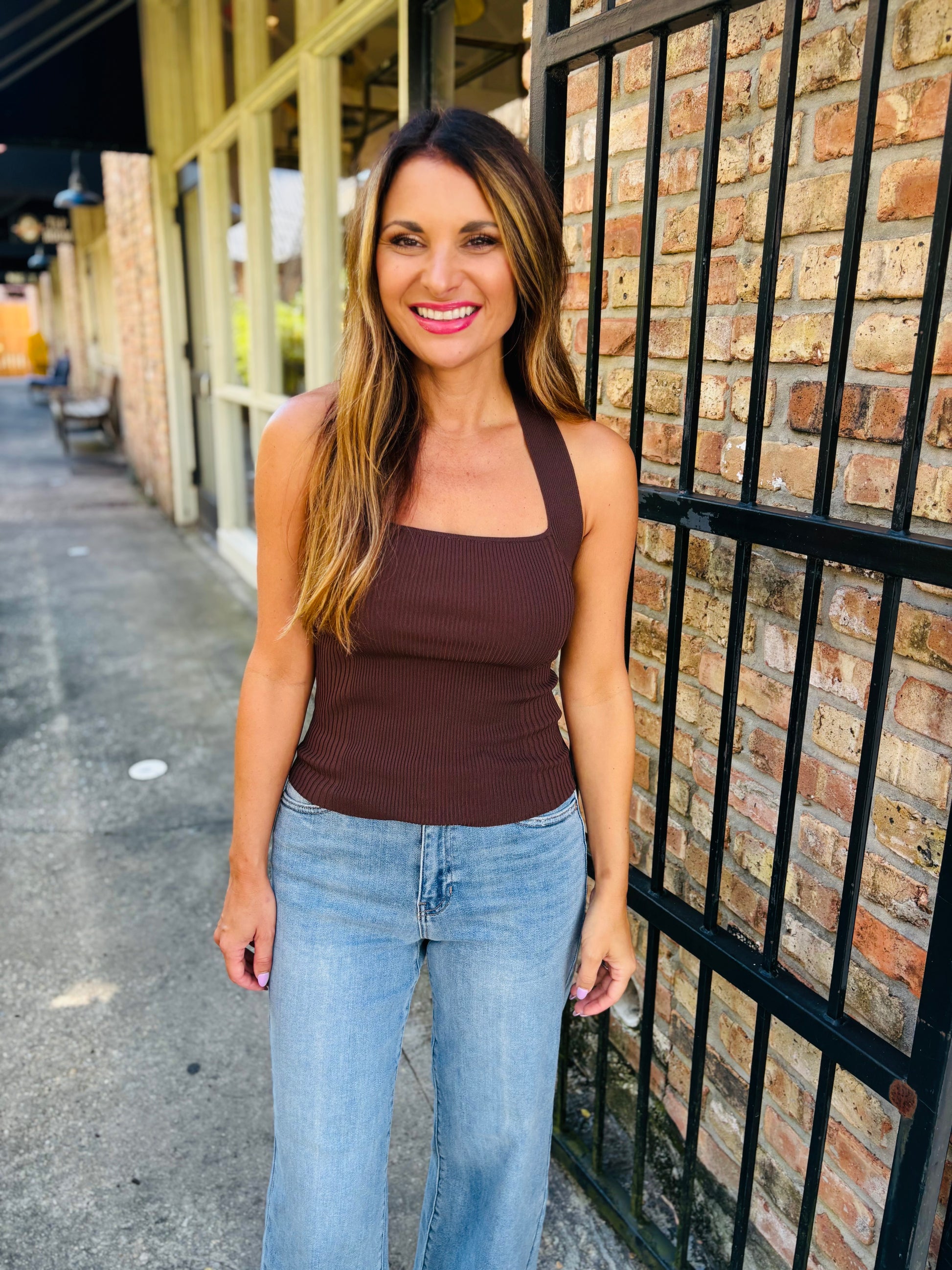 This brown halter knit top features a flattering square neckline that adds a touch of charm to your look. Its playful design makes it perfect for sunny days or casual outings, combining comfort with style effortlessly. Pair it with your favorite jeans or skirt for an easy, chic outfit.