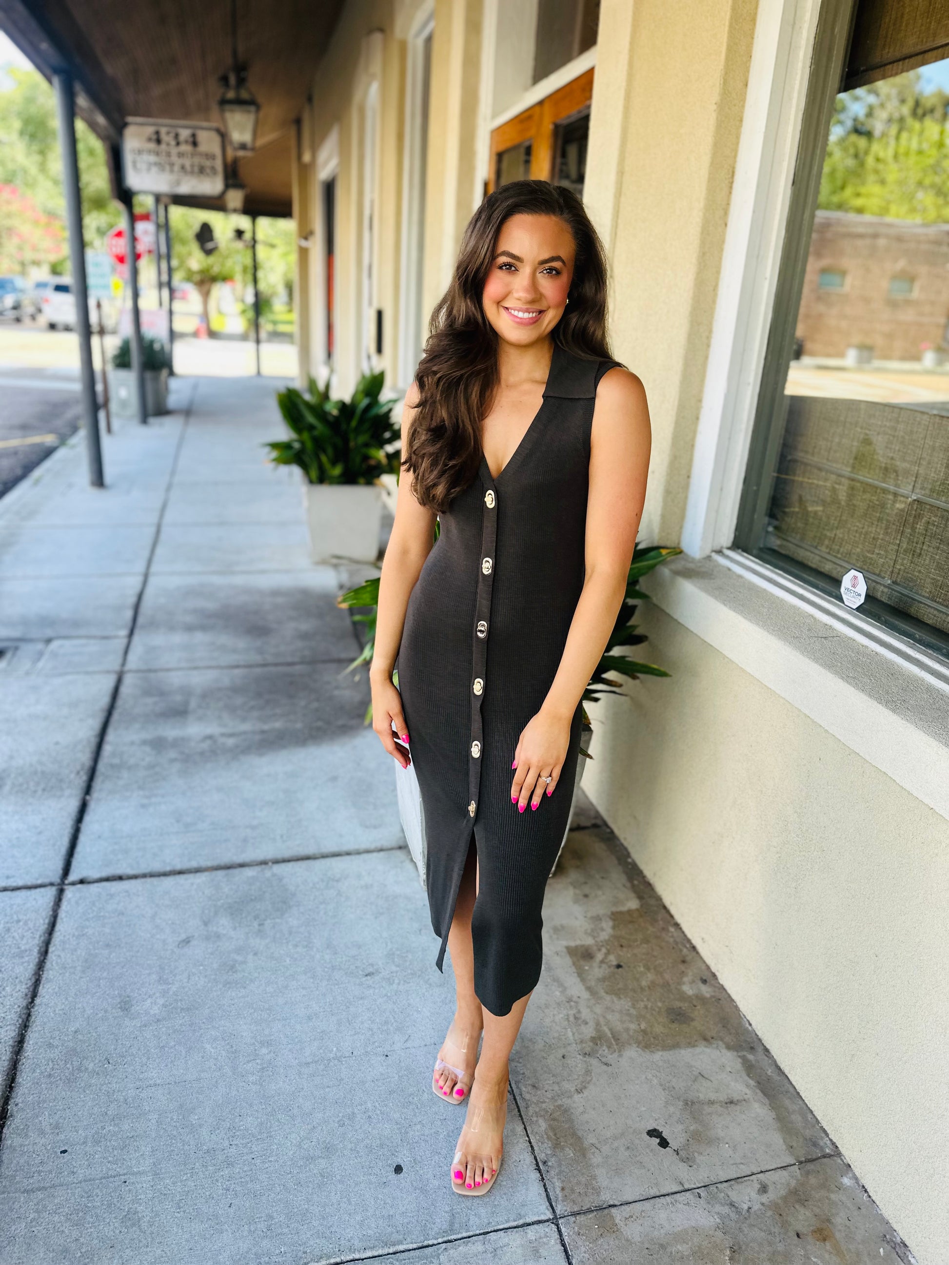 Step into effortless style with the Mallory Midi Dress in Dark Olive. This sleeveless beauty features eye-catching gold twist lock buttons that add a fun, chic touch. Its flattering midi length makes it perfect for day-to-night adventures, while the rich olive shade brings a fresh, playful vibe to your wardrobe. Whether you're brunching with friends or dancing under the stars, this dress has you covered with a blend of comfort and flair.