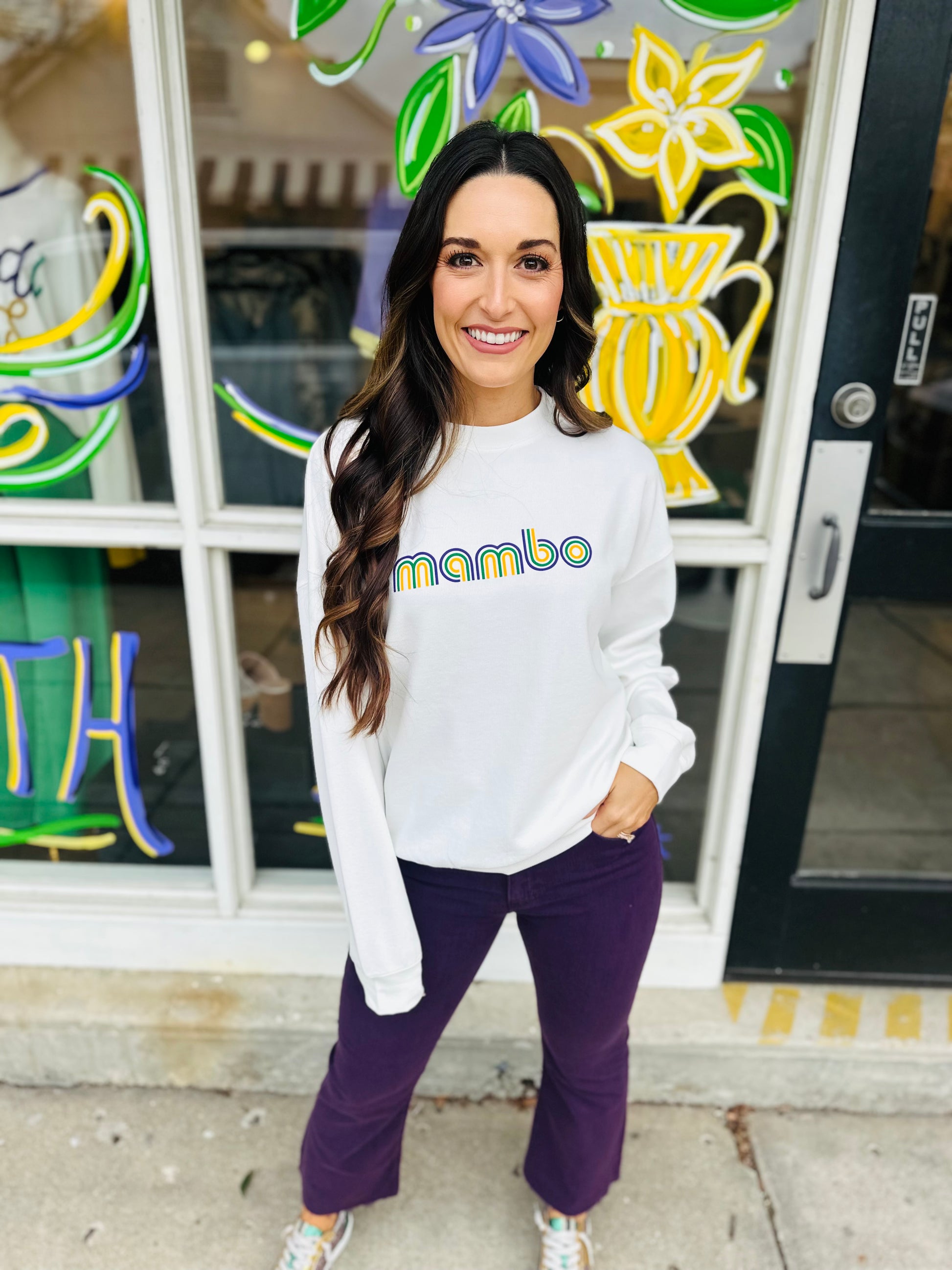 Get ready to party with the Mono Mambo Varsity Ribbed Sweatshirt! With a relaxed fit and ribbed details, this sweatshirt is perfect for a casual and comfortable Mardi Gras celebration. Let your inner fun shine through in this must-have white sweatshirt.