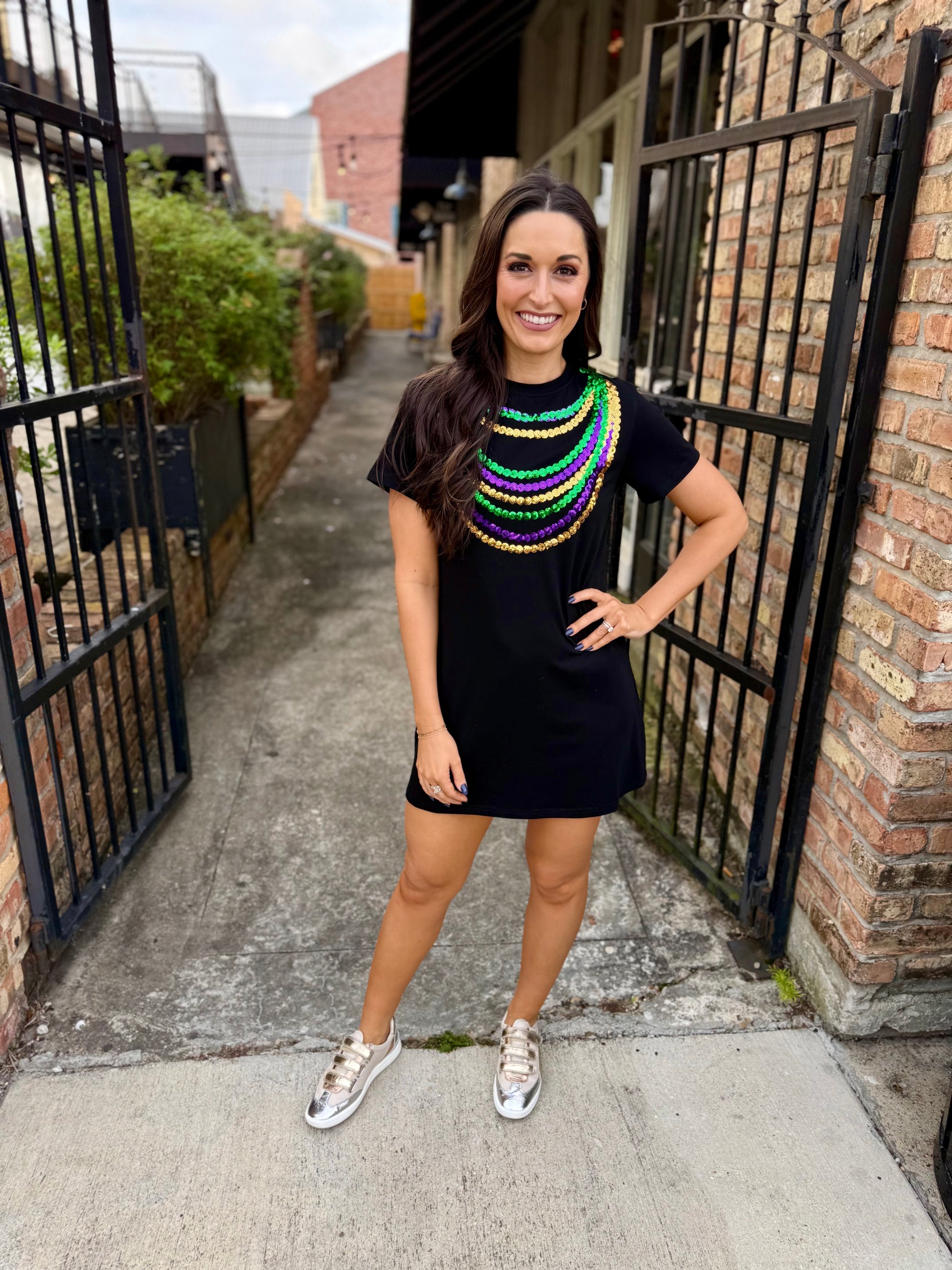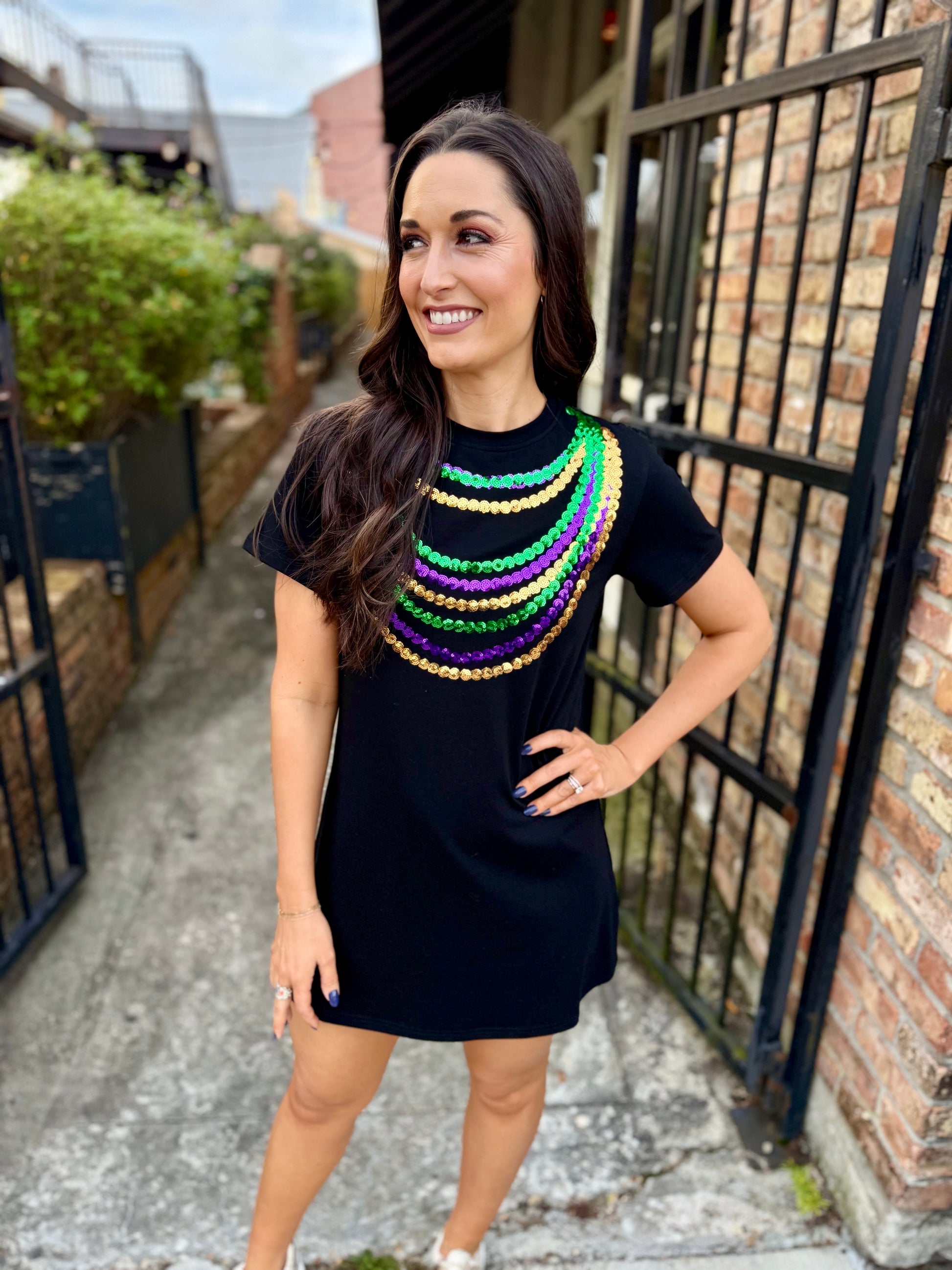Get ready to let the good times roll with our Mardi Gras Bead Dress! This super fun mini dress features a colorful bead necklace design made of sequins - perfect for standing out and having fun at any parade or Mardi Gras party. Grab yours now to complete your Mardi Gras look!