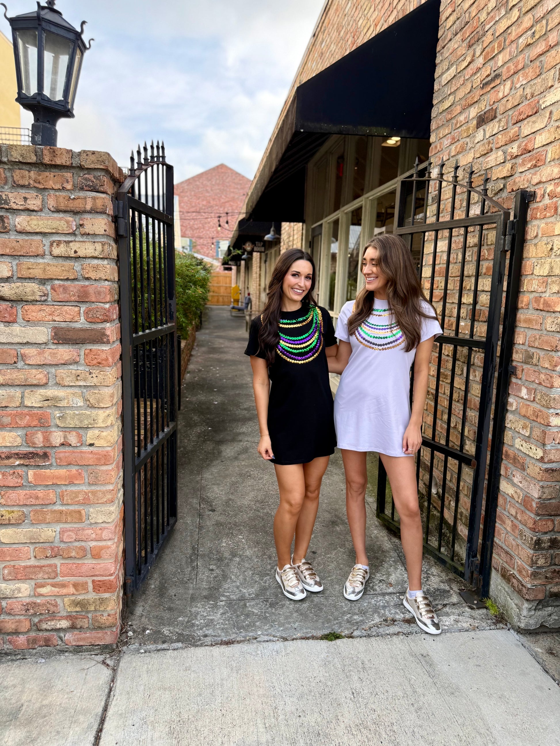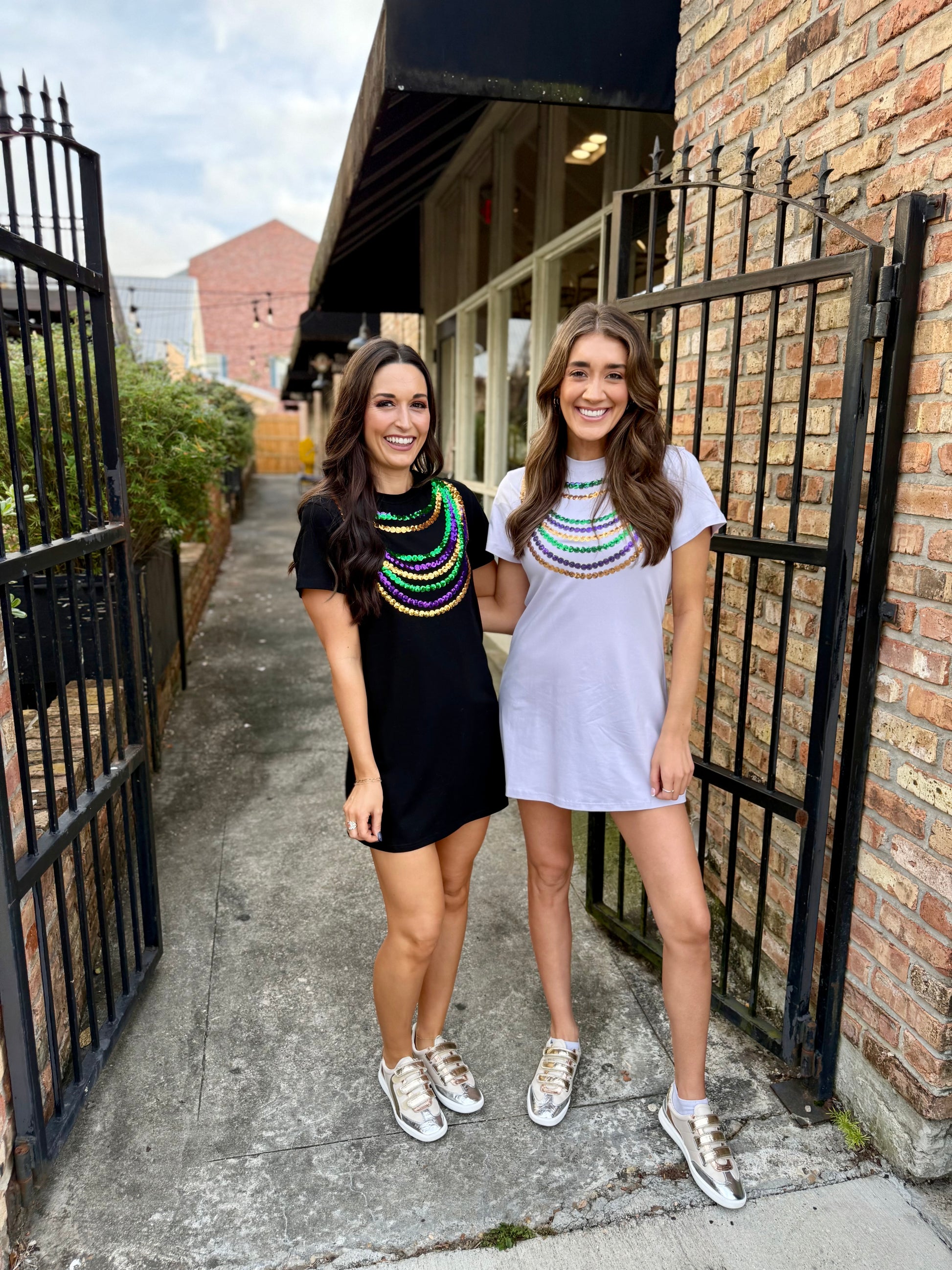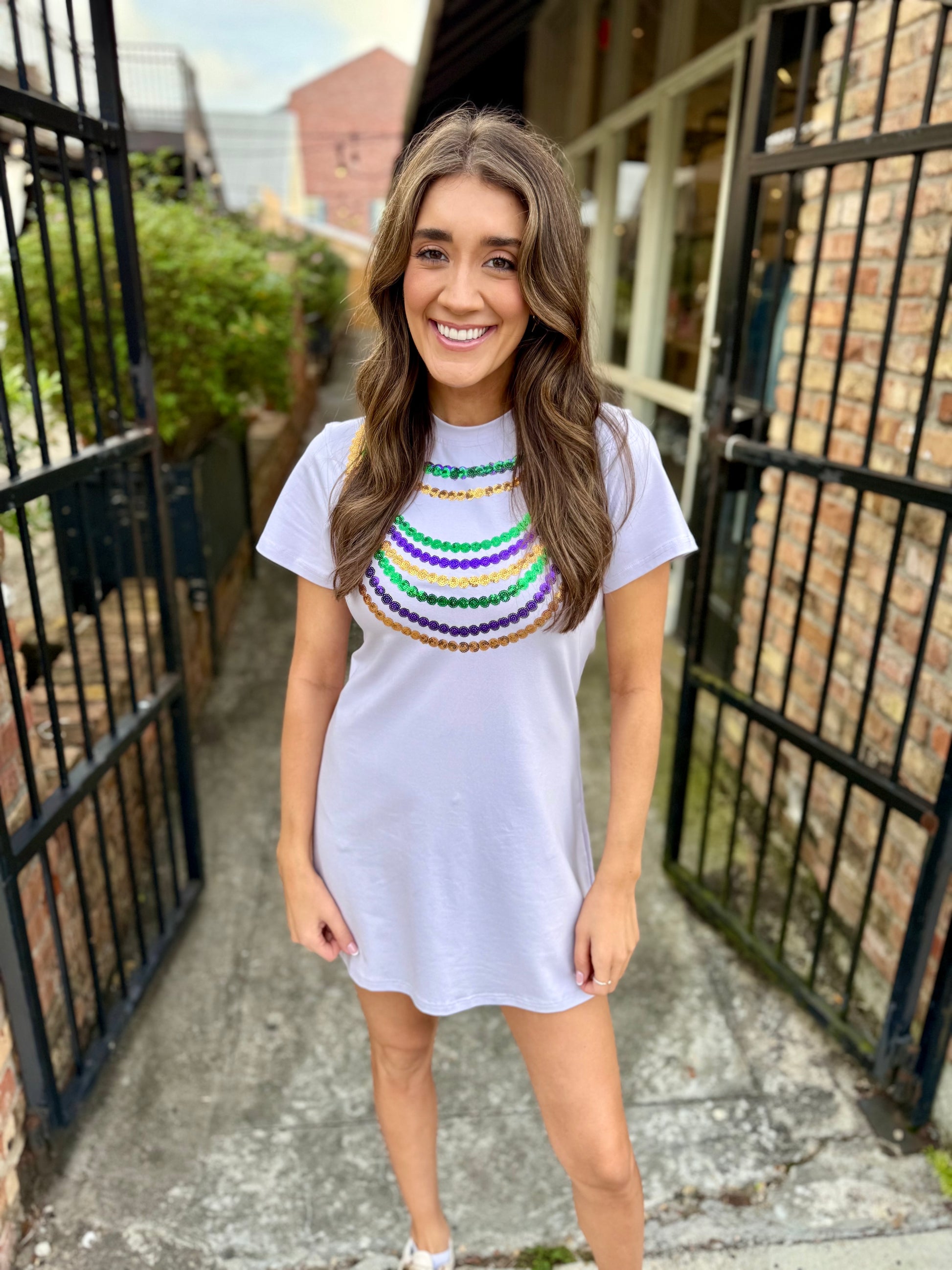 Get ready to let the good times roll with our Mardi Gras Bead Dress! This super fun mini dress features a colorful bead necklace design made of sequins - perfect for standing out and having fun at any parade or Mardi Gras party. Grab yours now to complete your Mardi Gras look!